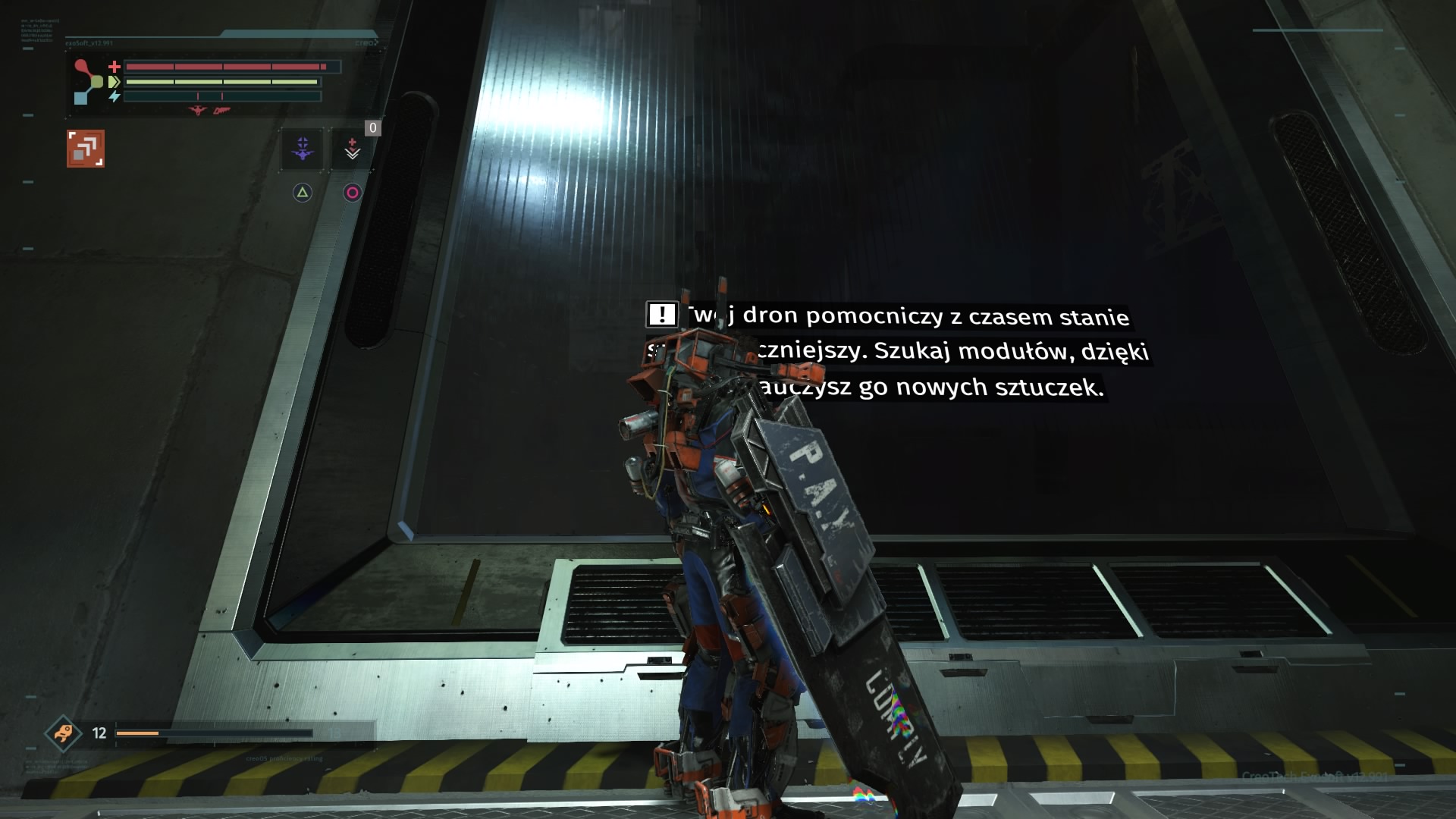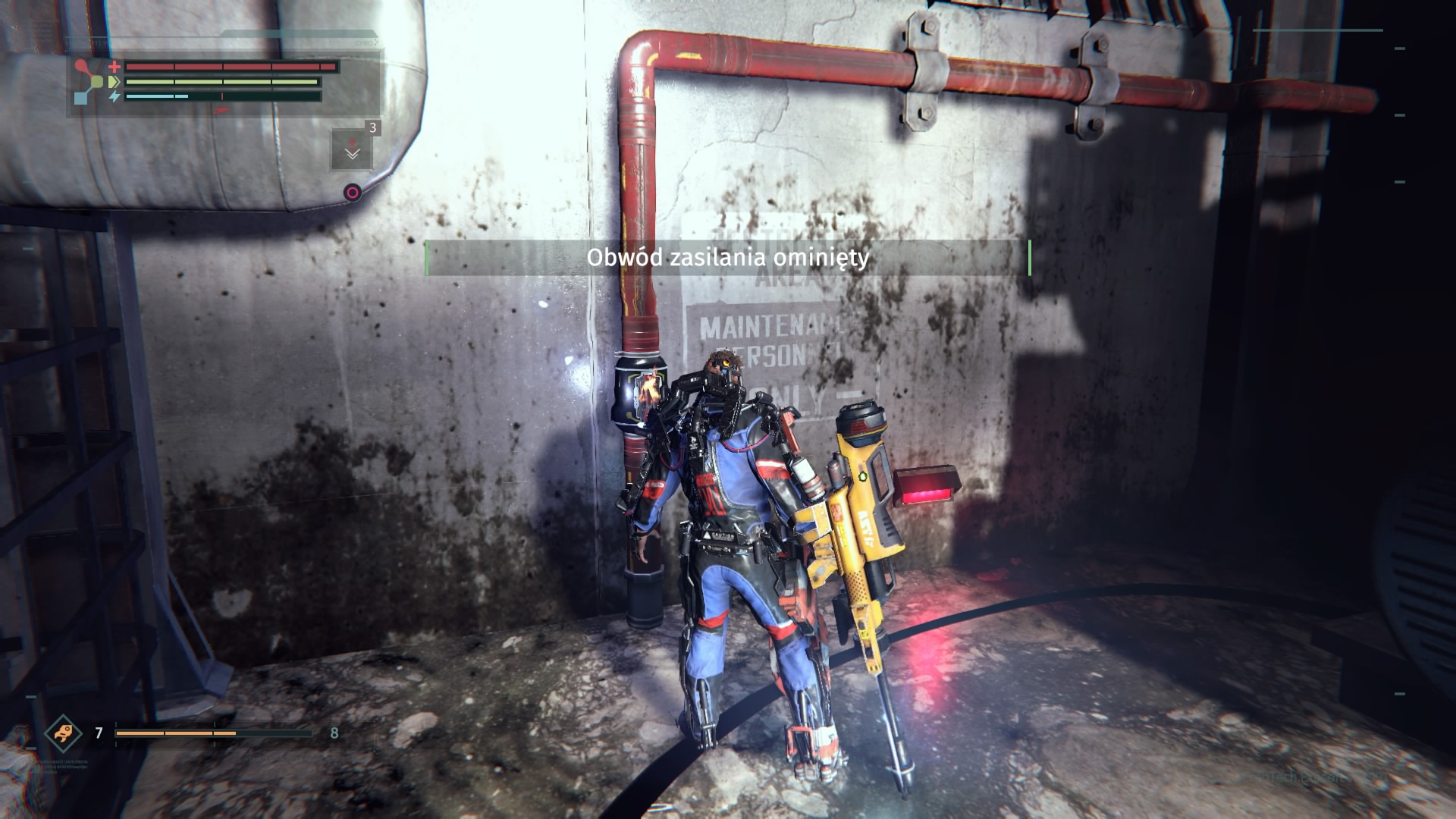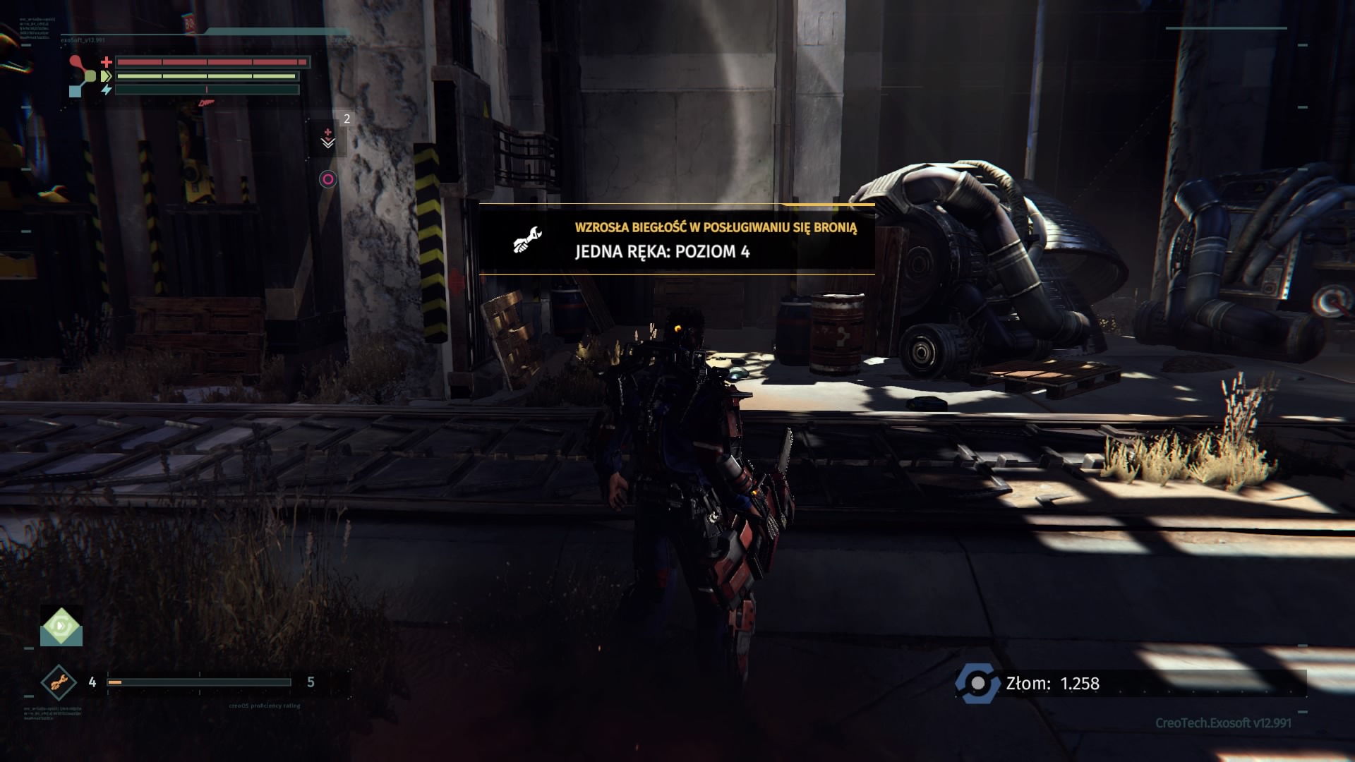 Historia w The Surge nie jest niestety wybitna. Stanowi zaledwie element spinający przechodzenie między lokacjami. Muszę przyznać, że mnie nie wciągnęła, a do grania w produkcję Deck13 skłaniała mnie mechanika rozgrywki. Ta bowiem naprawdę potrafi wciągać. Opisując ją, najlepiej określić ją jako przyszłościowe Dark Souls. Osoby, które spędziły godziny z wymienionym tytułem poczują się w The Surge jak w domu. Zostało tu zachowane niemal wszystko, czego doświadczaliśmy przy serii Dark Souls. Począwszy od wysokiego poziomu trudności. Należy się na to przygotować. The Surge nie prowadzi gracza za rączkę. Wymaga opanowania walki albo umiejętnego unikania ewentualnych zagrożeń, na które jesteśmy jeszcze nieprzygotowani. Przeciwnicy są w stanie jednym lub dwoma ciosami zabrać nam sporą część zdrowia, zwłaszcza na początkowych etapach. Musimy więc rozwijać postać. Dokonujemy tego na dwa sposoby. Pierwszym z nich jest rozwijanie rdzenia egzoszkieletu. Można go określić jako swego rodzaju poziom postaci. Części złomu, które znajdujemy jako wolno-leżące znajdźki i elementy wypadające z pokonanych oponentów służą nam do zwiększania poziomu rdzenia Warrena (jedynie w centrum medycznym) oraz tworzenia i ulepszania wyposażenia – broni, korpusu, rąk, nóg i tak dalej. Większy poziom rdzenia pozwala montować implanty (stałe bonusy postaci) i przeciążać bardziej wymagające obwody zabezpieczeń, otwierając nam wejście do nowych lokacji. Jak wspomniałem, w grze występuje także system wytwarzania przedmiotów. Posiadając odpowiedni schemat (odnajdywany na zasadzie takiej, jak sprzęt) jesteśmy w stanie stworzyć lepszy oręż, czy uzbrojenie. Trzeba jednak mieć do tego odpowiednią liczbę określonych części mechanicznych i zwykłego złomu. Ten ostatni stanowi w The Surge walutę. Każda śmierć Warrena pozbawia go zdobytych do tej pory, nie zdeponowanych części złomu. Po odrodzeniu się w centrum medycznym mamy kilka minut na dotarcie do punktu, w którym zginął i odzyskanie waluty.