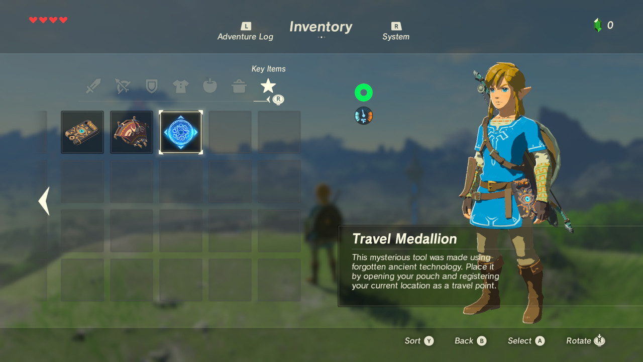 - Travel Medallion: Gdzieś w świecie gry ukryta zostanie nowa skrzynia ze skarbem, w której znajdzie się Travel Medallion. Z tym medalionem gracze mogą stworzyć tymczasowy punkt podróży na mapie, w miejscu, w którym obecnie stoją. Link może dzięki niemu przenieść się w to miejsce, kiedy znajdzie taka potrzeba. Jednocześnie na mapie można zarejestrować jedynie jeden punkt podróży za pomocą Travel Medallion.
