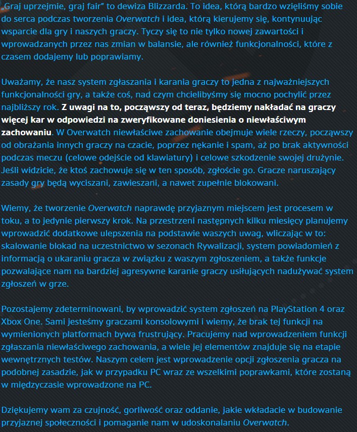 Na forum BattleNetu pojawił się dzisiaj interesujący wpis dotyczący Overwatch. Bllizard nie zamierz tylko rozbudować system zgłaszania i karania graczy na PC, ale także wkrótce wprowadzi go na konsolach.