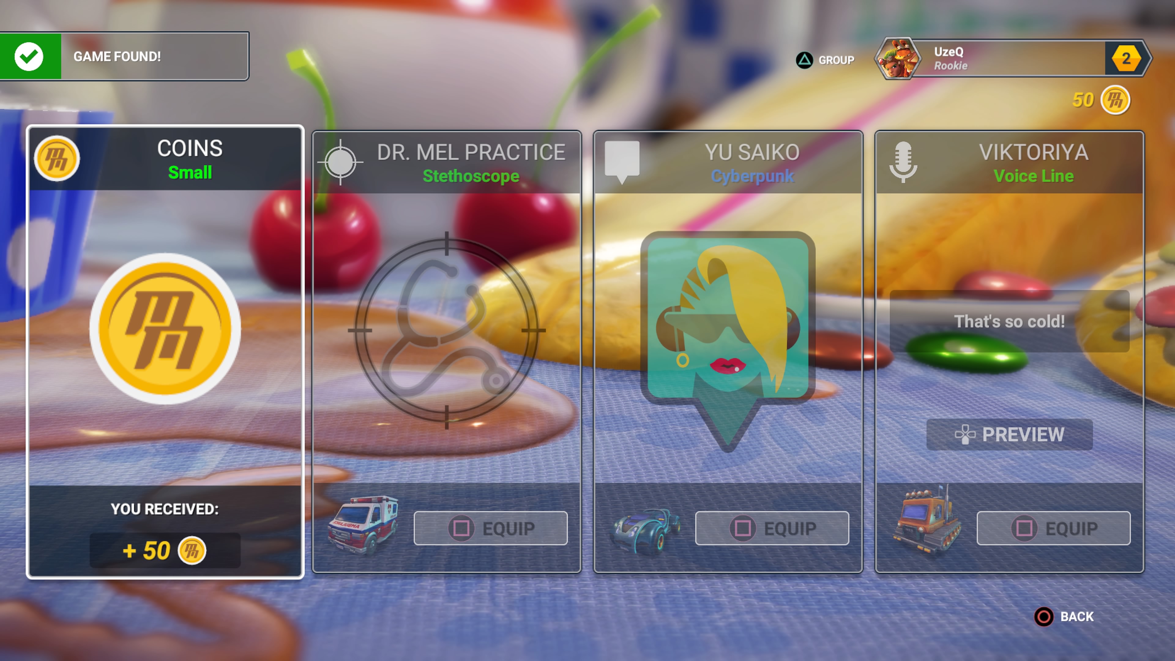 Za rozegrane mecze zdobywamy doświadczenie i awansujemy na wyższe poziomy. Nie mogło tutaj też zabraknąć skrzynek z ekwipunkiem. Znajdziemy w nich nowe stroje, kolory, głosy i inne elementy, którymi możemy nasze pojazdy wyróżniać. Paczki zdobywamy jedynie poprzez zdobywanie punktów w grze, na razie nie można ich kupować za pieniądze.