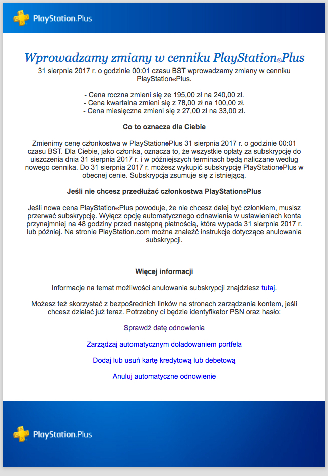 Stało się to, co wielu przeczuwało od dawna. Sony postanowiło podnieść cenę abonamentu PlayStation Plus. Tylko do końca sierpnia będziemy mogli kupować abonament w starych cenach. Od września bowiem ceny wzrosną. Szczegóły znajdziecie pewnie również na własnych skrzynkach mailowych.