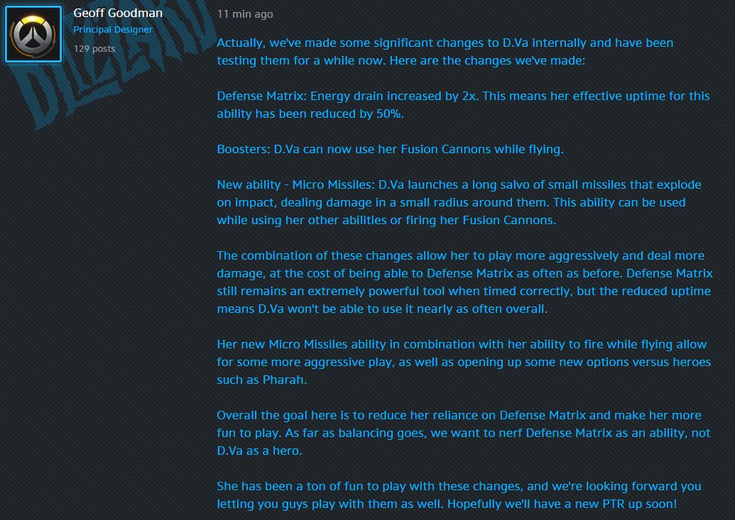 Informacja pojawiła się na forum Battle.netu, a udzielił jej Geoff Goodman, jeden z głównych Designerów Overwatch