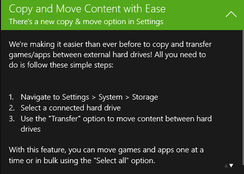 Przed instalacją najnowszej aktualizacji z programu Insider pojawia się powiadomienie przygotowujące właściciela konsoli na zmiany. Jeden z komunikatów mówi o wprowadzeniu szybszej wymiany plików między wewnętrznym, a zewnętrznym dyskiem twardym, ale drugi jest ważniejszy.