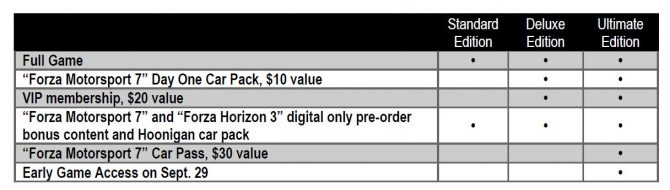 Podstawowa wersja nie ma w sobie żadnych bonusów, te zaczynają się od edycji Deluxe, która będzie zawierać paczkę samochodów Day One, która osobno ma kosztować 10$, członkostwo VIP i paczkę aut Hoonigan, które będą również dostępne w Forza Horizon 3. Wersja Ultimate oprócz zwartości z Deluxe otrzyma przepustkę samochodową i wcześniejszy dostęp do gry.