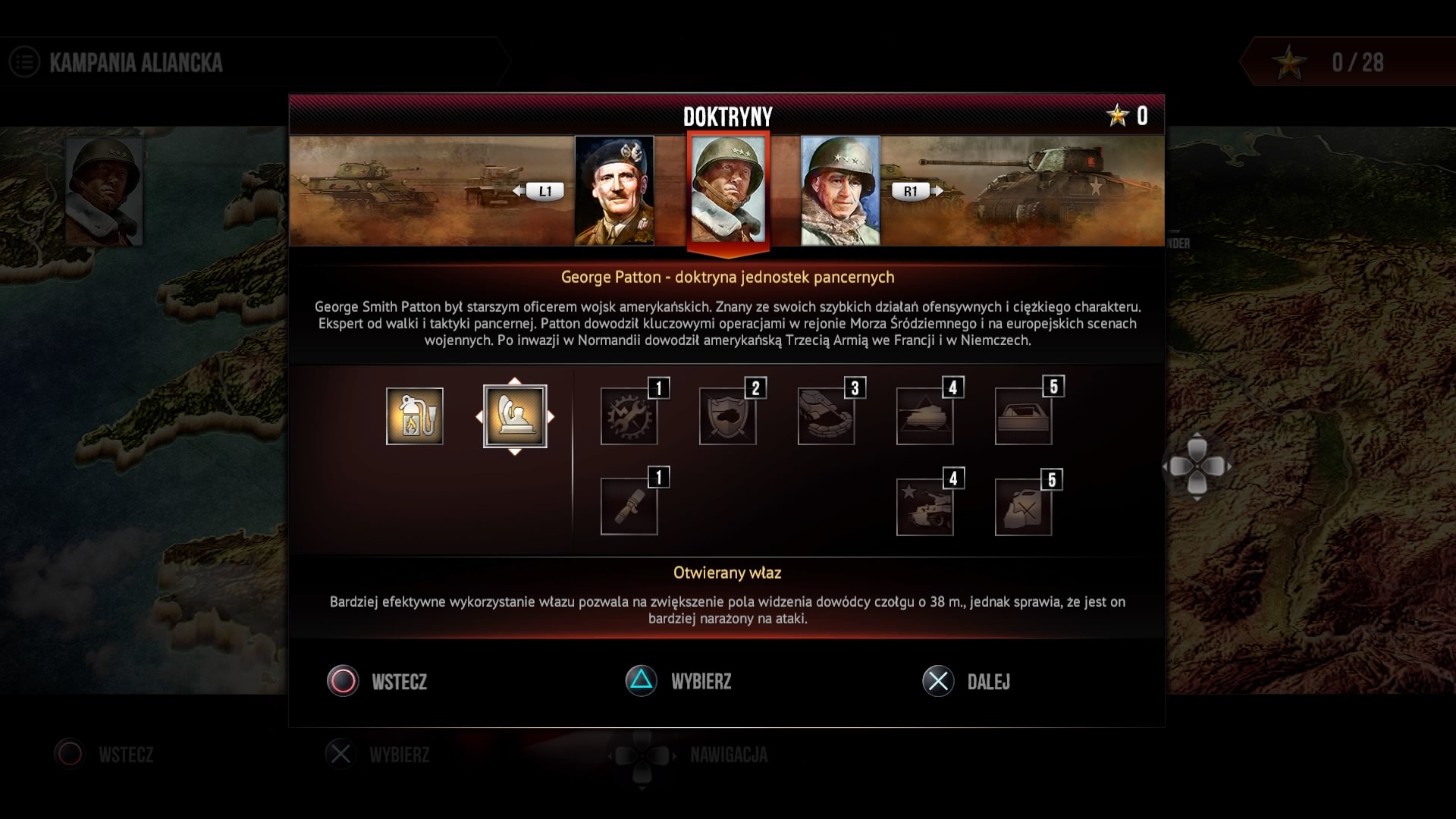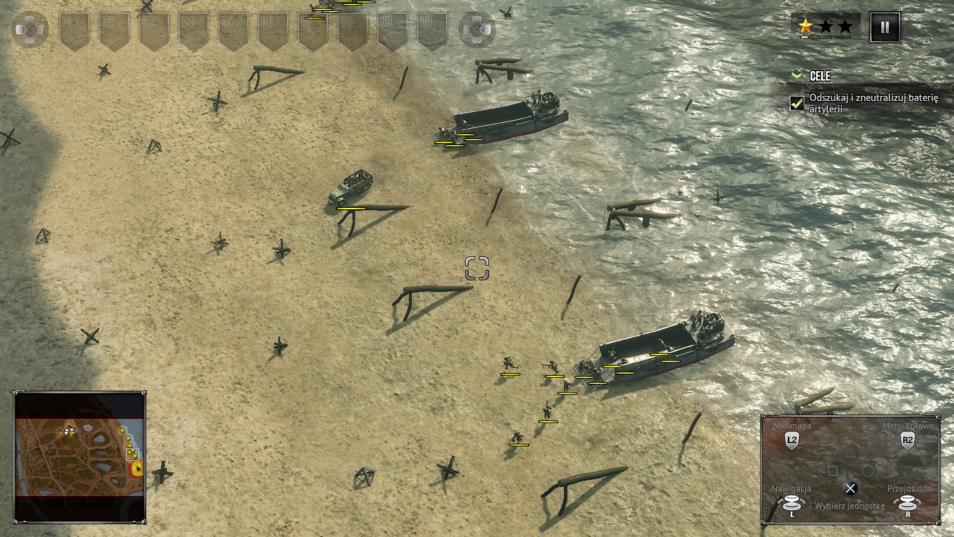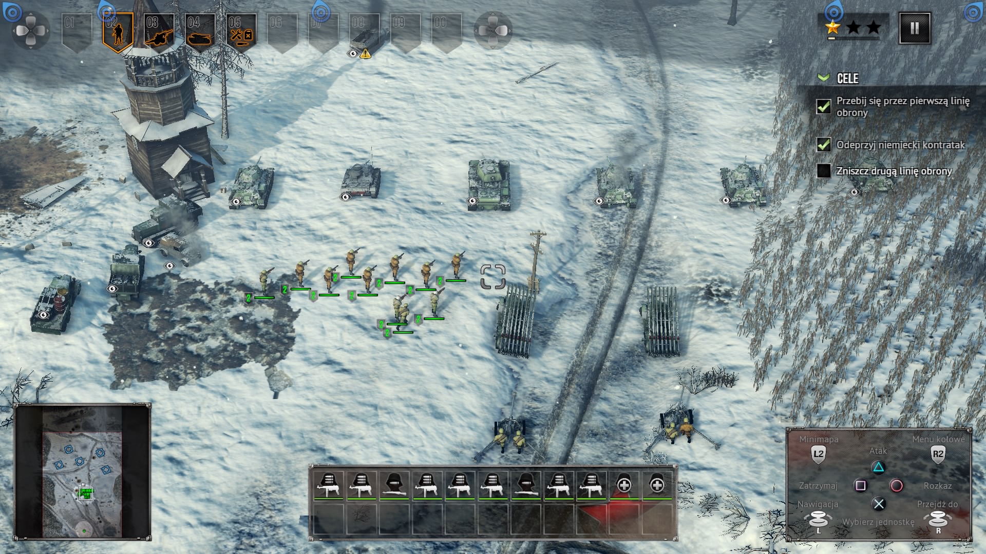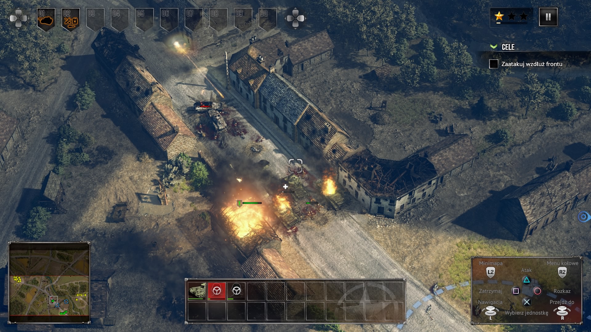 Zaznaczone jednostki możemy przypisywać do jednej z dziesięciu grup. Aby to zrobić, należy przy zaznaczonych jednostkach wcisnąć prawy analog. Między grupami przełączamy się korzystając z D-Pada. Rozkazy wydajmy naciskając kółko, a polecenie zatrzymania jest pod kwadratem. Pod R2 mamy menu kołowe dla wybranych jednostek. Dla piechoty możemy tam znaleźć rzut granatem, a dla czołgu otwarcie włazu, co spowoduje powiększenie obszaru, który widzimy. Dodatkowo, o ile czołg na to pozwala, możemy wybrać, aby się okopać, naprawić podstawowe uszkodzenia lub zniszczyć ogrodzenie. Pod L2 mamy powiększenie mini mapy.