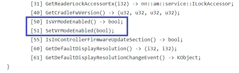 Jak można zobaczyć na poniższej grafice, nad kodem odpowiedzialnym za sprawdzanie domyślnej rozdzielczości, czy aktualizacją kontrolerów konsoli, znajdują się dwie linie sugerujące powstawanie trybu VR. Cody Brocious sądzi także, że kod ten nie jest pozostałością od Nvidii i został on napisany przez Nintendo.