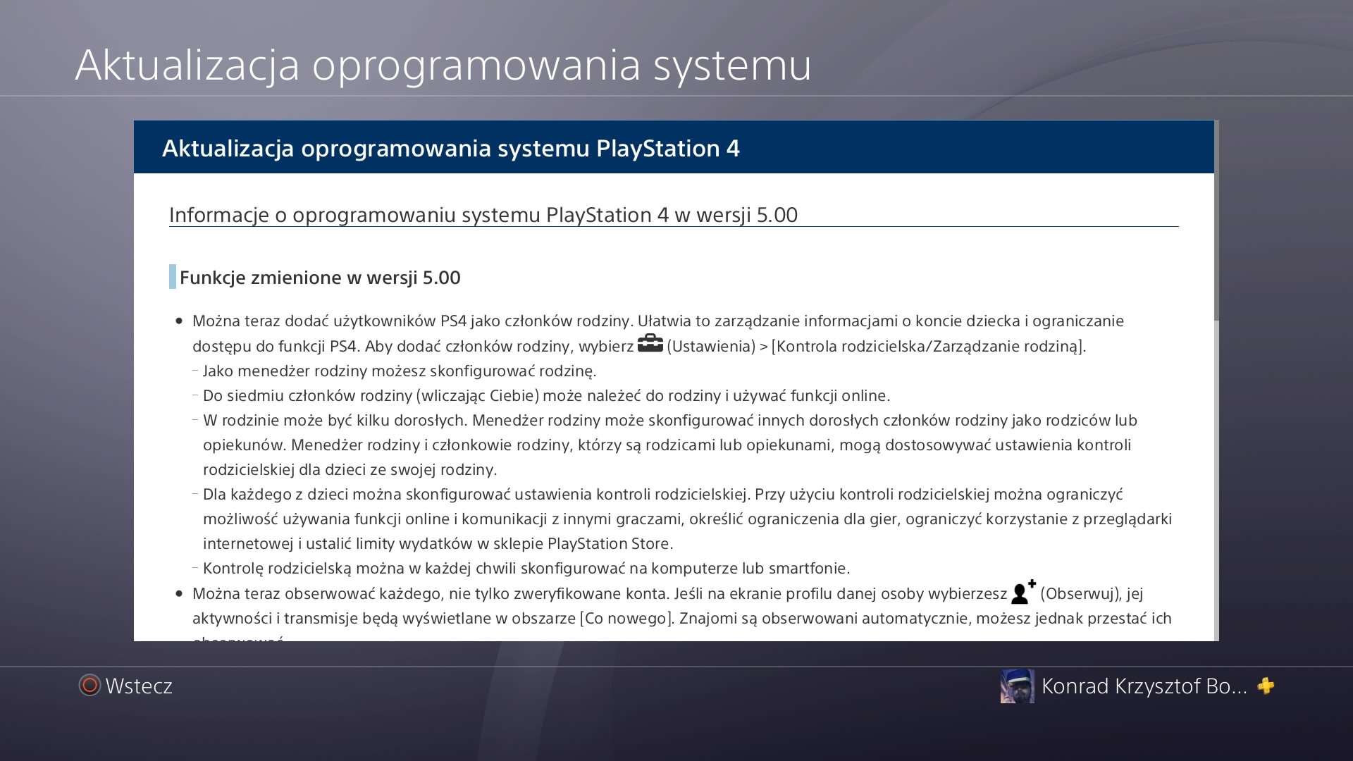 Kolejna aktualizacja systemu PlayStation 4 dostępna jest już dziś oficjalnie. Mimo numerku 5.0 aktualizacja nie wprowadza wielu nowinek. Przede wszystkim użytkownicy konsol Pro mogą nadawać na Twitchu rozgrywkę w 1080p i 60 klatkach na sekundę. Dodano możliwość tworzenia własnych grup ze znajomymi. Śledzić można teraz też dowolnego gracza, a nie tylko zweryfikowane konta developerów. Gracze z małymi dziećmi będą mogli łatwiej zarządzać kontami pociech dzięki dodaniu opcji rodziny.