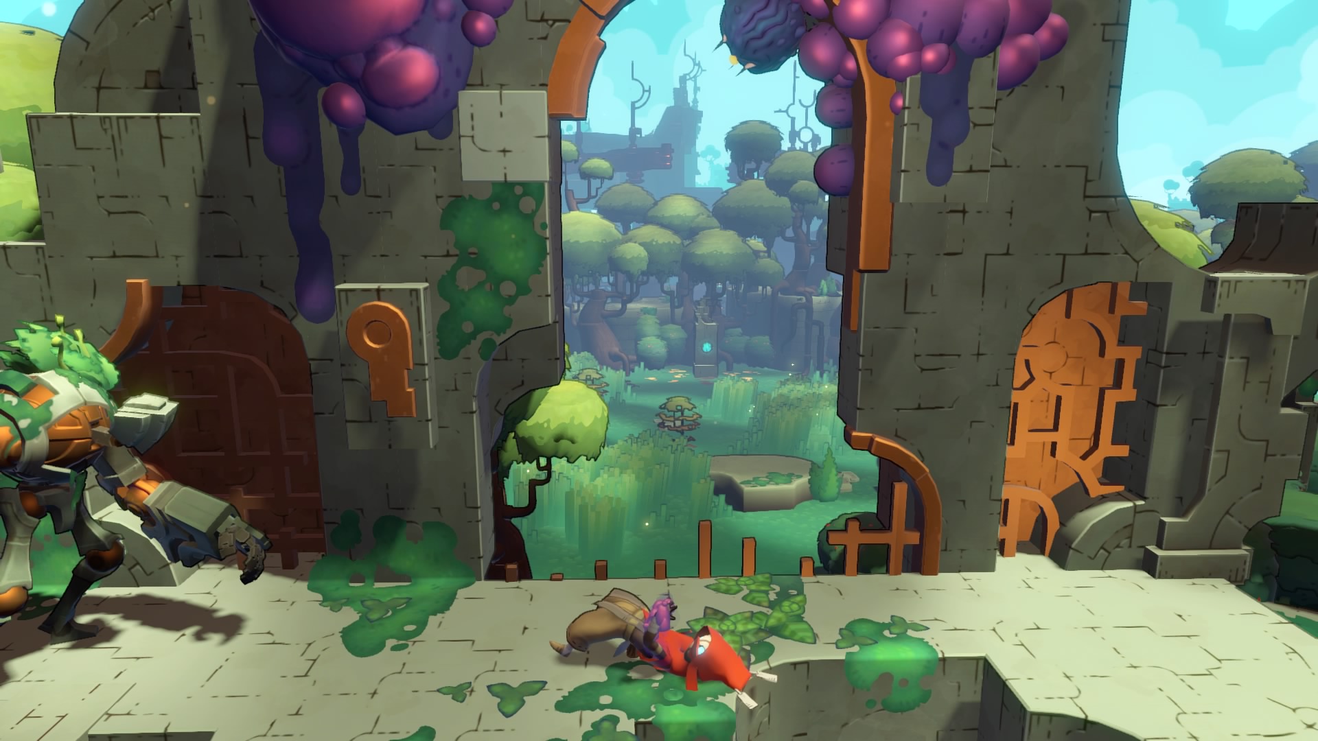 Hob to jeden z tych tytułów, który na początku nie zdradza za wiele, tym samym sprawia, że gracz z każdą minutą jest coraz bardziej zaintrygowany. Wcielamy się w postać ubraną w czerwoną pelerynkę, o której nie wiemy praktycznie nic… Lądujemy w ładnym miejscu, ale już po chwili zdajemy sobie sprawę, że nie jest przyjazne. I nie mam na myśli mrocznych postaci, duchów czy innych przerażających dziwactw. Na naszej drodze spotykamy coś w rodzaju gęstego, porzeczkowego kisielu, który jak się okazuje jest toksyczny i co najdziwniejsze, żywy. Kiedy się do niego zbliżymy jest duża szansa, że nas zaatakuje, a gdy na niego wskoczymy, zostaniemy zranieni. Niestety, to nie koniec złych wieści, nasza postać zostaje zakażona. I jest to tak poważne, że nasz towarzysz musi amputować rękę naszej postaci… Ale spokojnie, bo to właśnie tu zaczyna się nasza niezwykła przygoda. Ponieważ, utracona kończyna zostaje zastąpiona supermocną, kamienną i zmechanizowaną protez, która daje nam niesamowite możliwości. Nasze szanse na wygranie walki z dziwnym, fioletowym kisielem rosną, więc wyruszamy na przygodę.