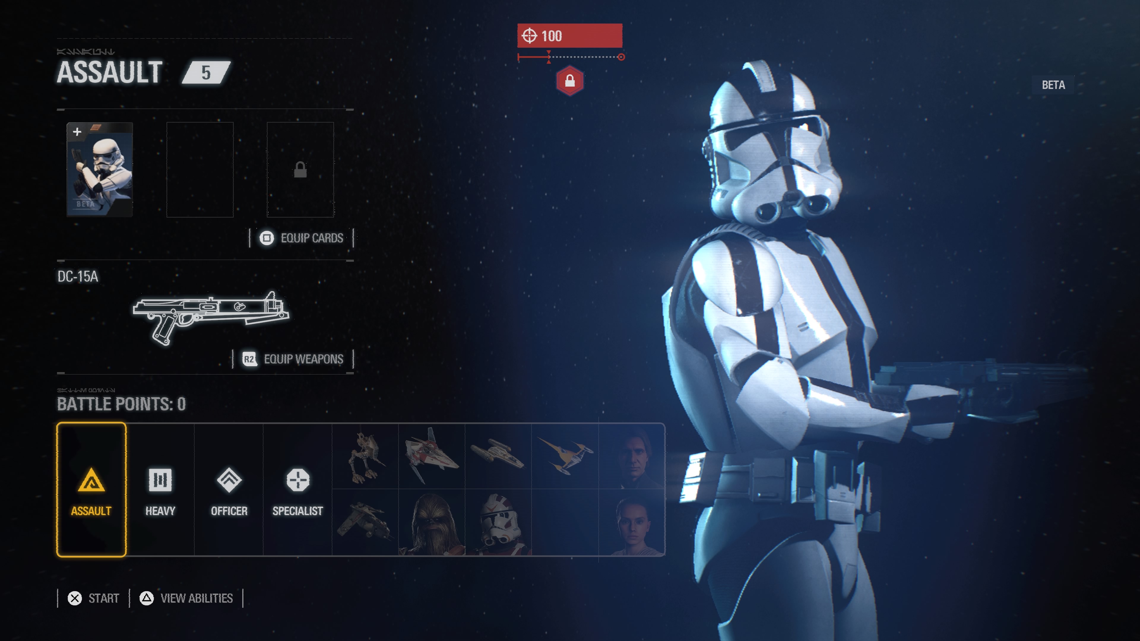 Zupełnie zmienił się system wyboru postaci. W grze pojawiły się 4 różne klasy postaci. Mamy więc standardowego żołnierza, ciężkozbrojnego, oficera zdolnego rozstawiać wieżyczki czy specjalistę strzelającego z długiego dystansu. Każda klasa postaci ma indywidualne umiejętności, sprzęt i wyposażenie. Możemy je też modyfikować za pomocą kart. Jeśli dobrze nam idzie w czasie gry to za zdobyte punkty możemy wybrać dużo mocniejszą postać czy nawet słynnego bohatera. W trakcie bety możemy wcielić się w Dartha Maula, Bobba Fetta, Hana Solo czy Rey.