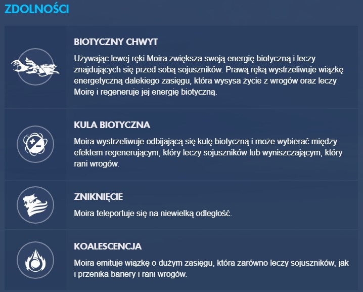 Biotyczne zdolności Moiry pozwalają leczyć lub zadawać obrażenia w każdej sytuacji. Chociaż jej Biotyczny Chwyt leczy na niewielką odległość, jej Kule Biotyczne mają daleki zasięg i zapewniają leczenie członkom drużyny oraz ranią nieprzyjaciół. Moira może również używać zdolności Zniknięcia, aby uciec grupom wrogów lub pozostać blisko sojuszników i zapewniać im wsparcie. A kiedy naładuje superzdolność – Koalescencję – może uratować wielu sojuszników naraz przed śmiercią lub dobić osłabionych przeciwników.