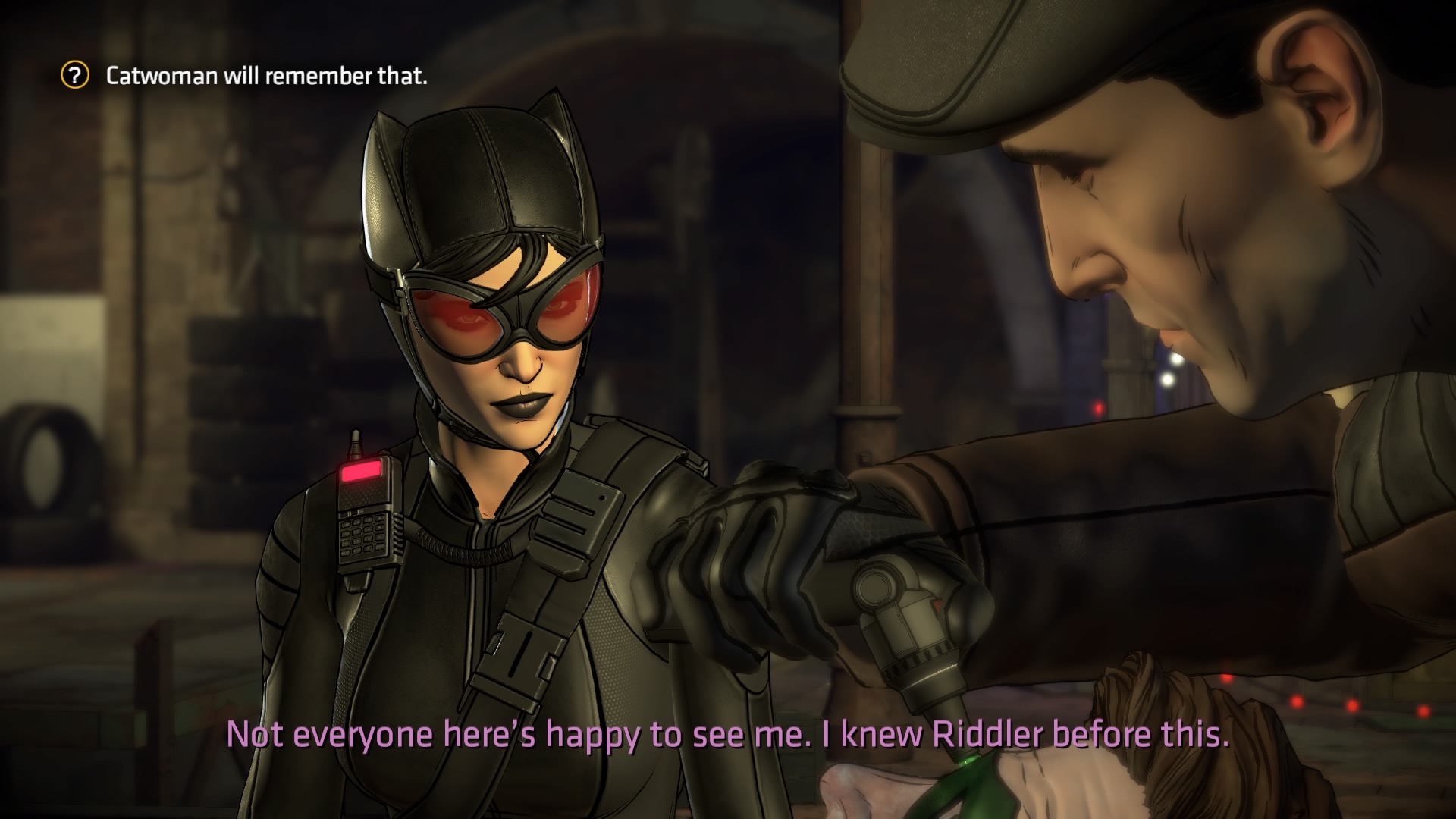 W najnowszym odcinku poznajemy dalsze losy Bruce’a Wayne’a, działającego pod przykrywką w tajemniczym Pakcie. Jego kolejna skrywana tożsamość co chwilę narażana jest na odkrycie. Nieraz będzie wam trudno podjąć decyzję, jak postąpić w danej sytuacji. Powiedzieć prawdę, chroniąc inną osobę i tym samym narażając się na zdemaskowanie? Czy może jednak wybrać mniejsze zło – nie wybronić niewinnego tylko po to, by nasza tożsamość dalej skrywana była pod maską i cała misja miała większą szansę na powodzenie? Takie rozterki moralne są na porządku dziennym w ractured Mask i słowa uznania należą się panom z Telltale Games za to, że nie są to dylematy wstawione na siłę. Występują one w tak dobrze dobranych ilościach i momentach, że mamy poczucie faktycznego wpływania na los innych bohaterów, ale i nie czujemy, że jest to główną siłą napędową recenzowanej produkcji. Wyważenie jest idealne.