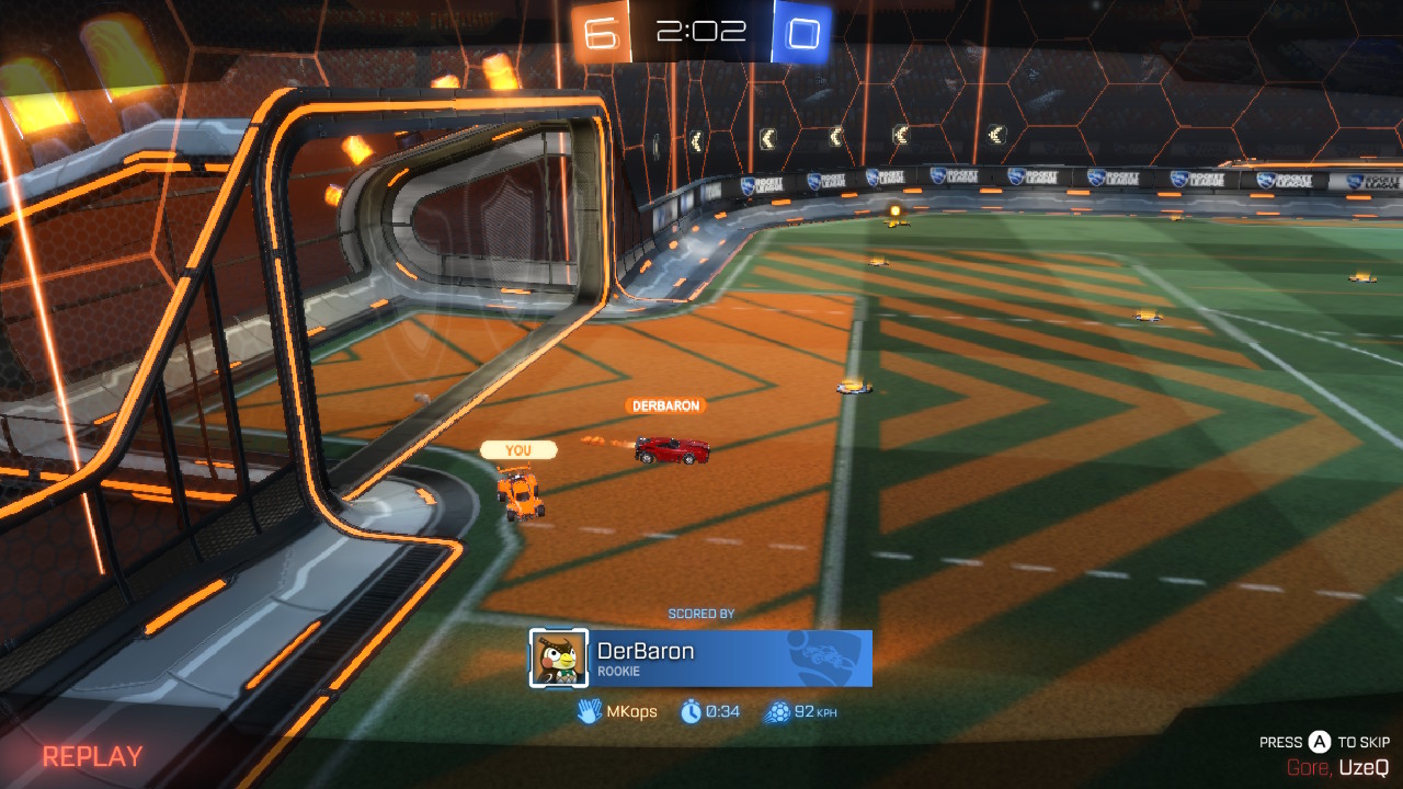 Szybkie wprowadzenie – Rocket League to gra, w której sterujemy małym zdalnie sterowanym samochodzikiem i rozgrywamy mecze w piłkę nożną. Po arenie lata wielka kula a naszym zadaniem jest wbić ją do bramki przeciwnika zanim oni strzelą ją na naszą bramkę. Bramki są dwie, samochodów sześć.