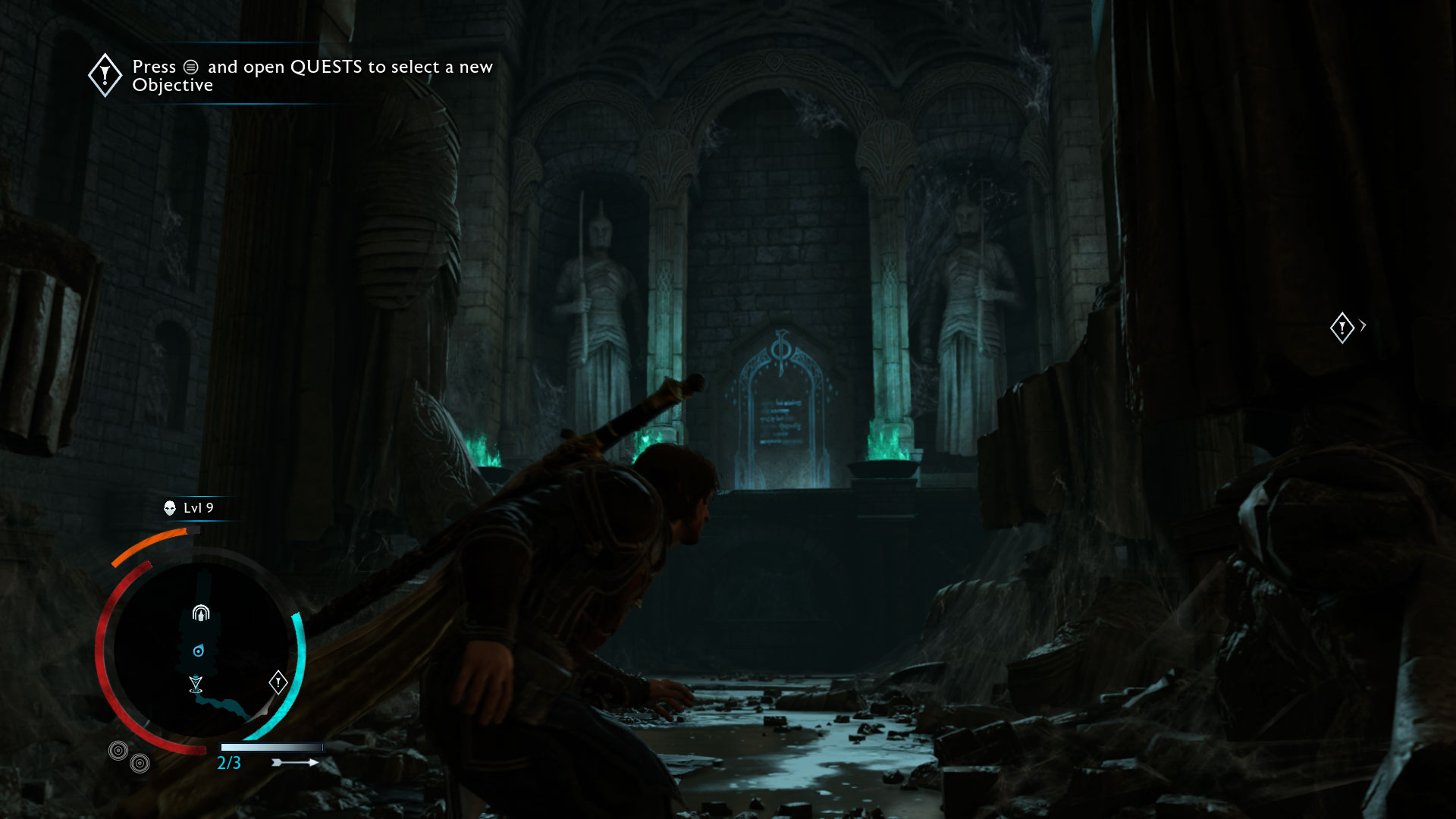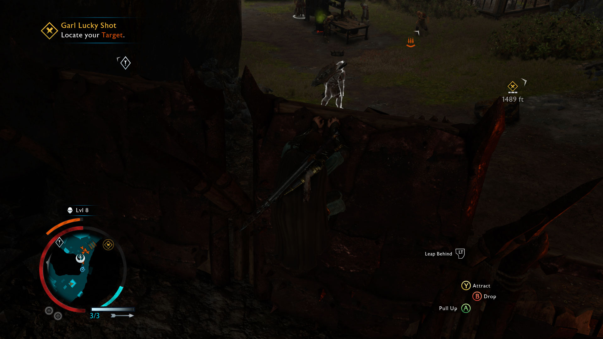 Kolejny element rozgrywki zaczerpnięty od “konkurencji” to wieże i odkrywanie mapy. Aby odkryć zadania ukryte na mapie należy wspiąć się na specjalne (oznaczone okiem Saurona) wieże i używając mocy przejąć nad nimi kontrolę. W tym miejscu podobieństwa się kończą. Zaraz po tym jak przejmiemy kontrolę, pojawia się mini-gierka, w stylu “ciepło-zimo”. Całość zabawy wygląda następująco – patrząc przez oko jak przez lornetkę przeczesujemy okolicę, gdy jesteśmy blisko miejsca gdzie ukryta jest misja pojawia się okrąg, który w miarę zbliżania się zmniejsza i odwrotnie gdy się oddalamy. Przyznam szczerze, że ten mały przerywnik jest bardzo przyjemny i, przynajmniej mnie, się nie nudzi.