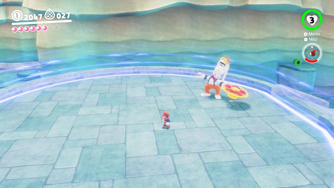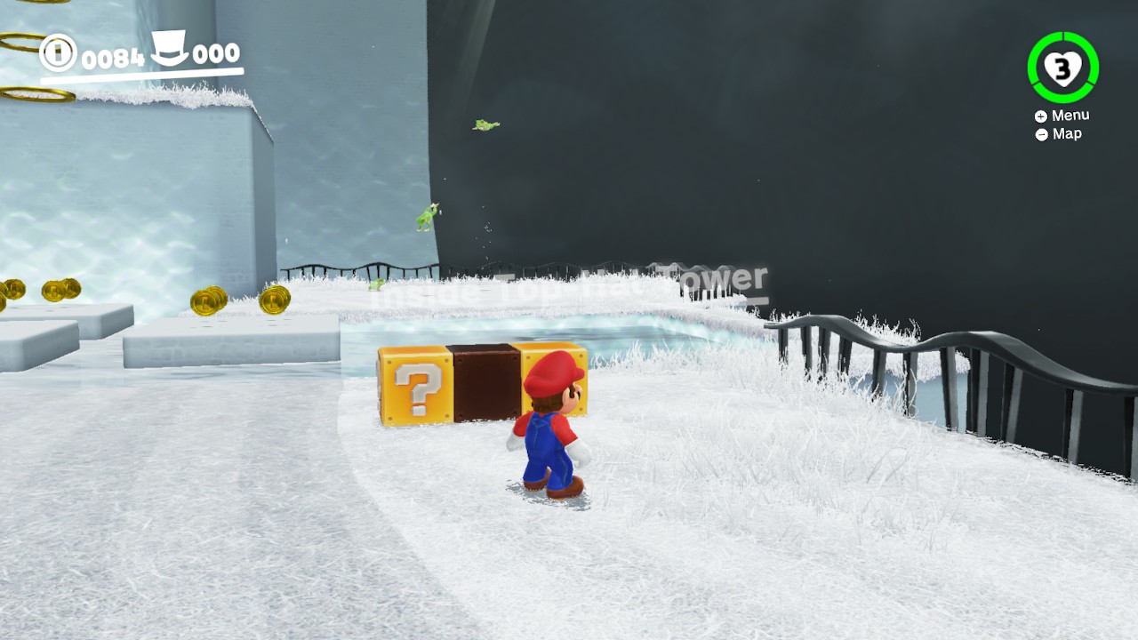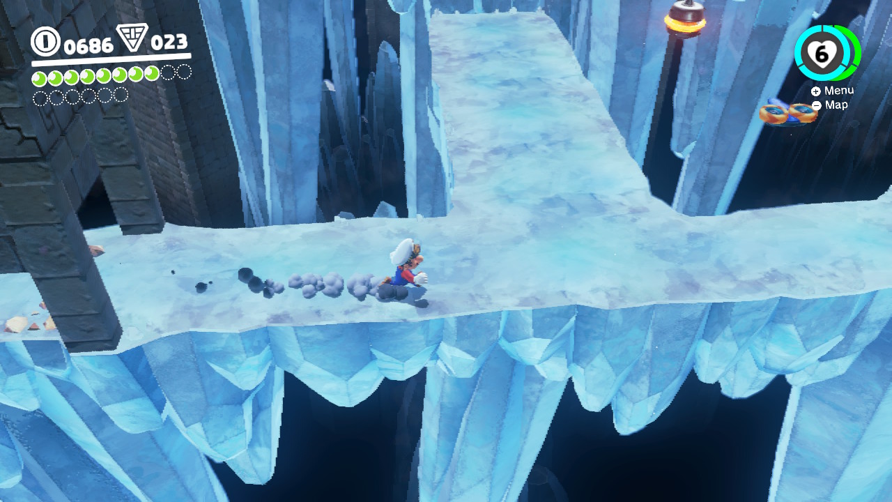 Jeśli jednak będziecie mieli problem z odnalezieniem jakiegoś księżyca to zawsze możecie kupić do niego wskazówkę, albo w ogóle dany księżyc kupić w sklepie. Jak już jesteśmy przy sklepach to warto dodać, że wreszcie zbierane przez nas monety służą do czegoś. Możemy je wymienić na zupełnie nowe ciuchy dla naszego hydraulika. Różnorodność jest spora, więc sam co chwila zmieniałem ubiór Mario. Część przebrań kupimy za standardowe złote monety, ale w każdym etapie znajdziemy też dedykowane monety fioletowe. Co ciekawe w każdym świecie mają one inny kształt. Za te monety kupimy stroje dedykowane danej krainie. Dla miasta będzie to strój budowlańca, dla śnieżnej krainy będzie to strój Eskimosa.