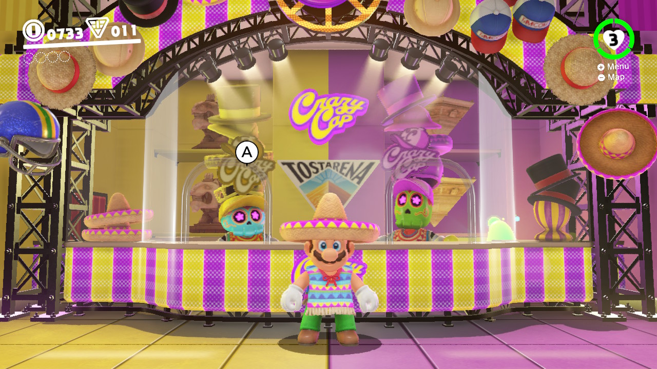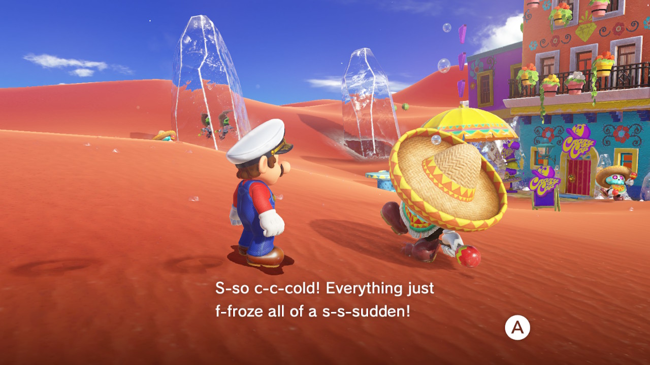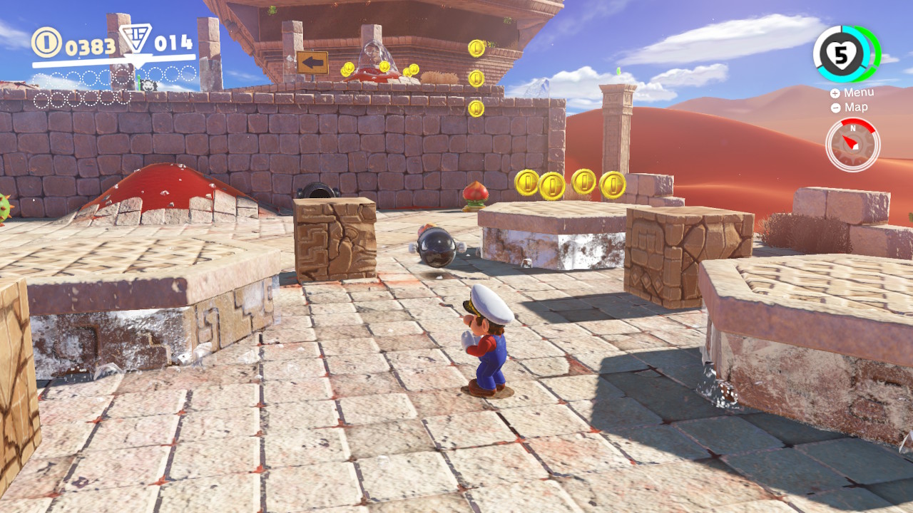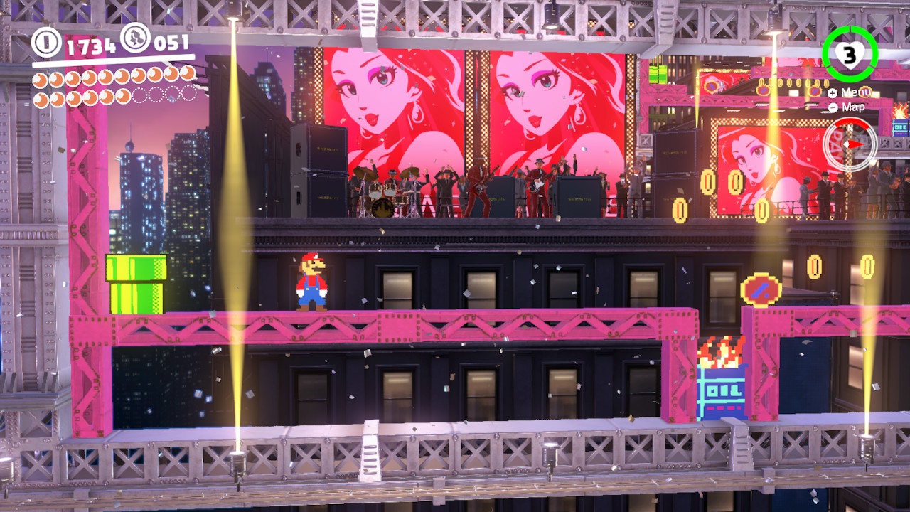 Używanie Cappy’ego i jego umiejętności kontrolowania innych istot oznacza, że w grze nie znajdziemy charakterystycznych strojów dla Mario. Nie podniesiemy tutaj np. ognistych kwiatków czy super liści dających nam nowe umiejętności. Ich rolę w tej odsłonie serii przejął Cappy. Dodatkowym urozmaiceniem rozgrywki są też fragmenty 8-bitowe. Mario wchodzi wtedy do rury, która transportuje go na dwuwymiarową planszę, gdzie w stylu graficznym z pierwszego Super Mario Bros. musimy przedostać się do końca etapu.