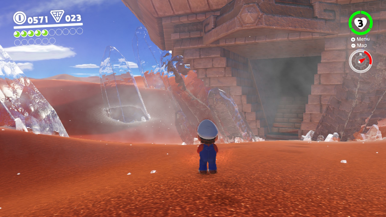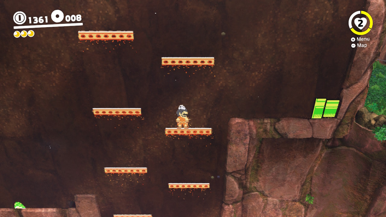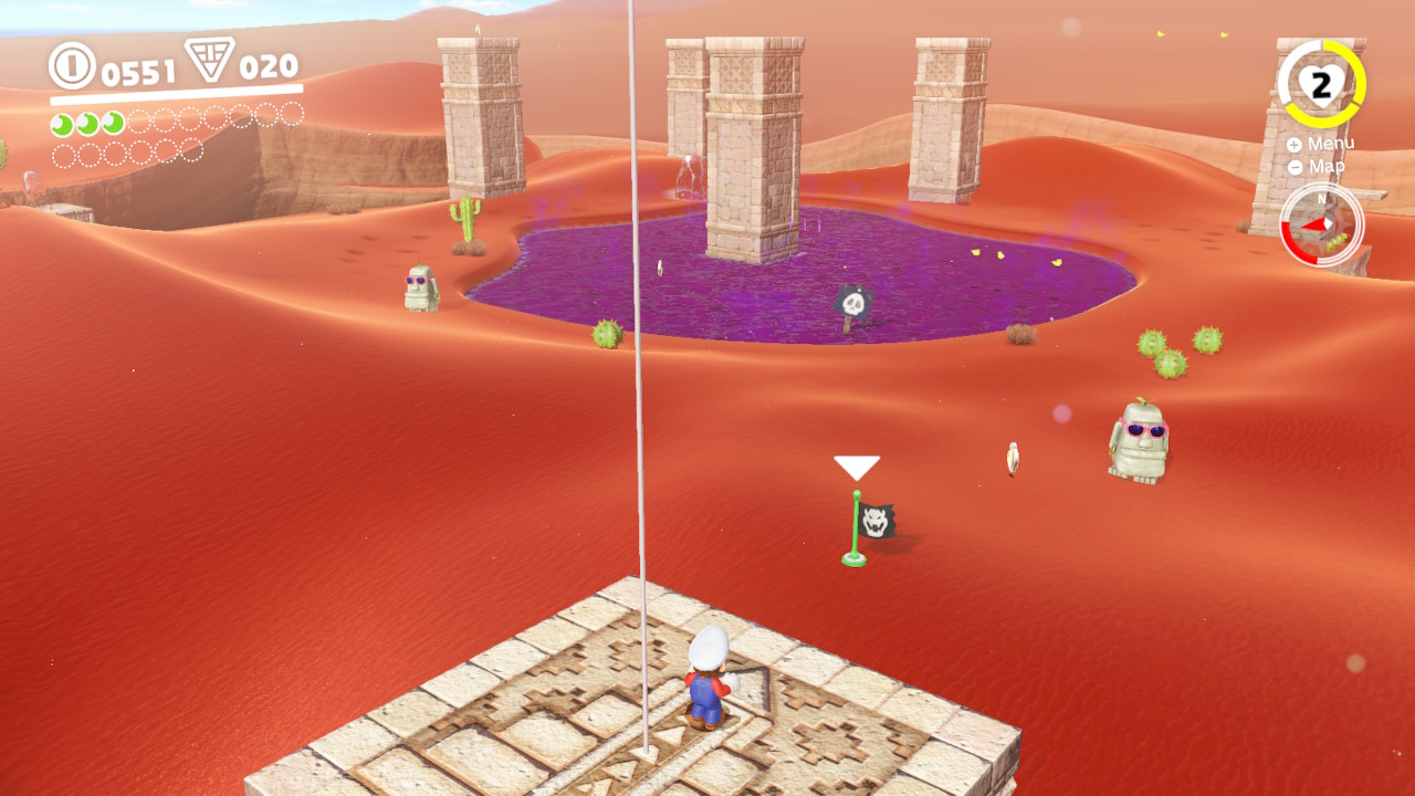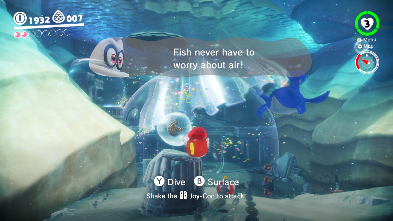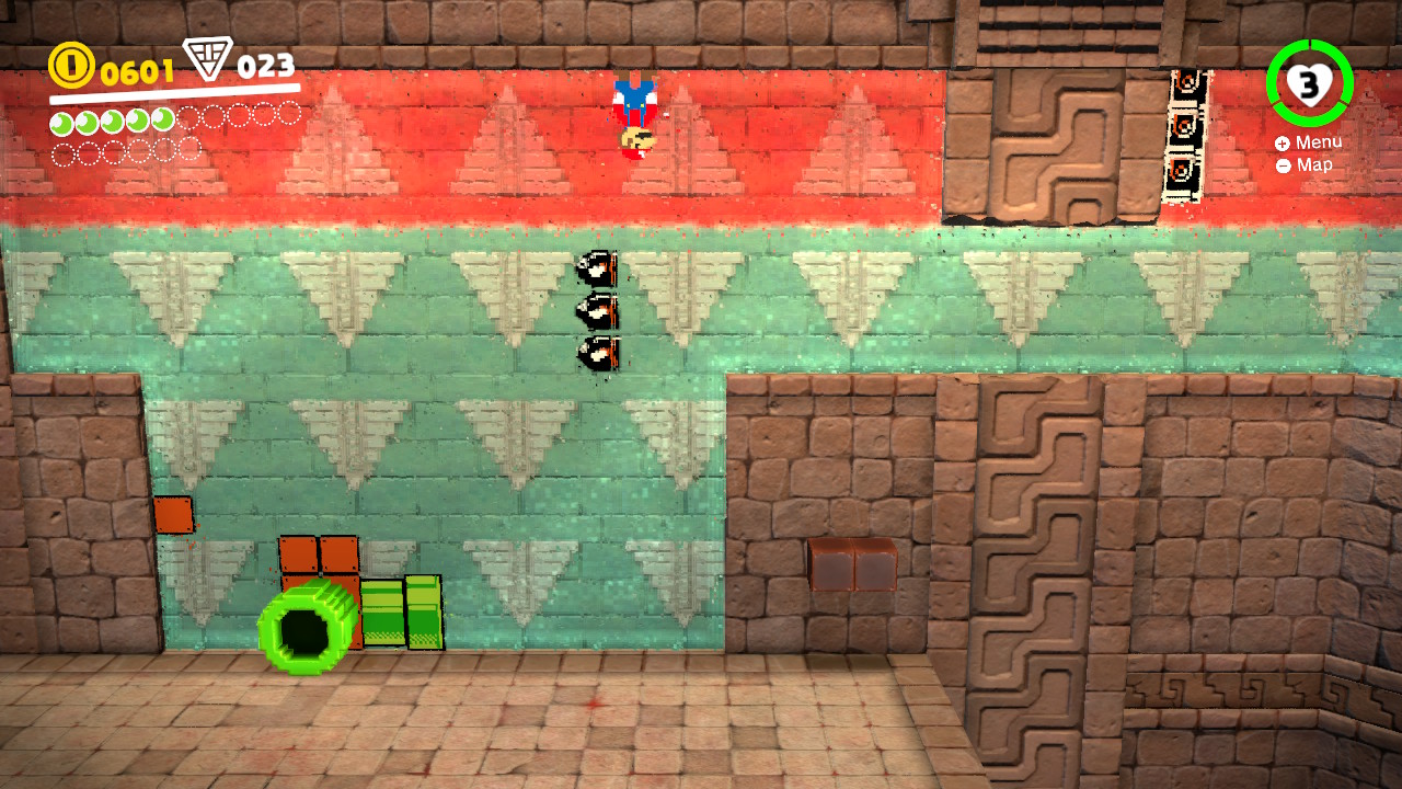 Używanie Cappy’ego i jego umiejętności kontrolowania innych istot oznacza, że w grze nie znajdziemy charakterystycznych strojów dla Mario. Nie podniesiemy tutaj np. ognistych kwiatków czy super liści dających nam nowe umiejętności. Ich rolę w tej odsłonie serii przejął Cappy. Dodatkowym urozmaiceniem rozgrywki są też fragmenty 8-bitowe. Mario wchodzi wtedy do rury, która transportuje go na dwuwymiarową planszę, gdzie w stylu graficznym z pierwszego Super Mario Bros. musimy przedostać się do końca etapu.
