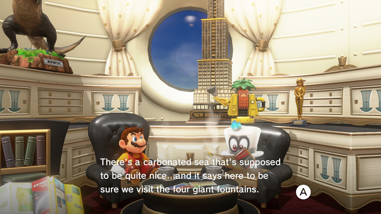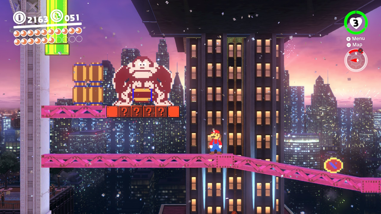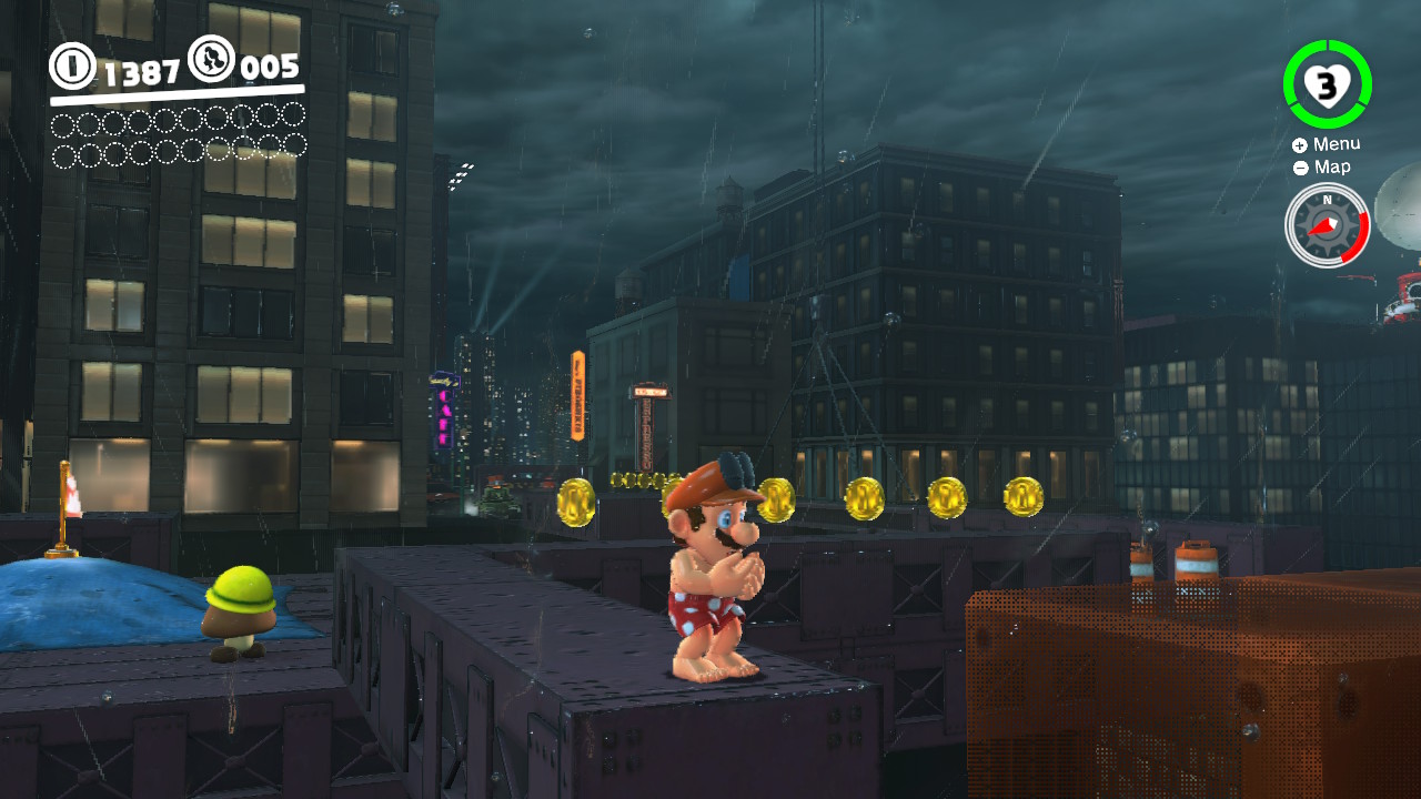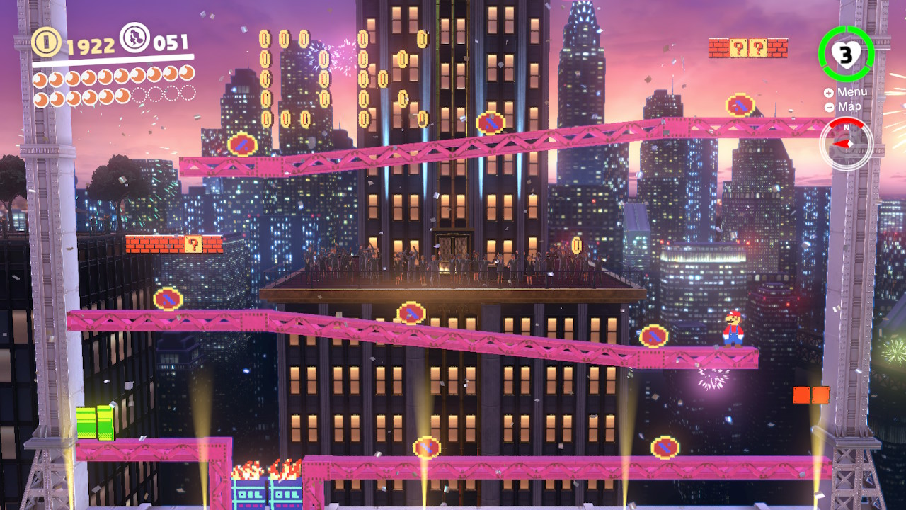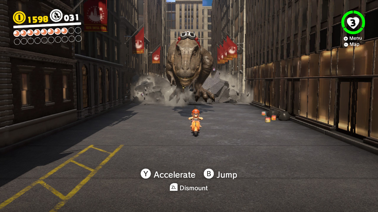 Jedyne zastrzeżenie w kwestii oprawy jakie mam to mieszanie się różnych stylów. Mario przyzwyczaił nas do kolorowych i bajkowych klimatów. dlatego też nie do końca dobrze kontrastuje to z elementami realistycznymi. Już na samym początku gry możemy spotkać wielkiego T-Rexa, który odstaje na tle kolorowych plansz i przeciwników. To samo tyczy się samego miasta New Donk City. Kolorowy Mario nie pasuje do takiego szaro burego miasta. Według mnie kontrast jest trochę aż za duży.