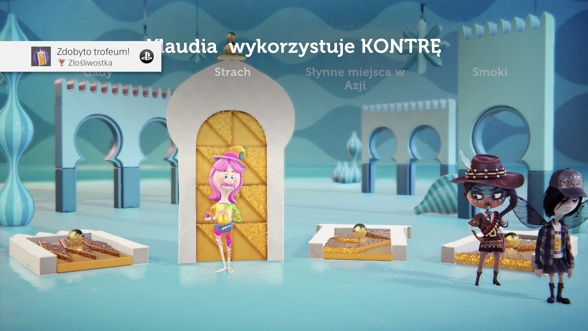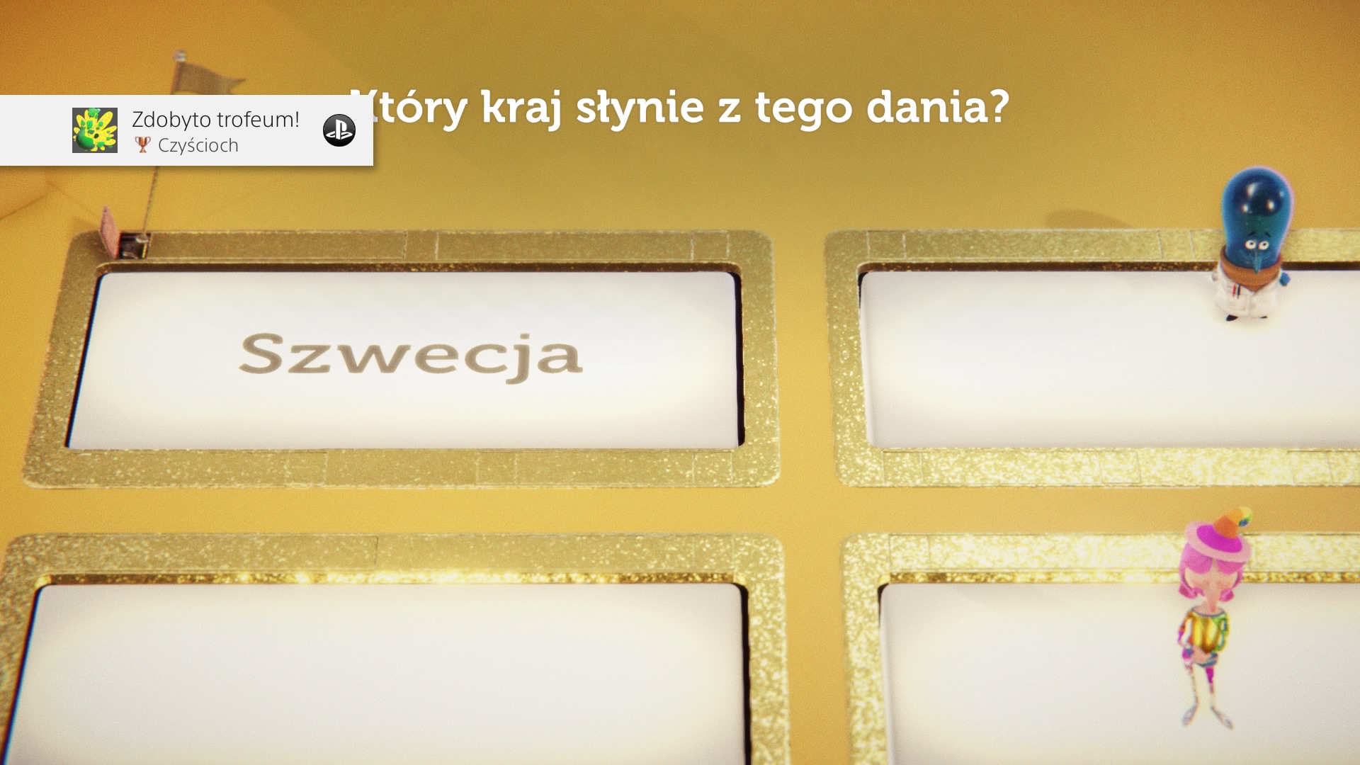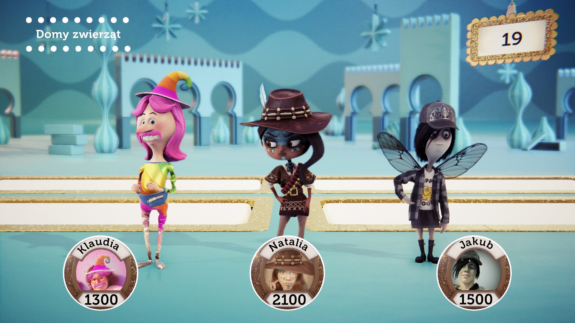 Byliśmy naprawdę podekscytowani, bo ostatni raz graliśmy w tego typu grę na konsoli PlayStation 3 w 2011 roku. Nic więc dziwnego, że bez zwłoki wybraliśmy pierwszą kategorię. Każdy z nas zagłosował na coś innego, dlatego gra zrobiła losowanie.Po odczytaniu przez prowadzącego Maksa pierwszego pytania na naszych urządzeniach mobilnych ukazały się cztery opcje. Liczyła się każda sekunda, ponieważ gracz, który udzielił prawidłowej odpowiedzi jako pierwszy, zdobywał najwięcej punktów. Niestety tylko moja kuzynka zaznaczyła dobrą opcję, przez co wyszła na prowadzenie. Każdy z nas chciał stanąć na podium, dlatego z przyjemnością w następnym pytaniu skorzystaliśmy z zagrywek. Do wyboru mieliśmy Lód, Dziobaki i na przykład Ciapę, które utrudniały udzielenie odpowiedzi. Co ciekawe, jedna osoba mogła zostać zaatakowana nawet kilkoma zagrywkami jednocześnie. Przez co moja przeciwniczka miała lód na odpowiedziach, który musiała rozbić poprzez szybkie kliknięcia, a także ciapę, którą musiała zmazać. Zajmowało to zaatakowanemu parę chwil, przez co mieliśmy większe szanse na szybsze udzielenie odpowiedzi.
