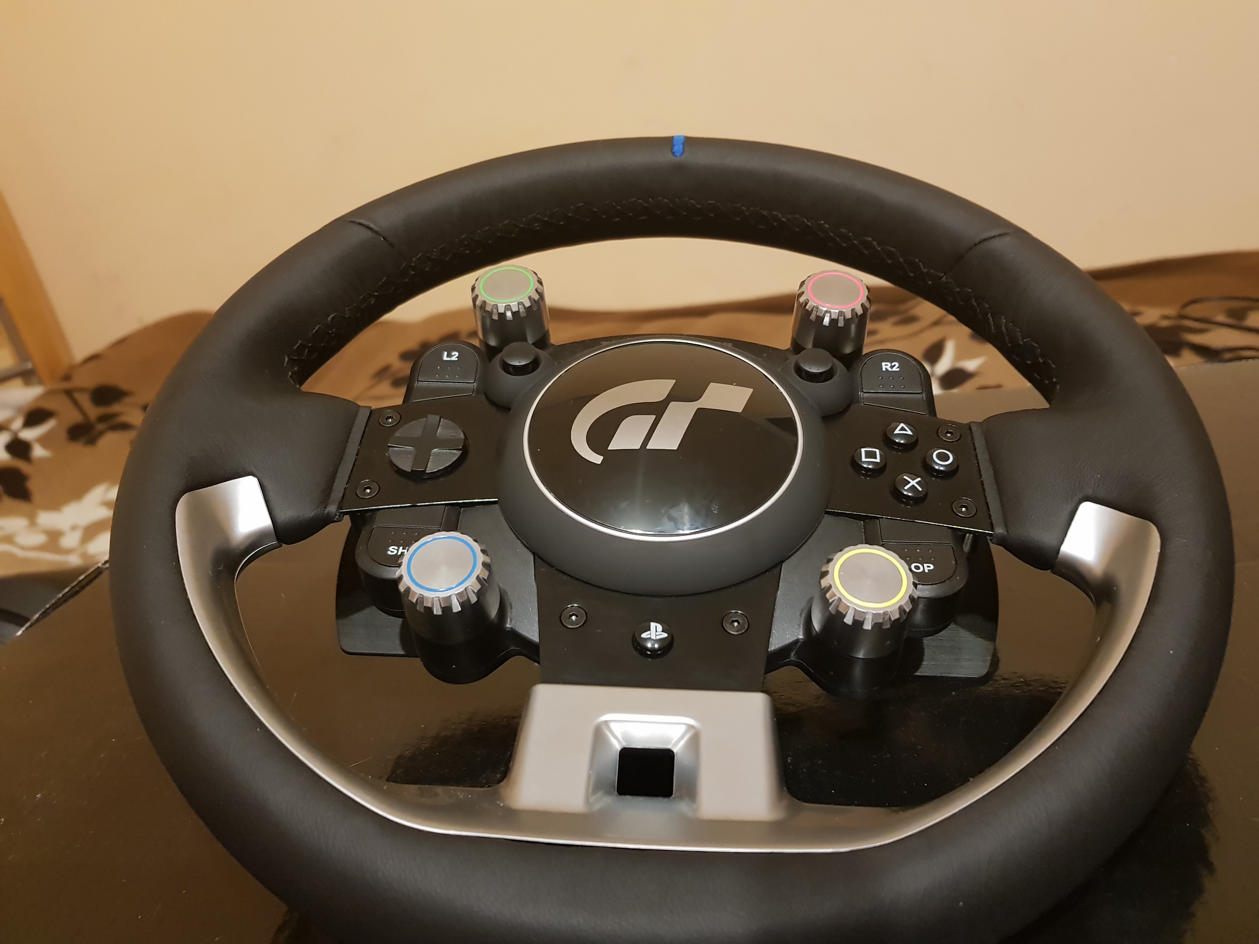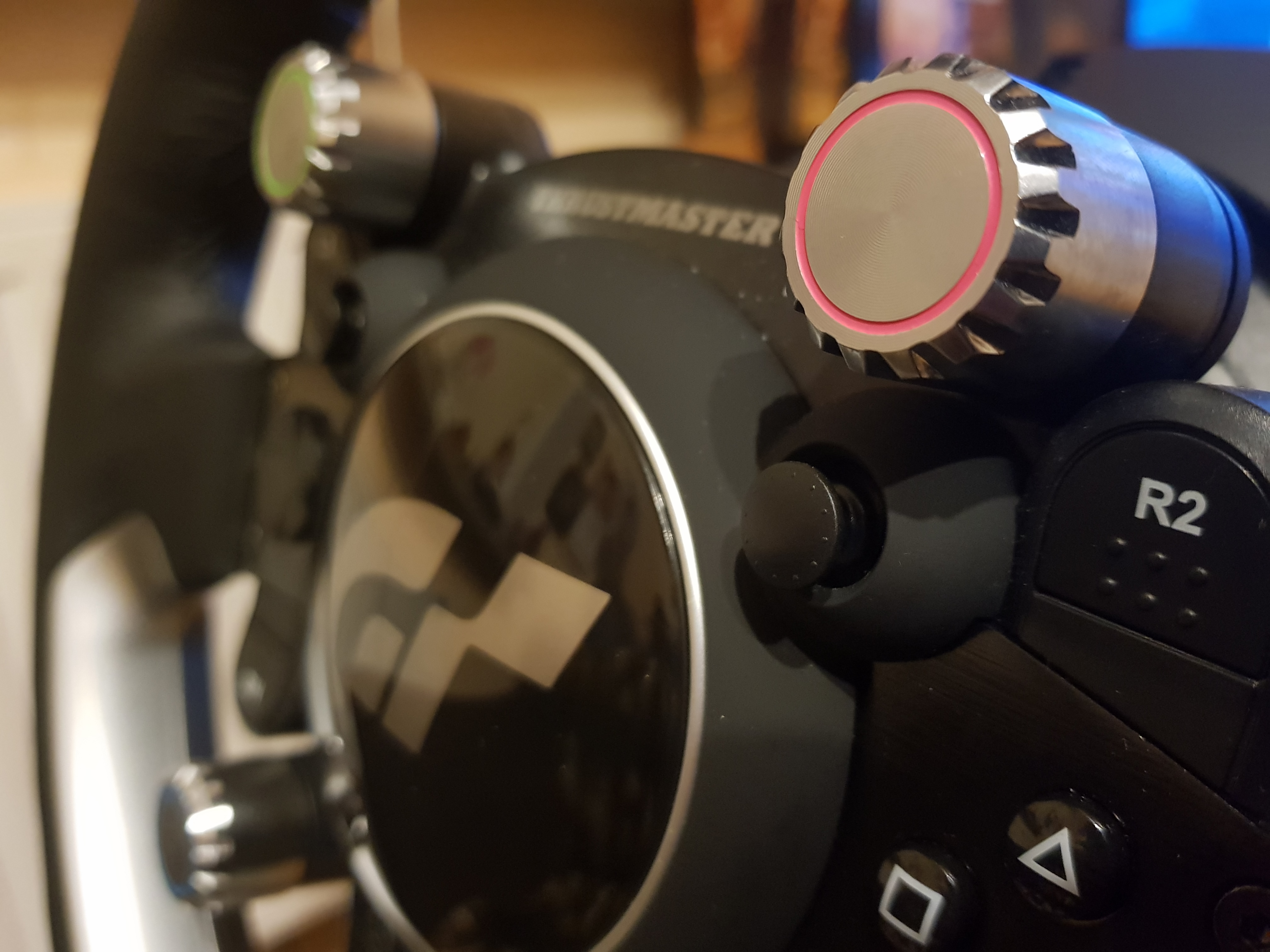 To, co pierwsze rzuca się w oczy, gdy patrzymy na kierownice, to cztery pokrętła, które pełnią także role przycisków. Zostały one rozmieszczone równomiernie dwa na górze i dwa na dole obręczy. Te pokrętła są właśnie dedykowane tylko grze Gran Turismo Sport. Opowiadają one za szybkie zmiany ustawień samochodu w czasie jazdy. Pokrętło niebieskie odpowiada za kontrolę trakcji, zielone za wzbogacenie mieszanki paliwowej, czerwone za rozkład siły hamowania, a żółty np za wyświetlanie mapy między obrotomierzemi. Musze przyznać, że te pokrętła sprawują się fantastycznie, ich używanie wcale nie rozprasza podczas jazdy i nie raz korzystałem z opcji szybkiej zmiany kontroli trakcji lub wzbogacenia mieszanki paliwowej. Kolejną nowością są dwa mini joysticki, które są umieszczone pod górnymi pokrętłami. Dzięki nim możemy precyzyjnie sterować kursorem w menu GT Sport. Jest także nielubiany przeze mnie DPad, czyli malutki krzyżak kierunkowy, który wbija się w palce niczym żyletki – jest cieńki jak zapałka. Po prawej stronie umieszczono przyciski figurowe, natomiast w dolnej środkowej części umieszczono PS button, którym logujemy się na konsoli. Jak to zawsze bywa w urządzeniach przewodowych PS buttonem nie uruchomimy konsoli. Dużą zmianę i świetnie zaprojektowano oraz rozmieszczony przycisk share oraz options, są duże i bardzo łatwo w nie trafić oraz ten pierwszy został umieszczony pod krzyżakiem, a ten drugi pod przyciskami figurowymi. Za kołem nie mogło zabraknąć oczywiście metalowych łopatek zmiany biegów, które wydają charakterystyczny klik przy każdym użyciu. Jak już wspomniałem na początku mojego tekstu sama kierownica jest fantastyczna, całość została wykonana z metalu, a obręcz obszyto prawdziwą skórką, na której chwyt dłoni jest bardzo pewny.