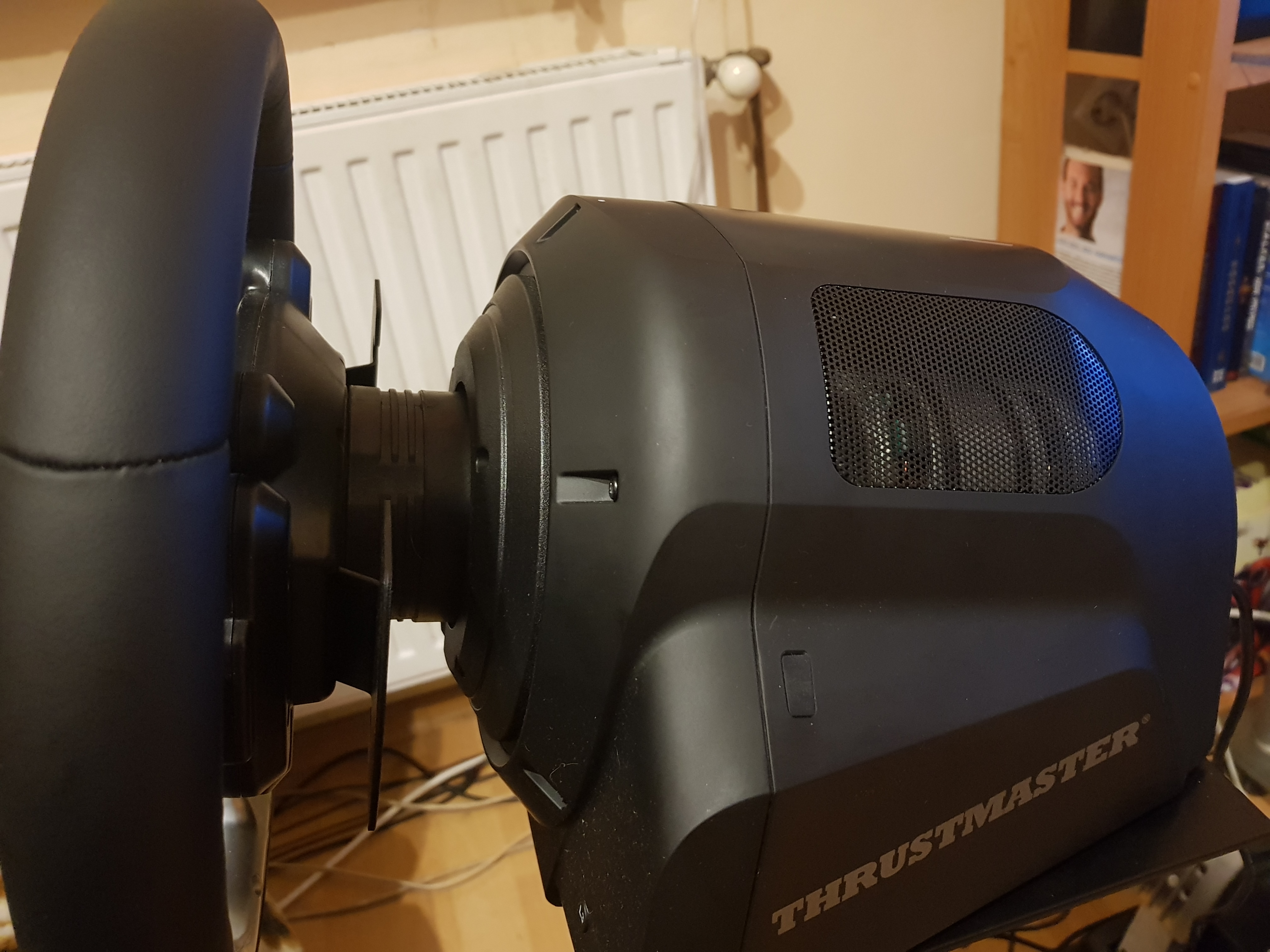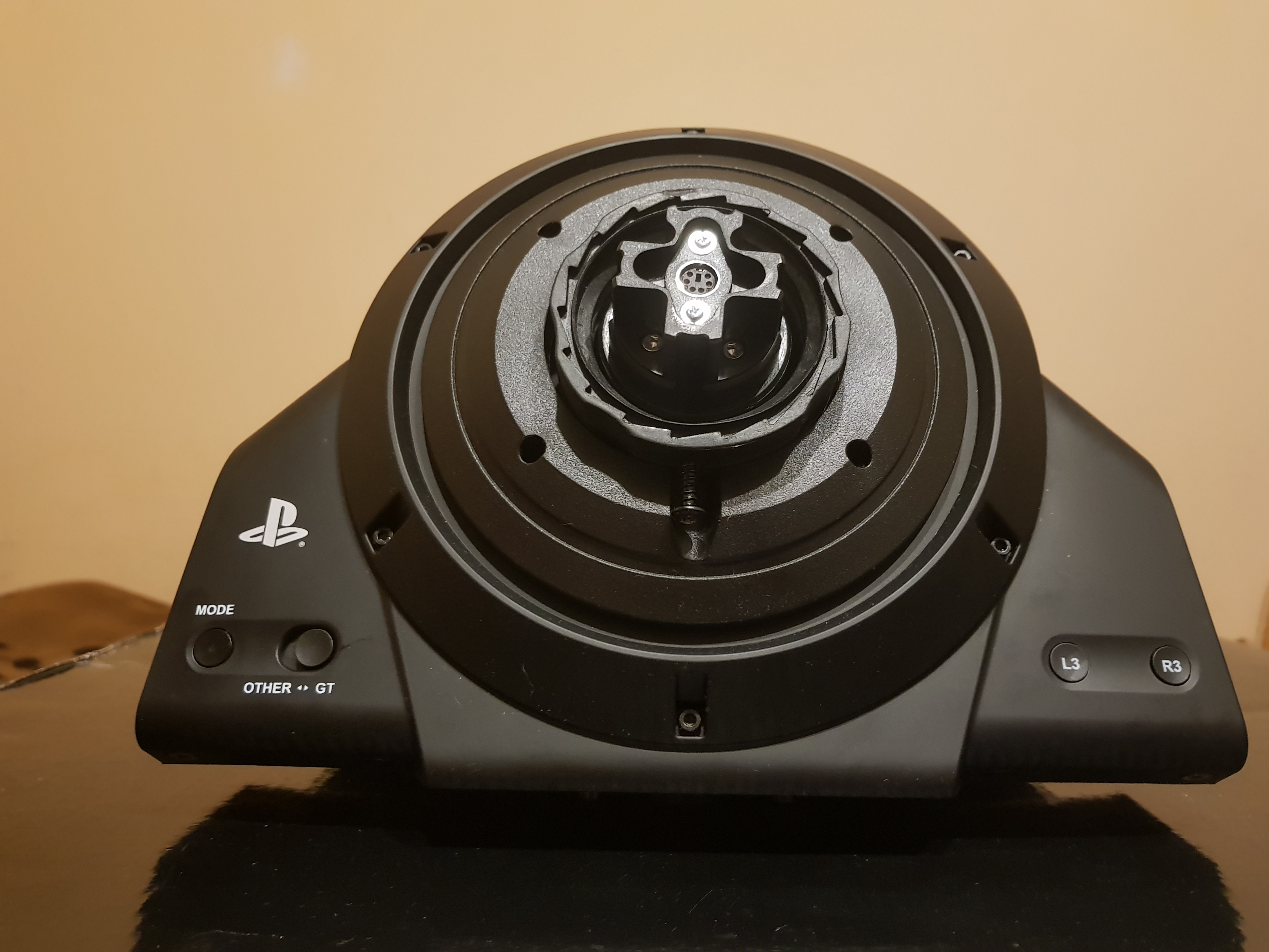 Baza kierownicy została wyposażona w cztery przyciski, po prawej stronie mamy L3 i R3, a po lewej “mode” i przełącznik “GT Sport – other“. Przycisk mode pozwala konfigurować nam pedały, gdy świeci na zielona, to gaz i sprzęgło działają normalnie, gdy zaświeci się na czerwono, to sprzęgło działa jak gaz, a gaz jak sprzęgło. Kluczowym elementem bazy kierownicy jest przełącznik “GT Sport – other”. Ustawienie go na GT Sport powoduje, że kierownica wykorzystuje wszystkie swoje technologie oraz dodatkowe pokrętła tylko w grze Gran Turismo Sport. Natomiast, abyśmy mogli używać kierownicy w pozostałych grach wyścigowych, jak np. Project Cars 2, czy Assetto Corsa musimy przełącznik ustawić na “other” W pozycji other kierownica w pozostałych grach jest wykrywana jako model T300RS.