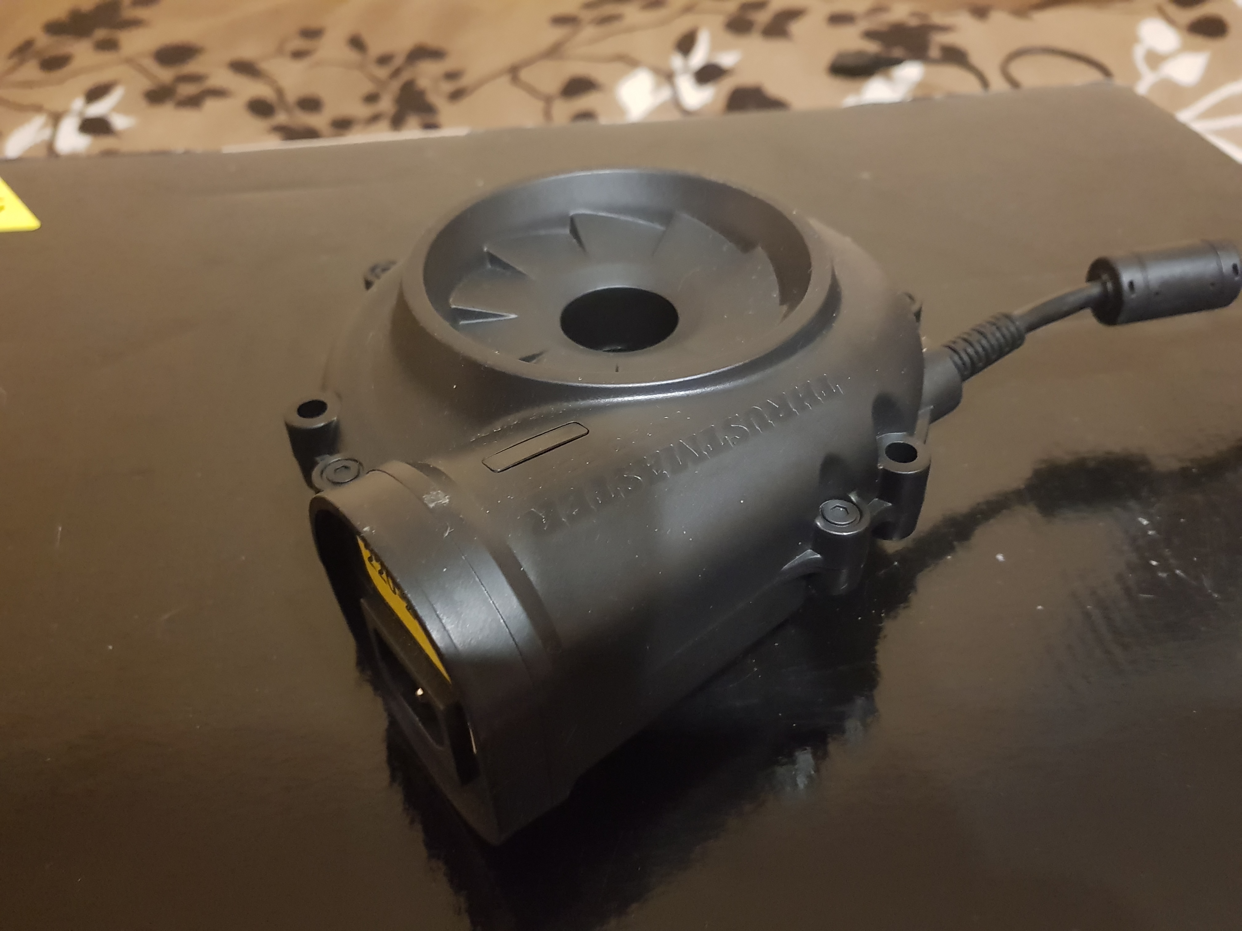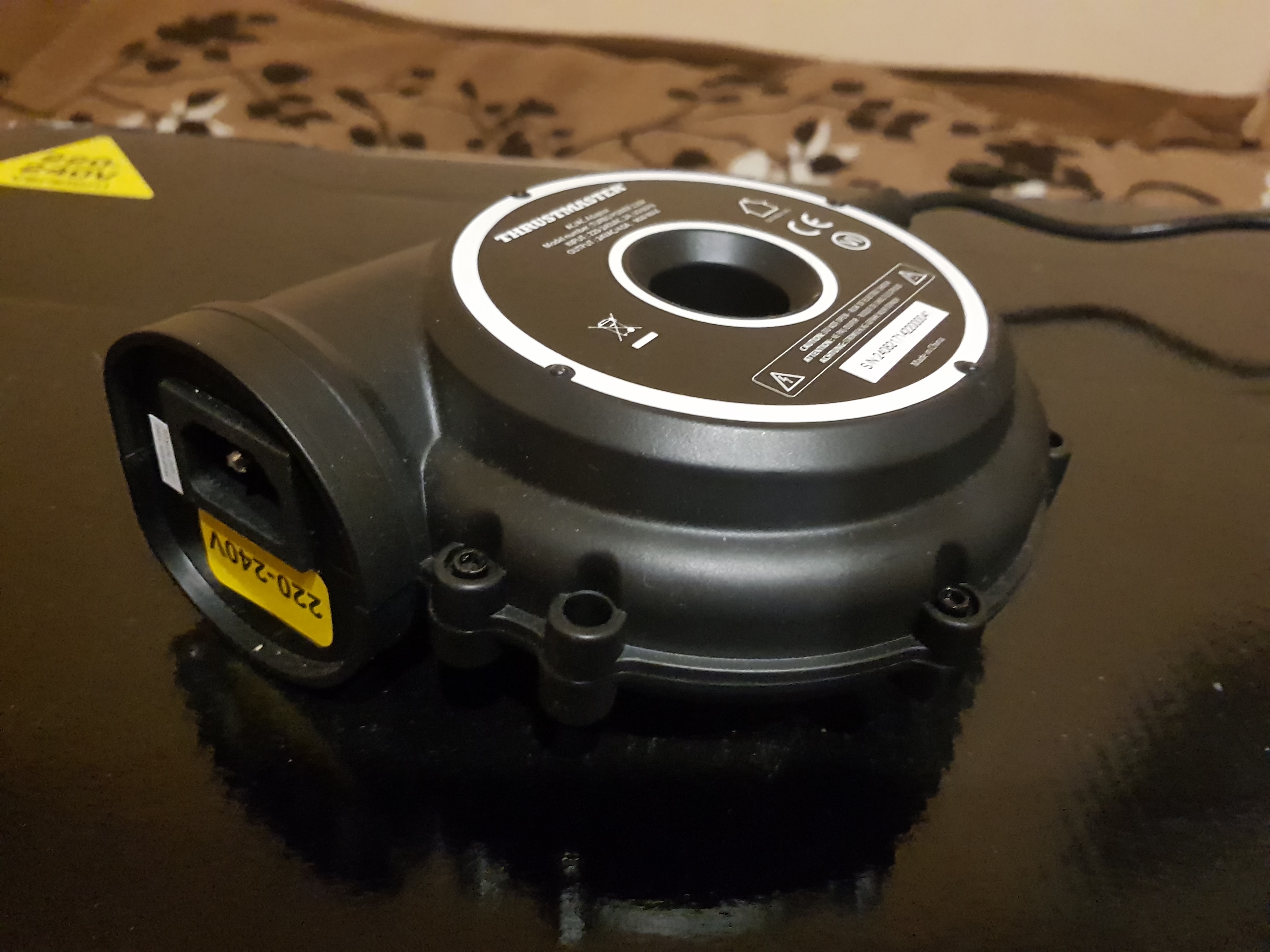 Zacznijmy od zasilacza, ponieważ on jest tutaj najnowszym elementem tego zestawu, we wcześniejszych modelach T300RS/500RS zasilacz był wbudowany w bazę, do której podłączaliśmy tylko kabel zasilający. W T-GT zasilacz postanowiono wyciągnąć na zewnątrz i umieści go w bardzo fajnej metalowej obudowie, która wygląda jak turbosprężarka. Zewnętrzne zasilanie ma za zadanie zapewniać stałą, stabilną i bezpieczną moc szczytową (Moc szczytowa wynosi aż 400 W), aby natychmiast reagować na to, co dzieje się grze. Zastosowano tutaj transformator toroidalny o efektywności 86%, jego budowa daje dużą stabilność, niezawodność działania i umożliwia transformowanie dużych mocy.