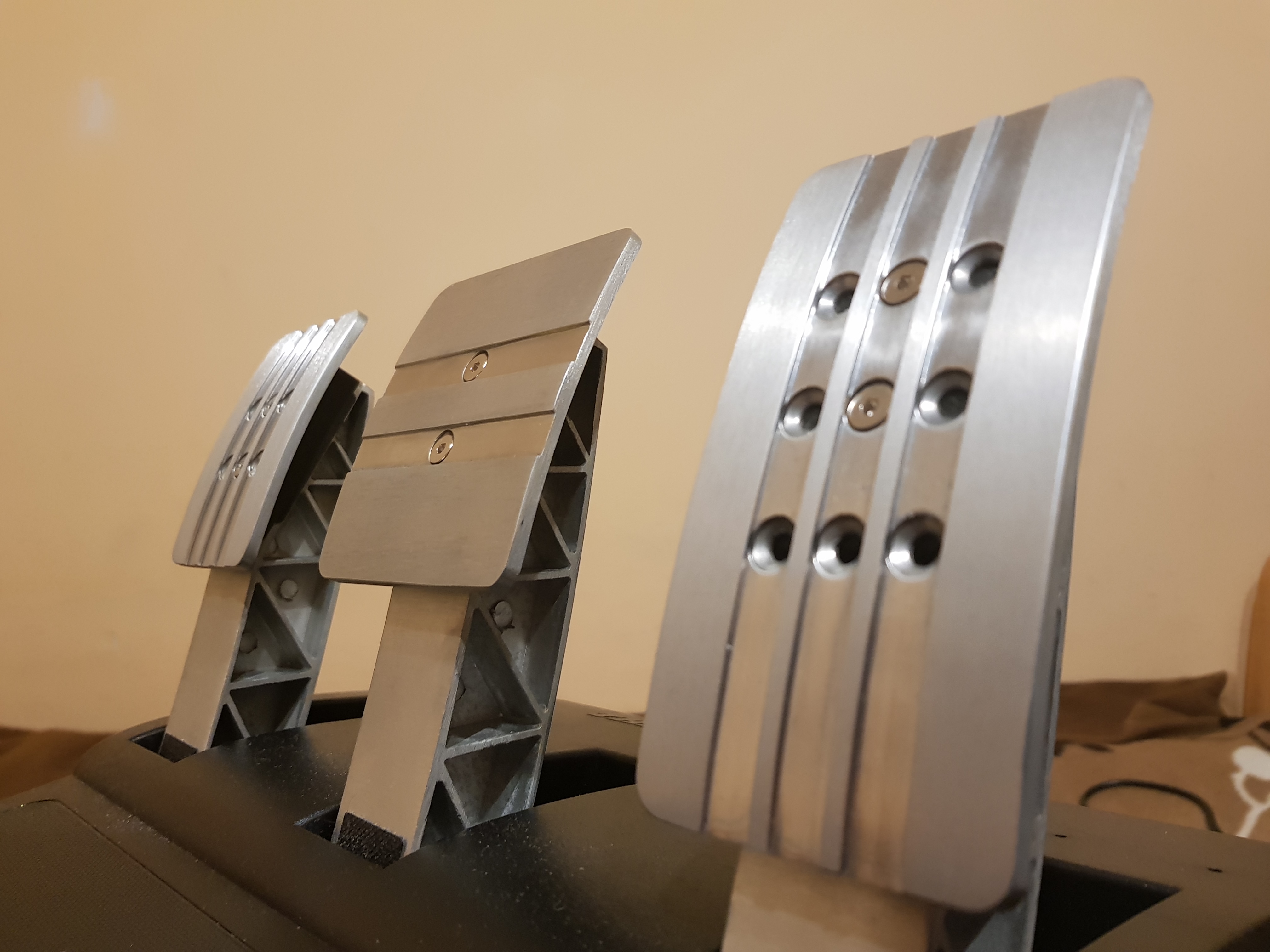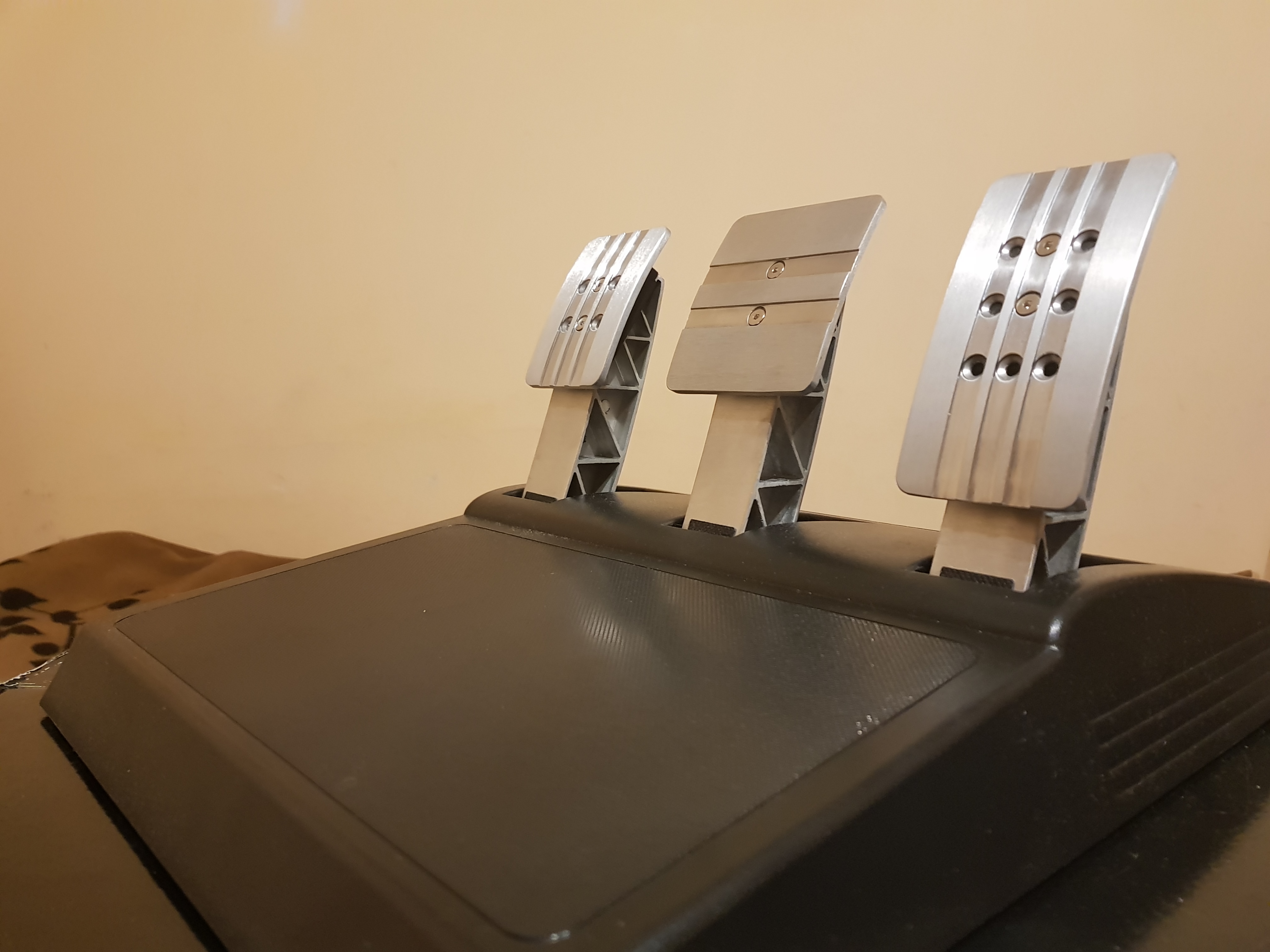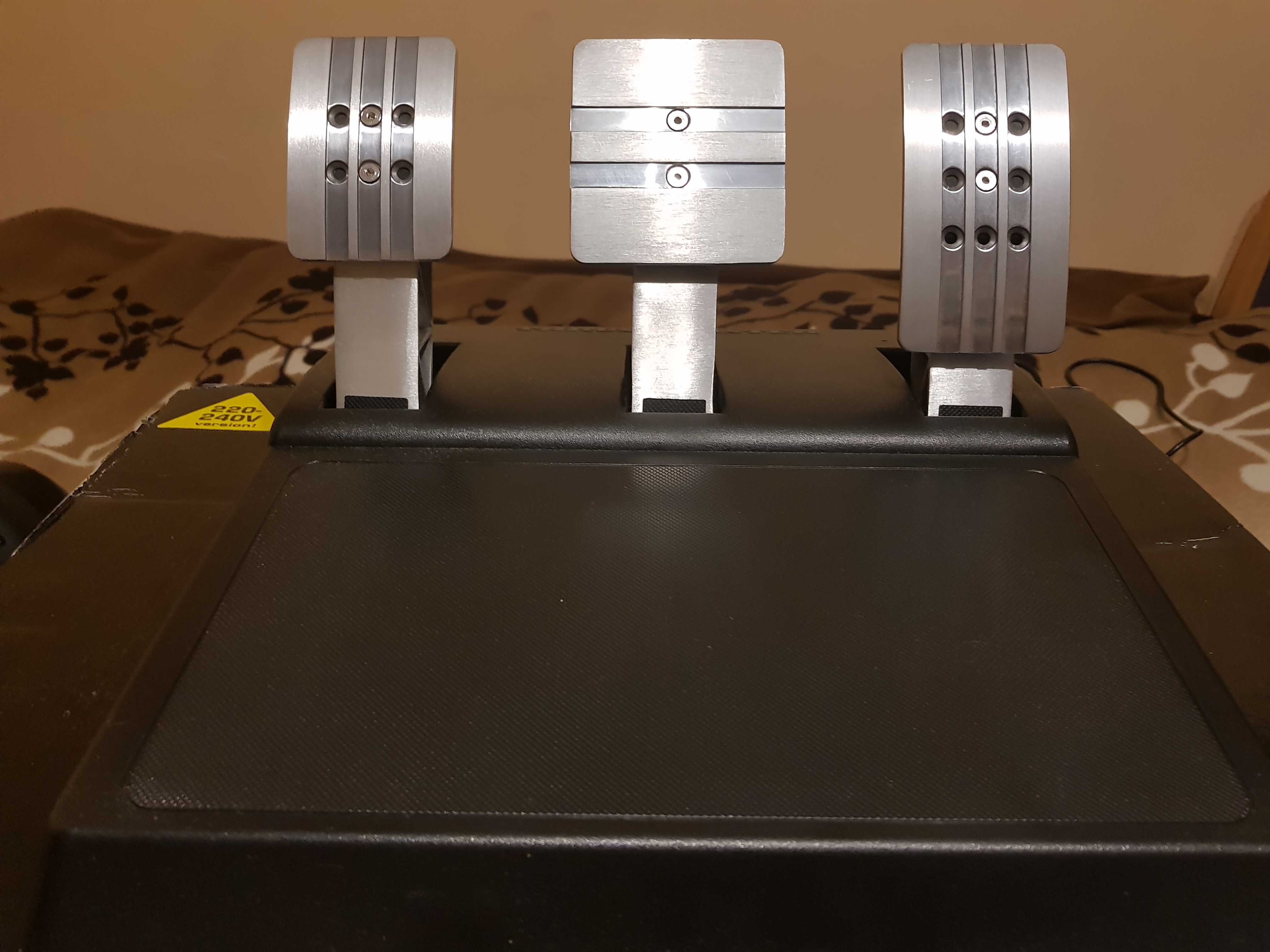Czyli ulepszona wersja T3PA, które są dołączane np. do Thrustmaster T300RS GT. Pierwsze co rzuca się w oczy to wielkość, T3PGT ma za równo większe pedały jak i podstawkę, która nadal jest wykonana z plastiku, pedały oczywiści z metalu oraz ramiona pedałów są wykonane w końcu także z metalu. Pedał hamulca jest progresywny i podobnie, jak poprzedni model wyposażony jest w mechanizm stożkowym, który musimy sobie sami zamontować. Natomiast pedały gazu i sprzęgła posiadają regulacja wysokości i skoku. Metalowa konstrukcja pedałów zapewni wysoką wytrzymałość nawet w najbardziej zaciętych zawodach.