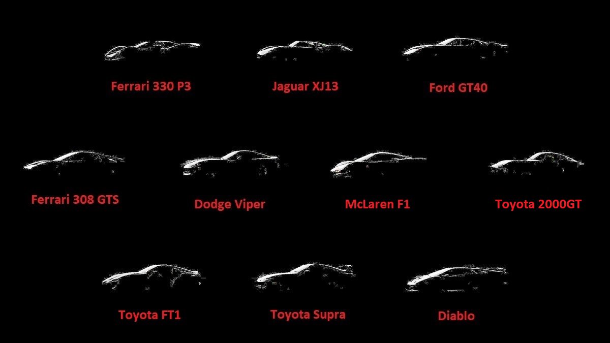 Środek: Ferrari 308 GTS, First Generation Viper, F1, Toyota 2000GT