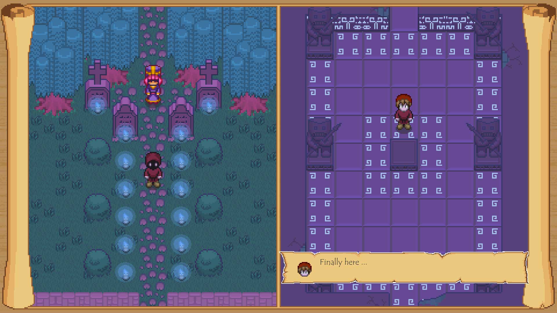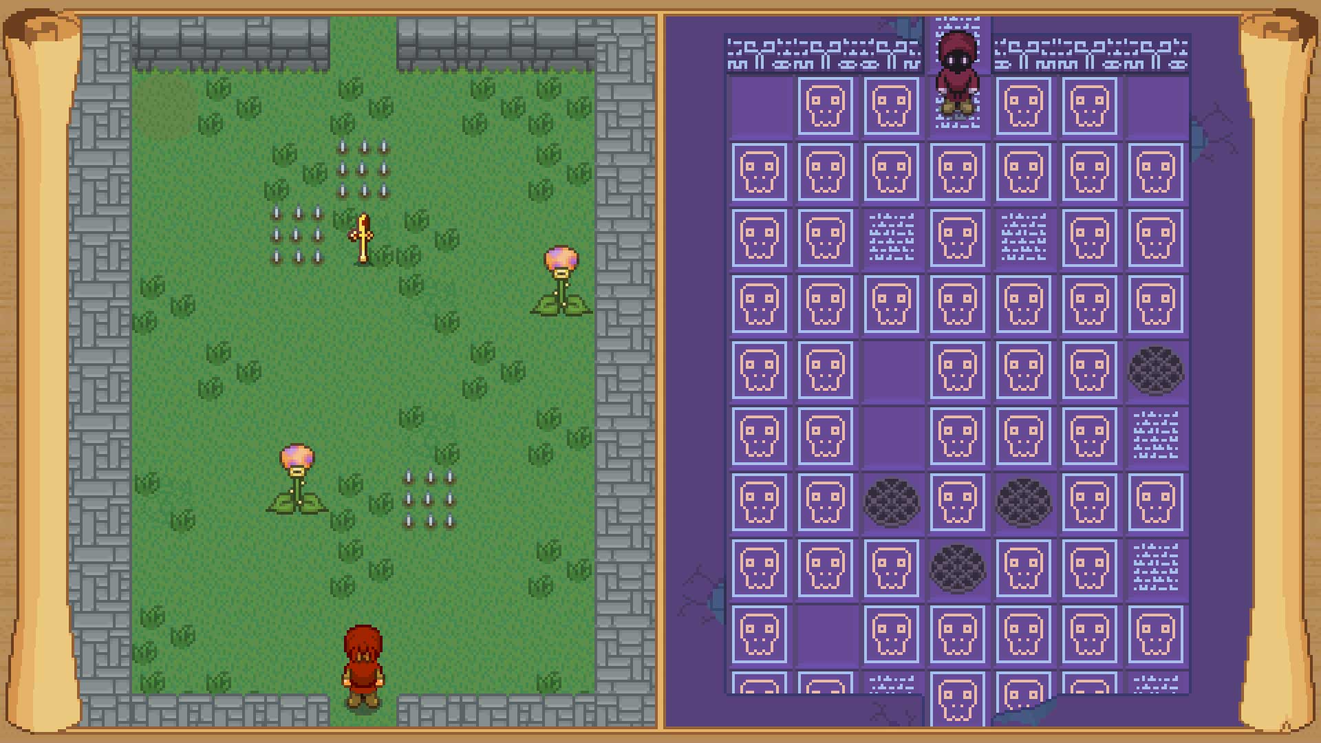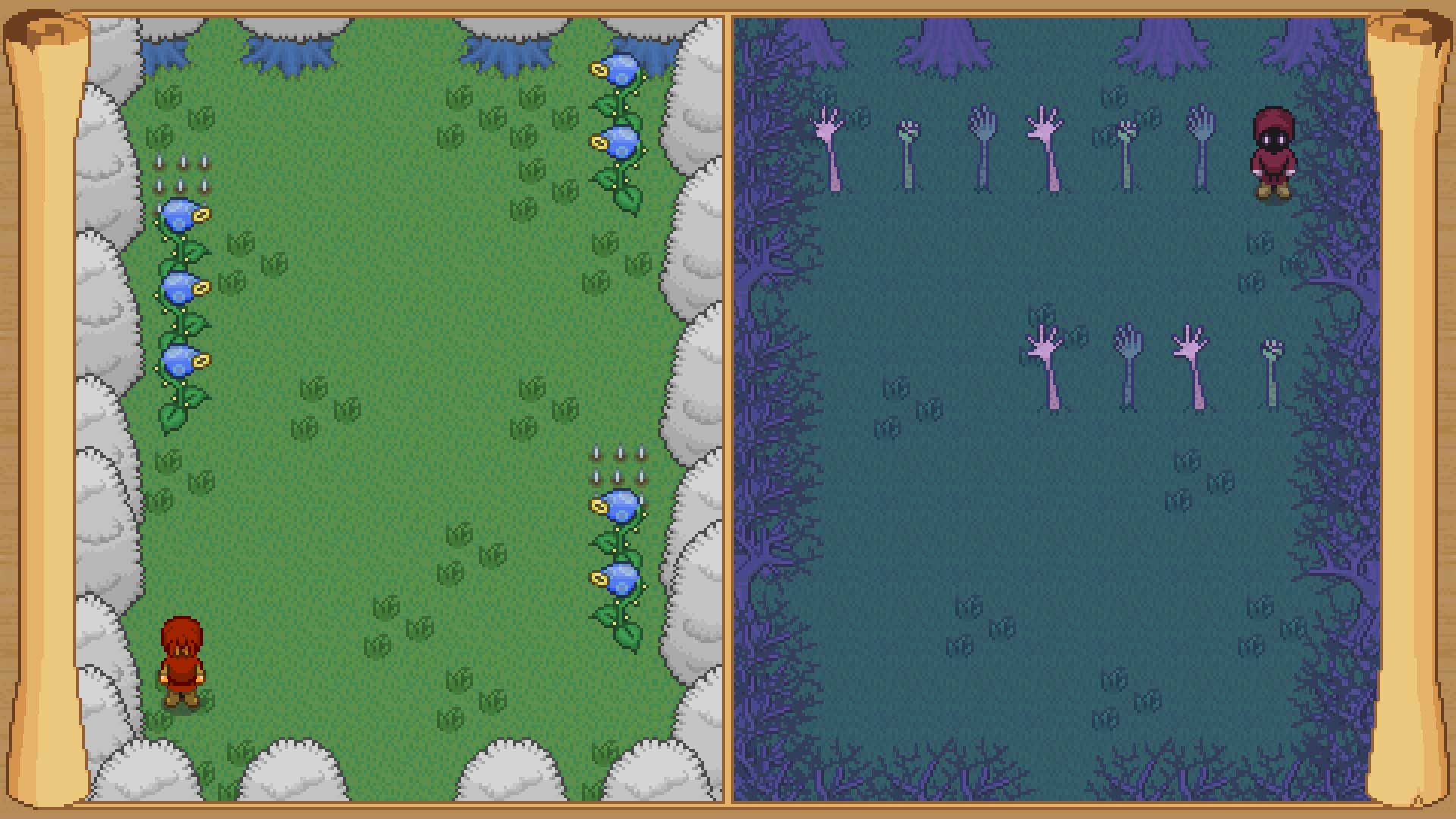“Zadanie” jest proste. Żeby ukończyć planszę trzeba dotrzeć na przeciwną krawędź ekranu. Po drodze czekać na nas będą strzelające groszkiem roślinki, po drugiej stronie ręce wystawiane przez zombie. Będzie płonąca podłoga, pochodnie, kolce przebijające się przez buty (i nogi, i postać), studnie bez dna, magiczne kwadraty, które zabiją nas po wejściu, jeśli się świecą i do tego różnej maści stworki. Jest też kamienny totem, który rusza się wraz z postaciami, ale w jedynie lustrzanym odbiciu.