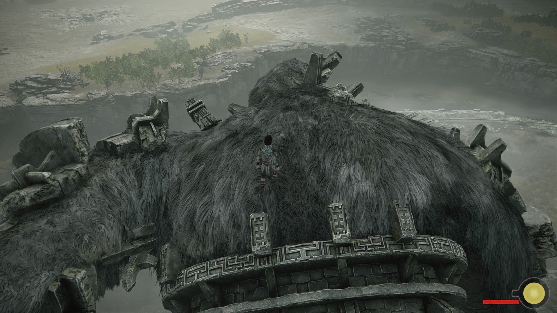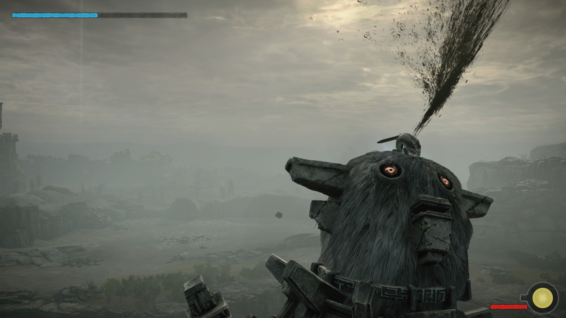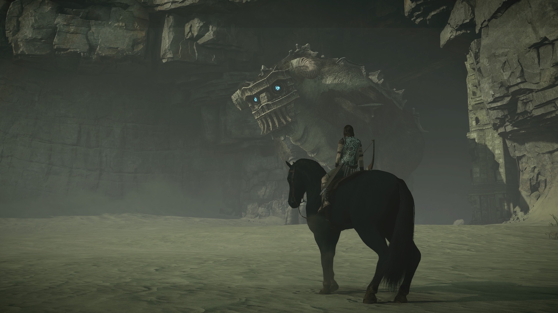 Nie ma drugiego takie uczucia niż to gdy stajesz oko w oko z pierwszym Kolosem. Chociaż jako gracze przyzwyczajeni jesteśmy do walki z bossami, którzy są od nas więksi, tak nie ma drugiej takiej gry jak Shadow of the Colossus. Wielki stwór przewyższa nas wielokrotnie, jakby chciał mógłby nas po prostu zgnieść. Aby powalić bestię musimy najpierw wpaść na pomysł jak na nią w ogóle wejść. Musimy zaobserwować jej ruchy, sposób chodzenia. Jak już znajdziemy dogodne wejście na grzbiet stwora rozpocznie się poszukiwanie czułych punktów na jego ciele. Te świecą się na niebiesko, ale tylko jeśli się do nich zbliżymy. Oznacza to, że Kolos nie świeci się z daleka i nie ma na ciele wielkiej strzałki “bij tutaj by mnie zabić”.