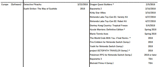 Na koniec lista nadchodzących produkcji wydawanych przez Nintendo. Potwierdzono w niej, że gry z serii Fire Emblem i Yoshi trafią na Nintendo Switch jeszcze w tym roku. Pokémon RPG dla Nintendo Switch ma szansę zadebiutować w 2018, jednak ta data na ten moment nie jest jeszcze pewna. Bayonetta 3 i Metroid Prime 4 oznaczone pozostają jako TBA. Posiadacze Nintendo 3DS niestety nie mogą się tym razem nastawiać na nawał premier. Zapowiedziano na chwilę obecną tylko dwa tytuły: Detective Pikachu oraz Sushi Striker: The Way of Sushido.