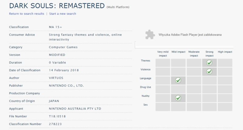 Według australijskiego systemu klasyfikacji gier, port gry Dark Souls: Remastered dla Nintendo Switch przygotowywany jest przez chińskie studio Virtuos. W tym samym wpisie możemy przeczytać, że wydawcą tej edycji będzie Nintendo.