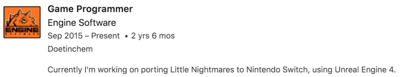 Na profilu jednego z programistów w serwisie LinkedIn można przeczytać dość ciekawą informację dotyczącą tej produkcji. Rzekomo pracuje on obecnie nad portem Little Nightmares dla Nintendo Switch, wykorzystując do tego silnik Unreal Engine 4.