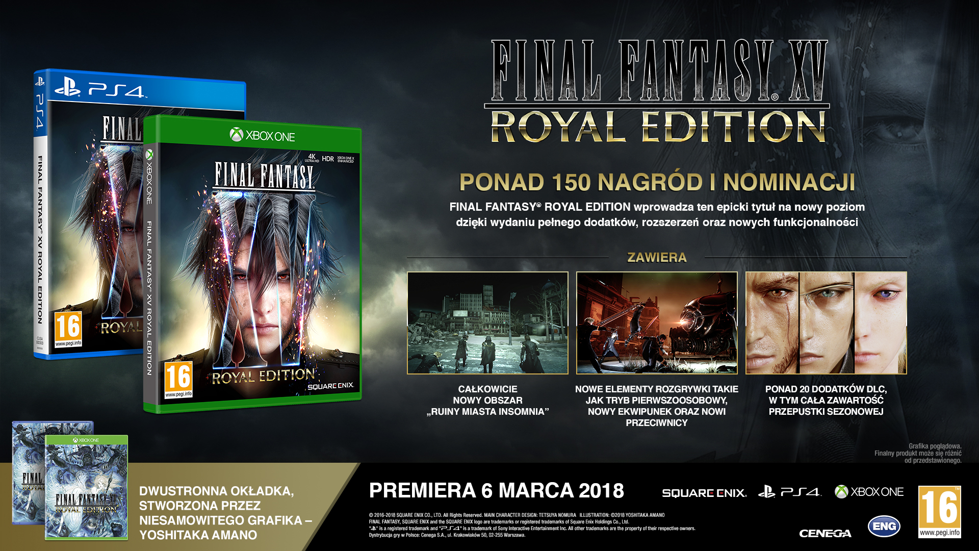 Cenega, oficjalny partner Square Enix w Polsce, Czechach, na Słowacji oraz na Węgrzech z przyjemnością przypomina, że za tydzień, 6 marca, na półki sklepowe trafi kompletne wydanie Final Fantasy XV – najnowszej części kultowej serii jRPG. Gra ukaże się w angielskiej wersji językowej w wydaniach Final Fantasy® XV Royal Edition na konsole Xbox One i PlayStation®4