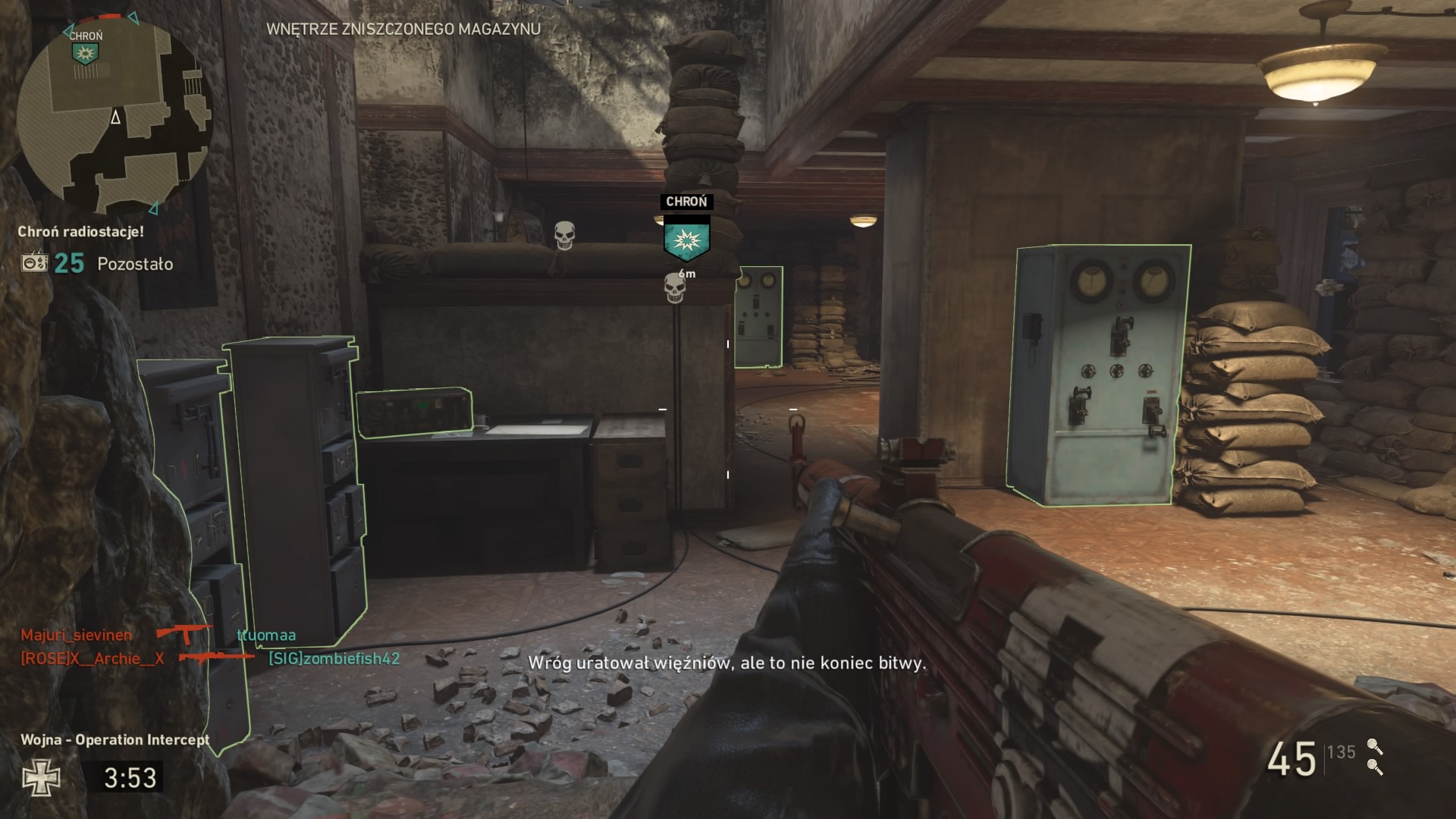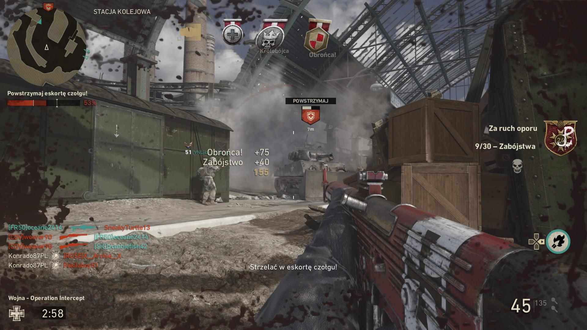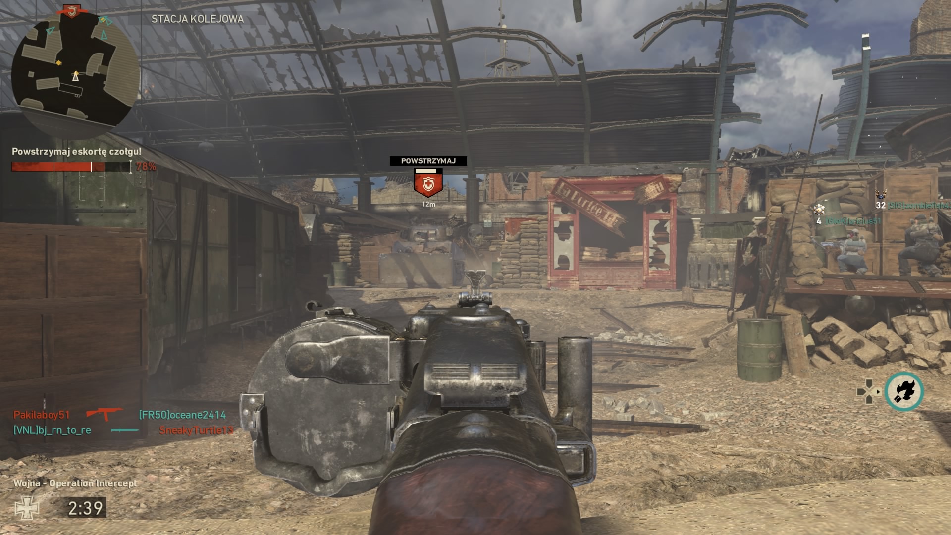 W wspomnianej Operation Neptun po zdobyciu dwóch bunkrów atakowaliśmy kolejny w którym było 10 stacji radiowych do zniszczenia. Po uwolnieniu zakładników, drugim celem w nowej wojennej misji jest zniszczenie 25… stacji radiowych. Czujecie to? Nie 10, ale już 25. Stacje są różnych wielkości, małe radia na stolach lub wielkie szafy, które są rozmieszczone na parterze i pierwszym pietrze zniszczonego budynku. Jednak to nie ilość stacji potrzebnych do zniszczenia, ale ich odnalezienie jest największym problemem. Stacje mienią się na zielono lub czerwono (te uszkodzone) gdy jesteśmy w budynku i patrzymy na nie. Straszny kocioł robi się i wkrada się dezorientacja, gdy do wykonania celu zostają dwie lub jedna do zniszczenia, a gracze biegają po tym budynku i nie mogą ich znaleźć. Przy tak dużej ilość sprzętu do zniszczenia i tylko czterech minutach na wykonanie zadania deweloper jednak powinien lepiej oznaczyć radia zarówno dla drużyny broniącej, jak i atakującej. Trzecim etapem jest… a jak! eskortowanie czołgu! Coś co dobrze znamy z trzecich etapów Operation Breakout i Gryffin. Naprawdę pukam się w czoło i próbuje zrozumieć, po co trzeci raz na czterech mapach w trybie wojny umieszcza się to samo zadanie. Tym razem czołg który eskortujemy musi zatrzymać, właściwie zepchnąć z torów lokomotywę z wagonami wypełnionymi amunicją i uprowadzonymi członkami Ruchu Oporu. W tym miejscu chciałbym zaznaczyć, że animacja prezentująca wypchnięcie pociągu z torów po pomyślnym wykonaniu misji jest naprawdę słaba. Słabe jest także to, że drużyna atakującą jest mocno ograniczona i nie może wybiegać przed czołg, aby flankować drużynę biorącą między wagonami (finał jest na stacji kolejowej). Podobnie, jak w Operation Gryffin i tutaj drużyna broniąca ma do dyspozycji kilka LKMów, które musi zbudować, a atakujący tylko wąską drogą muszą przemieszczać się za czołgiem Końcówka to jeden wielki chaos, deszcze granatów i ostrzałów z LKMów. Podsumowując jestem bardzo rozczarowany Operation Intercept, nie ma tutaj żadnych innowacji, a jedynie kalki pomysłów z poprzednich map, nie tego się oczekuje po nowej zawartości do gry, która przecież w Call of Duty do tanich nie należy.