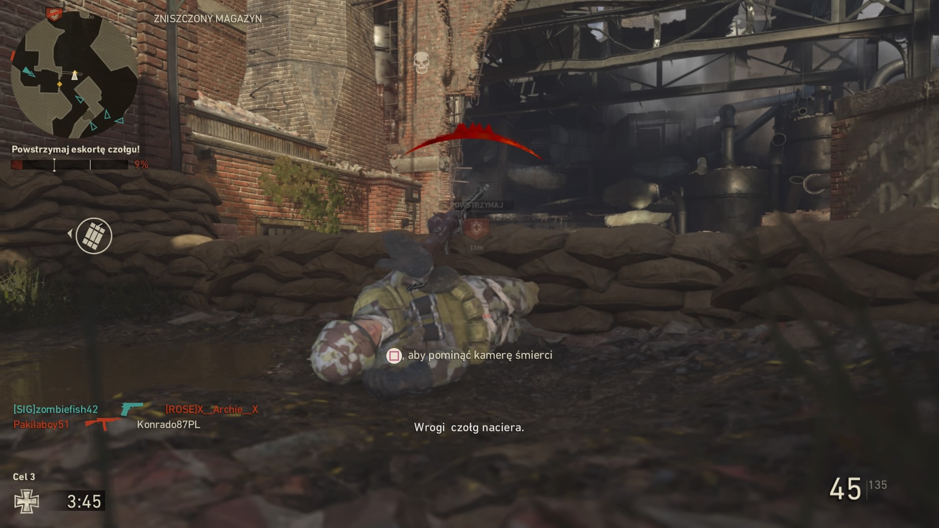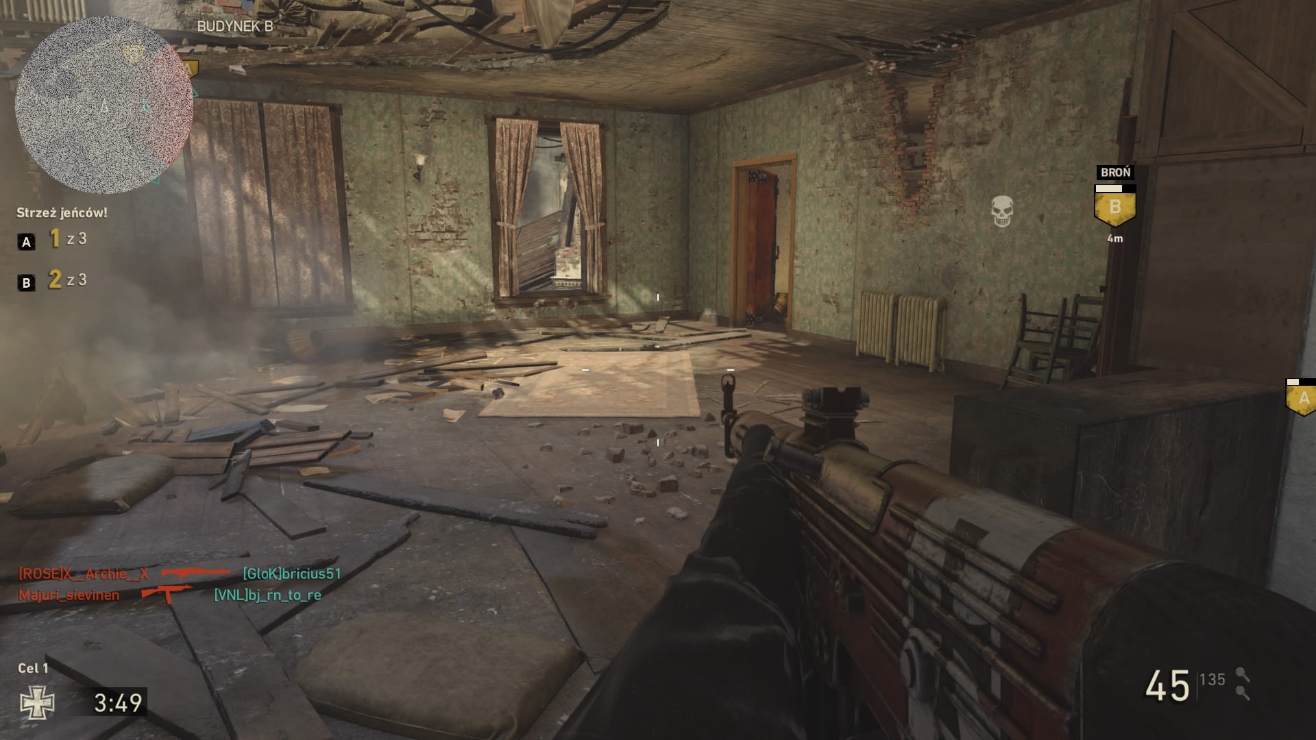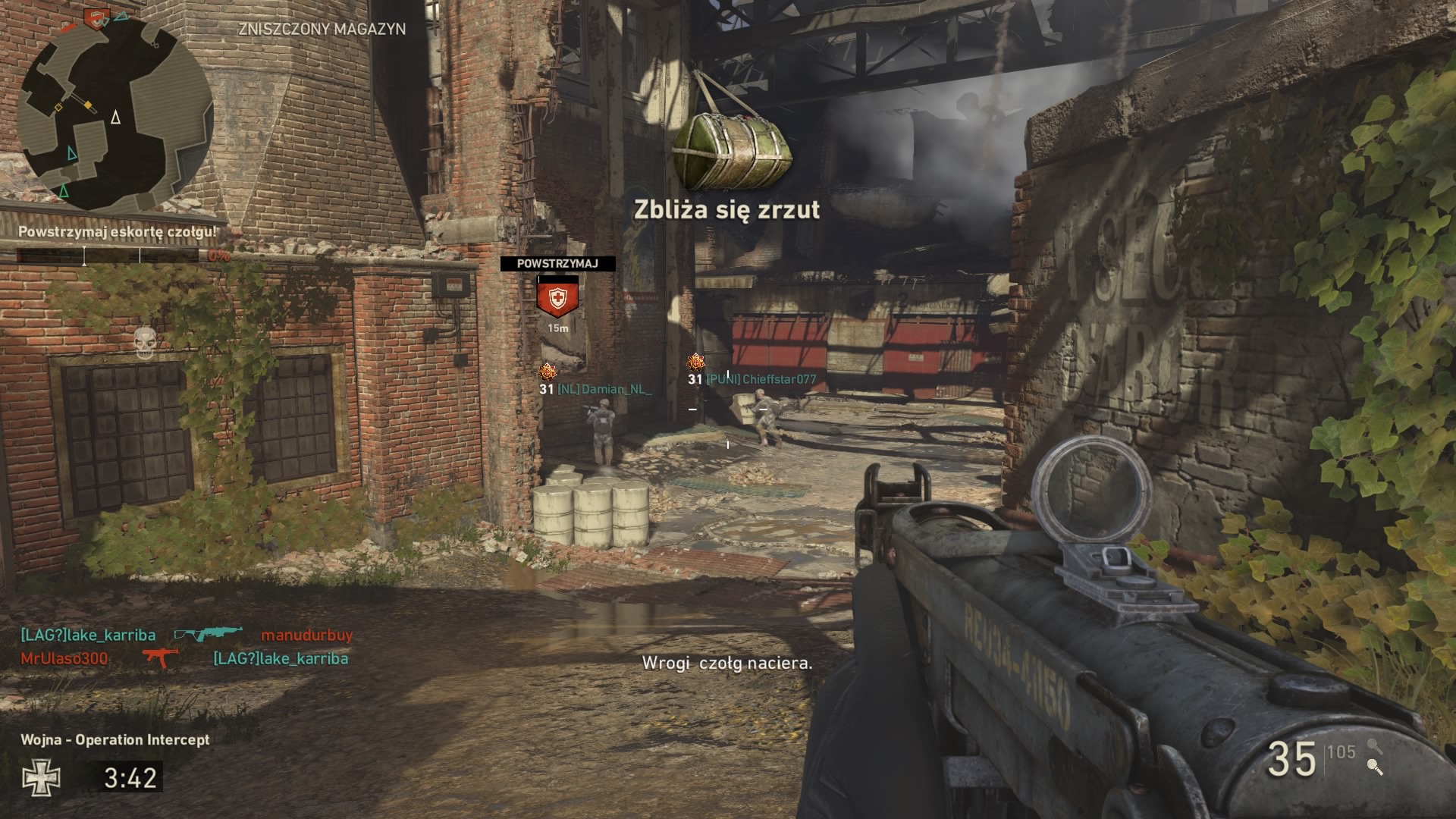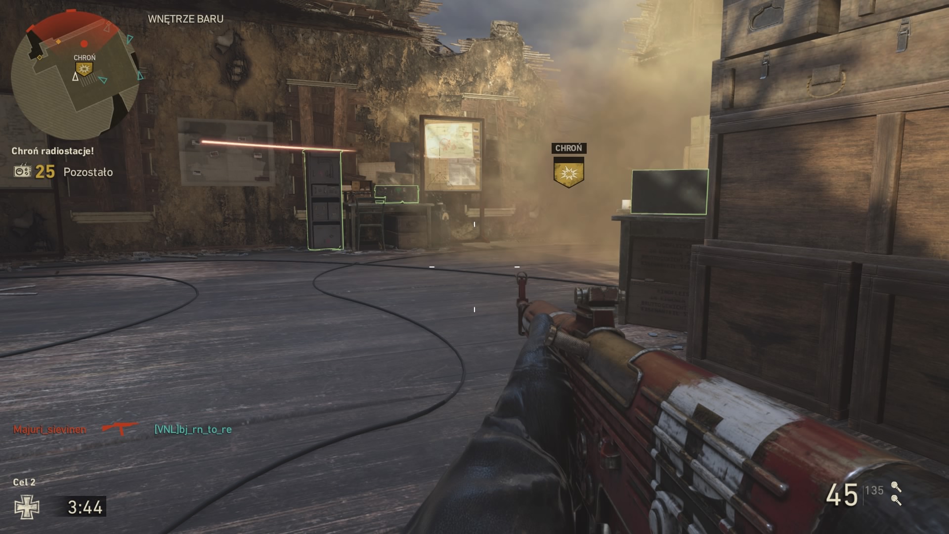 W wspomnianej Operation Neptun po zdobyciu dwóch bunkrów atakowaliśmy kolejny w którym było 10 stacji radiowych do zniszczenia. Po uwolnieniu zakładników, drugim celem w nowej wojennej misji jest zniszczenie 25… stacji radiowych. Czujecie to? Nie 10, ale już 25. Stacje są różnych wielkości, małe radia na stolach lub wielkie szafy, które są rozmieszczone na parterze i pierwszym pietrze zniszczonego budynku. Jednak to nie ilość stacji potrzebnych do zniszczenia, ale ich odnalezienie jest największym problemem. Stacje mienią się na zielono lub czerwono (te uszkodzone) gdy jesteśmy w budynku i patrzymy na nie. Straszny kocioł robi się i wkrada się dezorientacja, gdy do wykonania celu zostają dwie lub jedna do zniszczenia, a gracze biegają po tym budynku i nie mogą ich znaleźć. Przy tak dużej ilość sprzętu do zniszczenia i tylko czterech minutach na wykonanie zadania deweloper jednak powinien lepiej oznaczyć radia zarówno dla drużyny broniącej, jak i atakującej. Trzecim etapem jest… a jak! eskortowanie czołgu! Coś co dobrze znamy z trzecich etapów Operation Breakout i Gryffin. Naprawdę pukam się w czoło i próbuje zrozumieć, po co trzeci raz na czterech mapach w trybie wojny umieszcza się to samo zadanie. Tym razem czołg który eskortujemy musi zatrzymać, właściwie zepchnąć z torów lokomotywę z wagonami wypełnionymi amunicją i uprowadzonymi członkami Ruchu Oporu. W tym miejscu chciałbym zaznaczyć, że animacja prezentująca wypchnięcie pociągu z torów po pomyślnym wykonaniu misji jest naprawdę słaba. Słabe jest także to, że drużyna atakującą jest mocno ograniczona i nie może wybiegać przed czołg, aby flankować drużynę biorącą między wagonami (finał jest na stacji kolejowej). Podobnie, jak w Operation Gryffin i tutaj drużyna broniąca ma do dyspozycji kilka LKMów, które musi zbudować, a atakujący tylko wąską drogą muszą przemieszczać się za czołgiem Końcówka to jeden wielki chaos, deszcze granatów i ostrzałów z LKMów. Podsumowując jestem bardzo rozczarowany Operation Intercept, nie ma tutaj żadnych innowacji, a jedynie kalki pomysłów z poprzednich map, nie tego się oczekuje po nowej zawartości do gry, która przecież w Call of Duty do tanich nie należy.