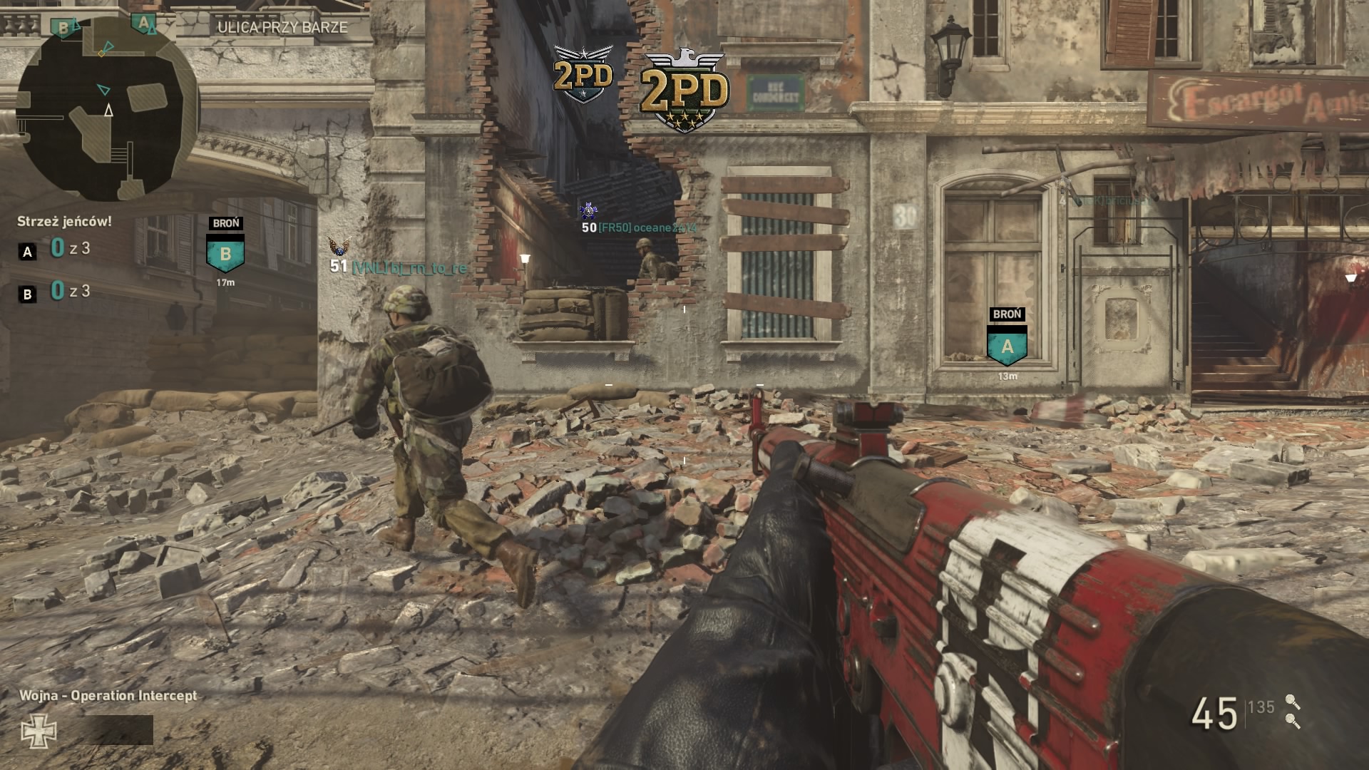 W mojej recenzji bardzo zachwycałem się nowym trybem wojna, który został dodany do Call of Duty: WWII, wszyscy zainteresowani znają już jego zasady, więc nie ma sensu tutaj go opisywać, a tych którzy jeszcze nie grali odsyłam do mojej recenzji. Operation Intercept ma miejsce na obrzeżach miasta St. Lo we Francji. Zadaniem atakujących Aliantów jest uwolnienie sześciu członków Ruchu Oporu, zakładnicy są przejmowani w dwóch pokojach po trzy osoby. Zarówno otwarcie drzwi, jak i uwolnienie zakładnika trwa kilka sekund (gracz musi przytrzymać kwadrat) więc, aby cel ten został wykonany, współpracować musi ze sobą kilku graczy, a jak wiemy w Call of Duty bywa z tym bardzo rożnie. Pierwszy cel tej misji oceniam bardzo pozytywnie, ponieważ wymaga ścisłej kooperacji i współpracy od graczy, trzeba szybko podjąć decyzje, czy dzielimy się na dwie trójki i atakujemy oba cele, czy większością idziemy na punkt A, a dopiero potem na B. Niestety Operation Intercept nie wnosi żadnych innowacji do trybu wojny, bo atak na dwa pokoje, to nic innego, jak przejmowanie bunkrów w Operation Neptun. Dalej jest niestety tylko gorzej i deweloper umieścił kolejne kalki z podstawki w swoim dodatku.