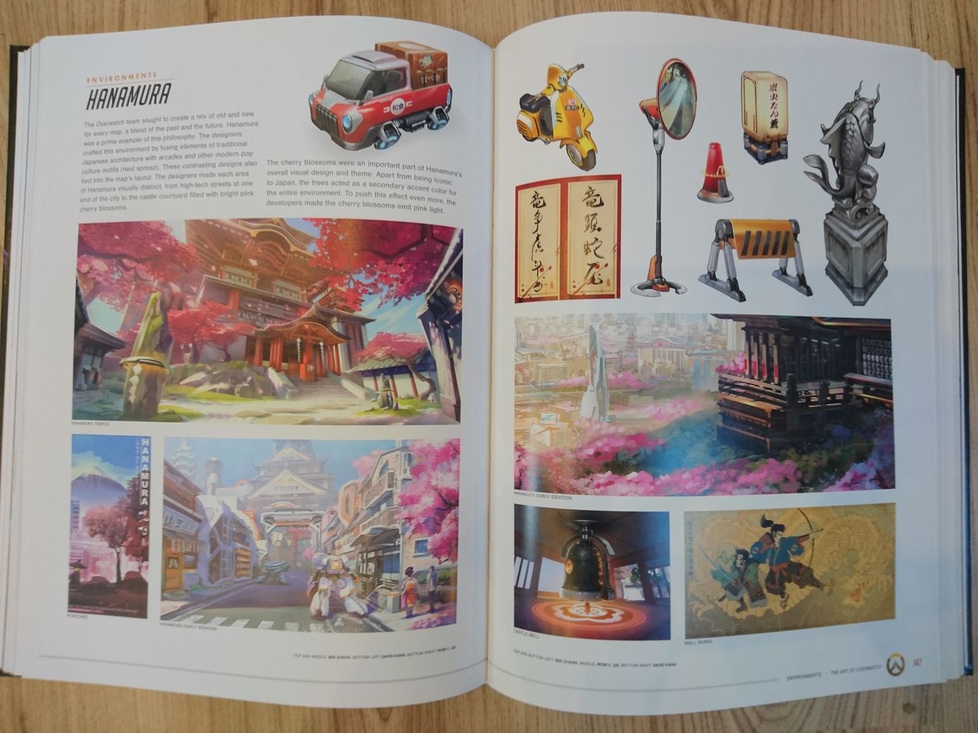 Każdemu bohaterowi zostaje poświęcona odpowiednia ilość stron, niektórzy posiadają w opisach elementy swoich historii oraz jak wydarzenia w uniwersum wpłynęły na ich postrzeganie świata, a u innych mamy opisy jak zespół Overwatch starał się ukazać indywidualne cechy każdej z postaci. No i oczywiście grafiki i szkice, które uświadamiają jak daleką drogę przeszła sama gra, jeśli chodzi o design niektórych postaci (fani Mercy lub Mei mogą być zaskoczeni tym jak zmieniły się te bohaterki). Sama, jakość grafik jest powalająca, gdzie niektóre aż chcę się wydrukować i powiesić w domu, co potwierdza starą zasadę, że artbooki od Blizzarda to, jakość sama w sobie. Mógłbym to samo napisać o rozdziale poświęconym mapom, gdzie w parze z oprawą wizualną idą merytoryczne opisy tego, jaka była koncepcja każdej z map, oraz jak prostymi zabiegami łączono tradycje z nowoczesnością czy nawet takie błahostki jak gra światła i cienia czy czas, jaki panuje na danej mapie, by każda z nich była unikalna oraz jedyna w swoim rodzaju. Na deser serwuje się czytelnikom, nie tylko streszczenie najważniejszych wydarzeń z lore gry od powstania organizacji Overwatch, aż po Kryzys Omniczny czy sławną dzięki eventowi Insurekcje. Do tego można jeszcze doliczyć rozdziały o legendarnych skórkach dla postaci, gdzie otrzymujemy wyjaśnienia, co kierowało projektantami podczas ich tworzenia, chronologicznie ułożone eventy, które były obecne w grze skończywszy na pokazaniu wszystkich sprejów dla postaci czy obrazków avatarów dla graczy. Na ostatnich stronach otrzymujemy także wszystkie grafiki promujące tytułu i to one idealnie wpisują się w chęć dekorowania domu obrazkami z gry.