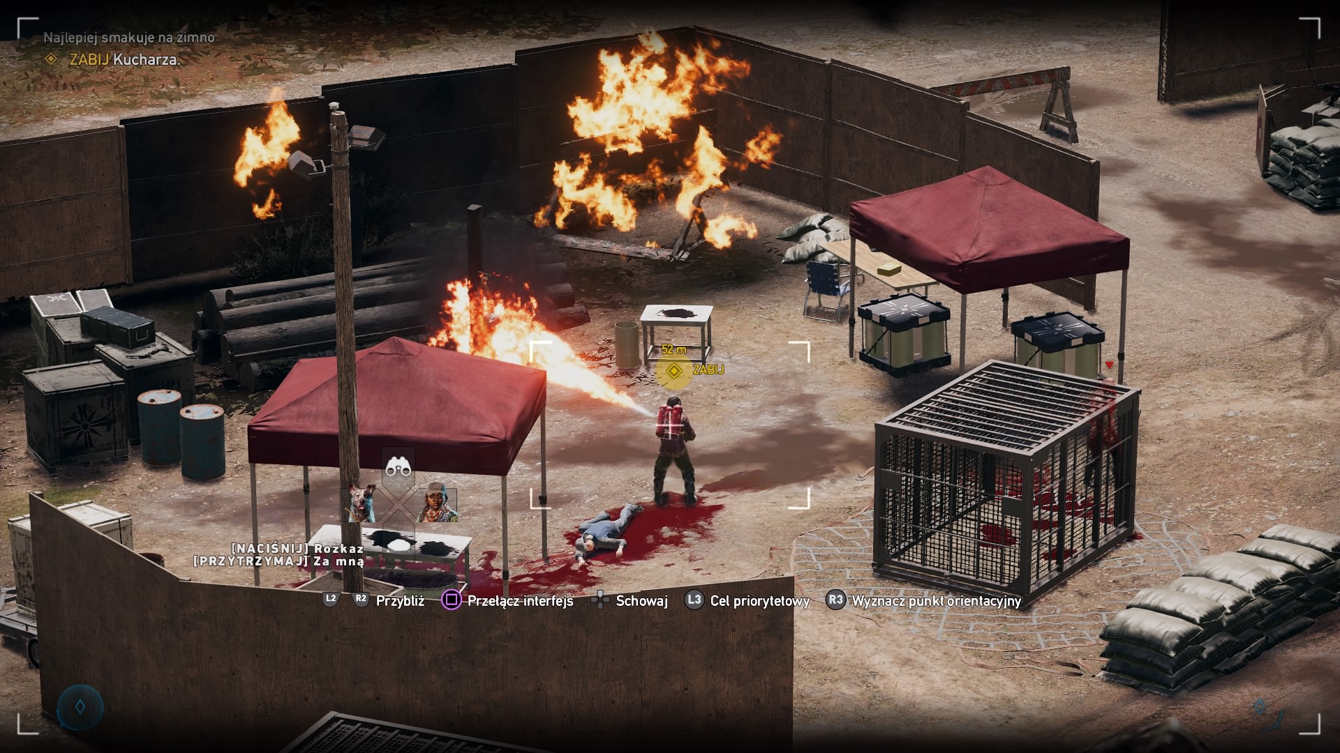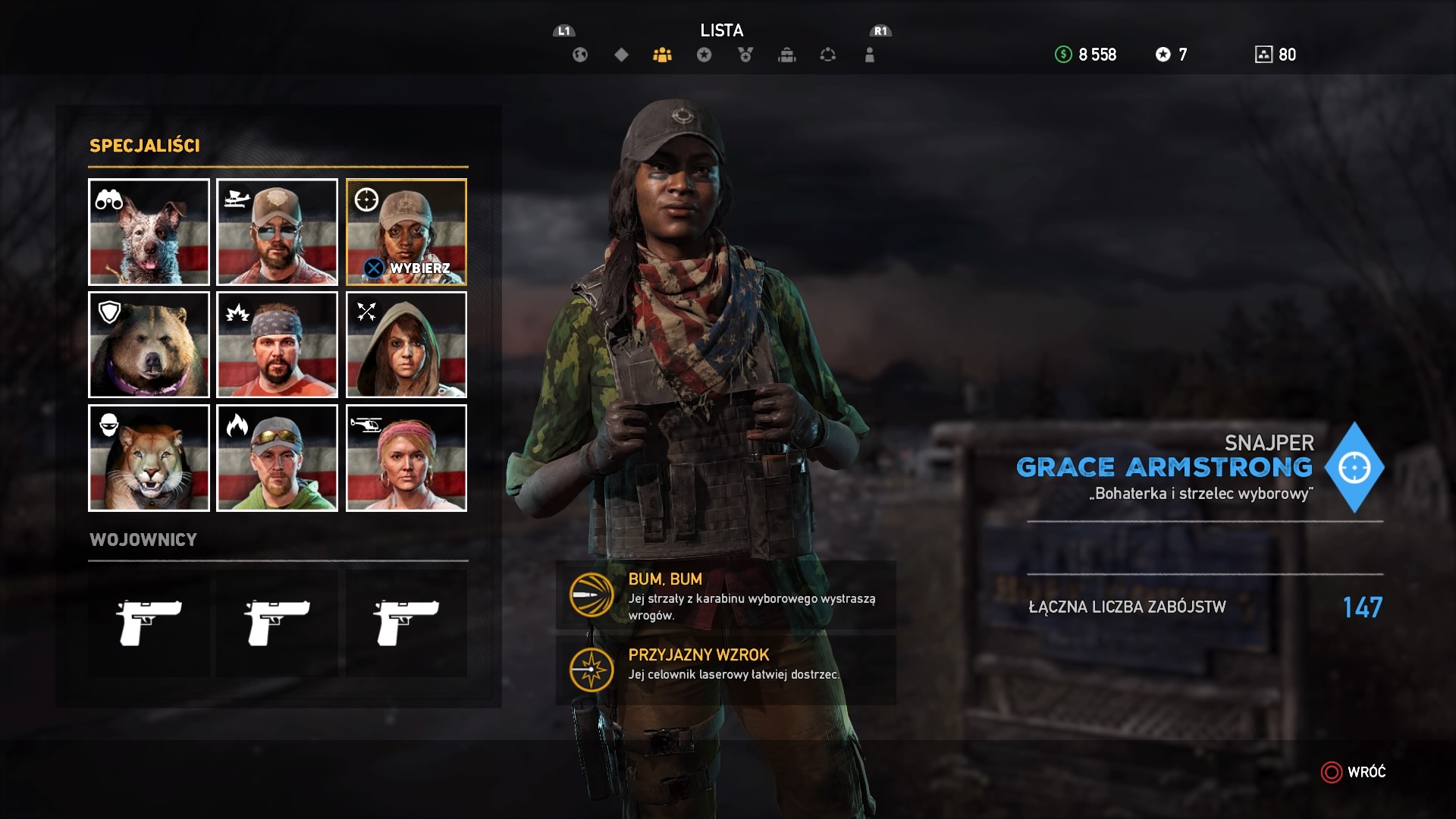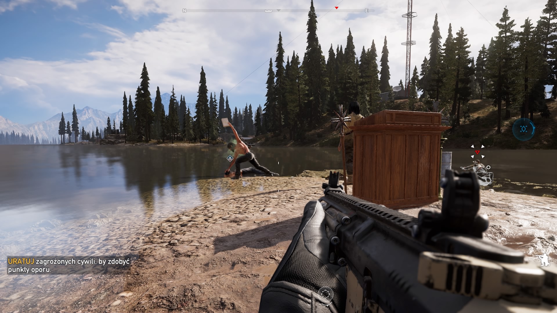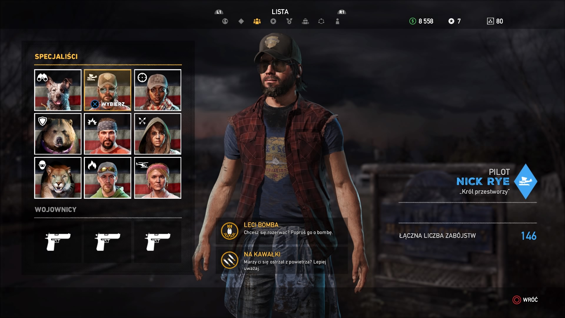 Pojedynczy gracz w Far Cry 5 nie będzie się ani przez chwile nudził, a tym bardziej grał sam. Po całej Montanie rozmieszczono dziewięć strzelb i kłów do wynajęcia. Pierwsi to ludzie, a kły to zwierzęta, które musimy uwolnić, albo wykonać dla nich kilka misji, zanim ci zaczną dla nas pracować. Towarzyszyć nam może tylko dwóch kompanów. Pomocnicy są bardzo różni i możemy między nimi przebierać w ramach preferowanego przez nas stylu gry. Słynny już pies Boomer nie tylko przyniesie nam karabin przeciwnika, ale dzięki dobremu węchowi pokaże nam pobliskich kultystów oraz zwierzęta. Podczas przechodzenia kampanii starałem się kilka misji ukończyć po cichu, wiec w tym celu zatrudniłem dwie kobiety, jedna z nich świetnie posługuje się karabinem wyborowym, druga lukiem. Natomiast przy bardziej wybuchowych akcjach korzystałem z pomocy Nicka, który ostrzeliwał i rzucał bomby z hydroplanu (samolot, który potrafi lądować na wodzie) oraz Hurka, który nie rozstaje się ze swoją wyrzutnią rakiet. Nasi kompani nie są nieśmiertelni, podobnie postać gracza, gdy ktoś zostanie powalony, to otrzymujemy kilka sekund na jego reanimacje. Gdy nam to się nie uda, to nasz towarzysz jest zablokowany na 20 minut. Kompanów możemy zmieniać w dowolnym momencie, możemy wydawać im także proste komendy, przykładowo wciśnięty raz krzyżak w lewo wraz z nacelowaniem będzie oznaczał atak na tego przeciwnika. Natomiast przytrzymanie krzyżaka w lewo oznacza, że kompan porusza się tuz obok nas i atakuje dopiero, gdy coś nas zaatakuje.