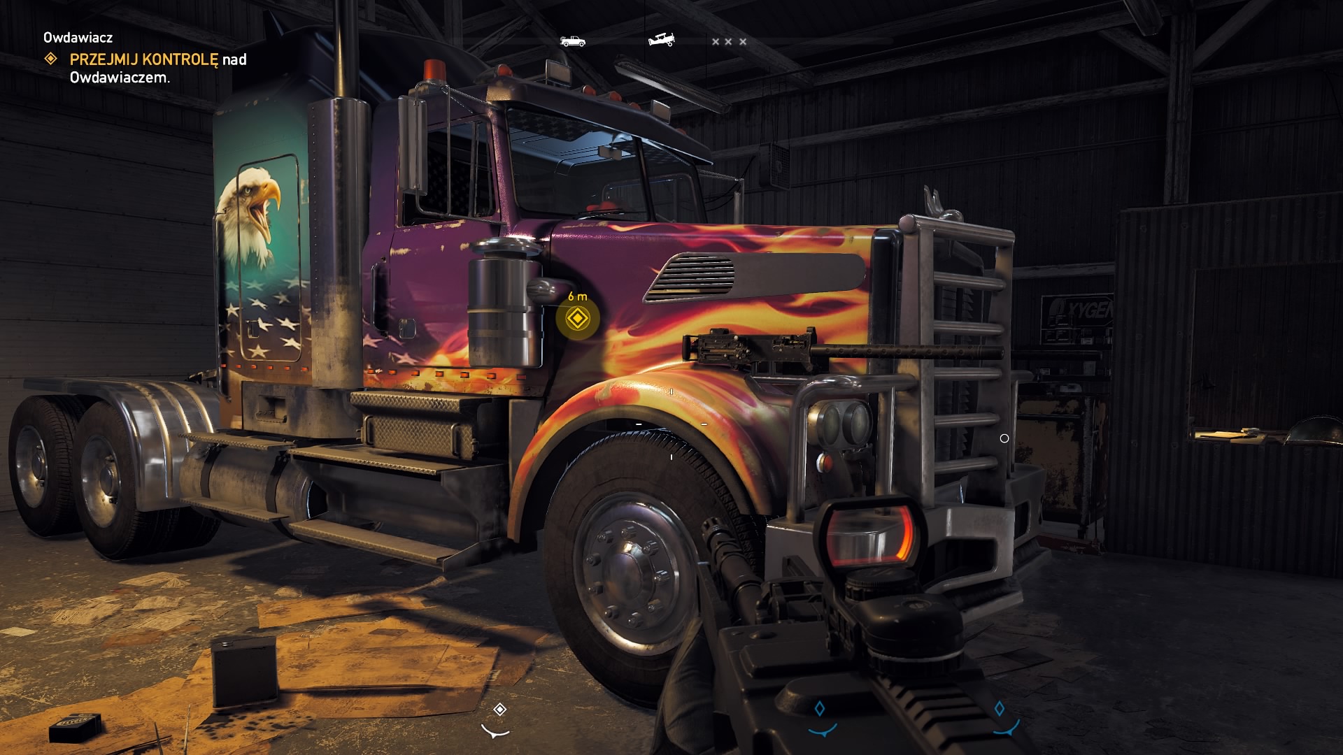 Sporo pojazdów drogowych i powietrznych posiada wersje prestiżowe, czyli mają fantastyczne malowanie, a kilka z nich ma zamontowane jakieś bronie typu karabin maszynowy – szczególnie pickupy. Takie pojazdy są dwa razy droższe od normalnych. Moim faworytem została ciężarówka pokryta pięknym lakierem z płomieniami oraz orłem w tylnej części, a nad reflektorami ma zamontowane karabiny maszynowe, których używamy naciskając L1. Demolowanie tym kolosem pojazdów sekty dawało mi wiele radości, tylko szkoda, że w polskiej wersji wydawca zdecydował się tłumaczyć nazwy tych prestiżowych aut. I tak moja ciężarówka z oryginalnej wersji “widowmaker” w polskiej została “owdawiaczem”. O ile samo tłumaczenie można uznać za poprawne, to osobiście wolałbym, aby w takich przypadkach nie ruszano oryginalnych nazw, ale z drugiej strony duże brawa dla naszego oddziału Ubisoft, bo opisy broni i pojazdów są potraktowane specyficznym humorem.