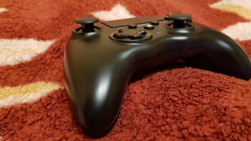 Kontroler nie ma niestety świecącego Lightbara, czyli nie wspólpracuje z PSVR. Z tyłu kontrolera znalazło się tylko gniazdo micro-USB do ładowania urządzenia – niestety kabla USB nie ma w zestawie. Bumpery i Triggery są także charakterystyczne dla kontrolera Microsoftu. Przyciski R1/L1 są długie i bardzo łatwo w nie trafić, niestety trochę zastrzeżeń mam do przycisków R2/L2, które uważam, że są troszkę za małe. Grip pada od spodu wykonany jest z chropowatego plastiku i na moje dłonie szybko działał jak tarka, co obniżało komfort grania. Natomiast wielkim minusem jest brak gniazda na słuchawki – jacka 3.5mm, chciałbym wiedzieć, co kierowało producentem przy pomijaniu tego ważnego, przynajmniej przy grach wieloosobowych gniazda do komunikacji. Nie wszyscy mają słuchawki bezprzewodowe, a na pewno wszyscy maja przynajmniej zwykle słuchawki od smartonów, które można podłączyć do każdego DS4. Kontroler Onyx nie ma także głośniczka.