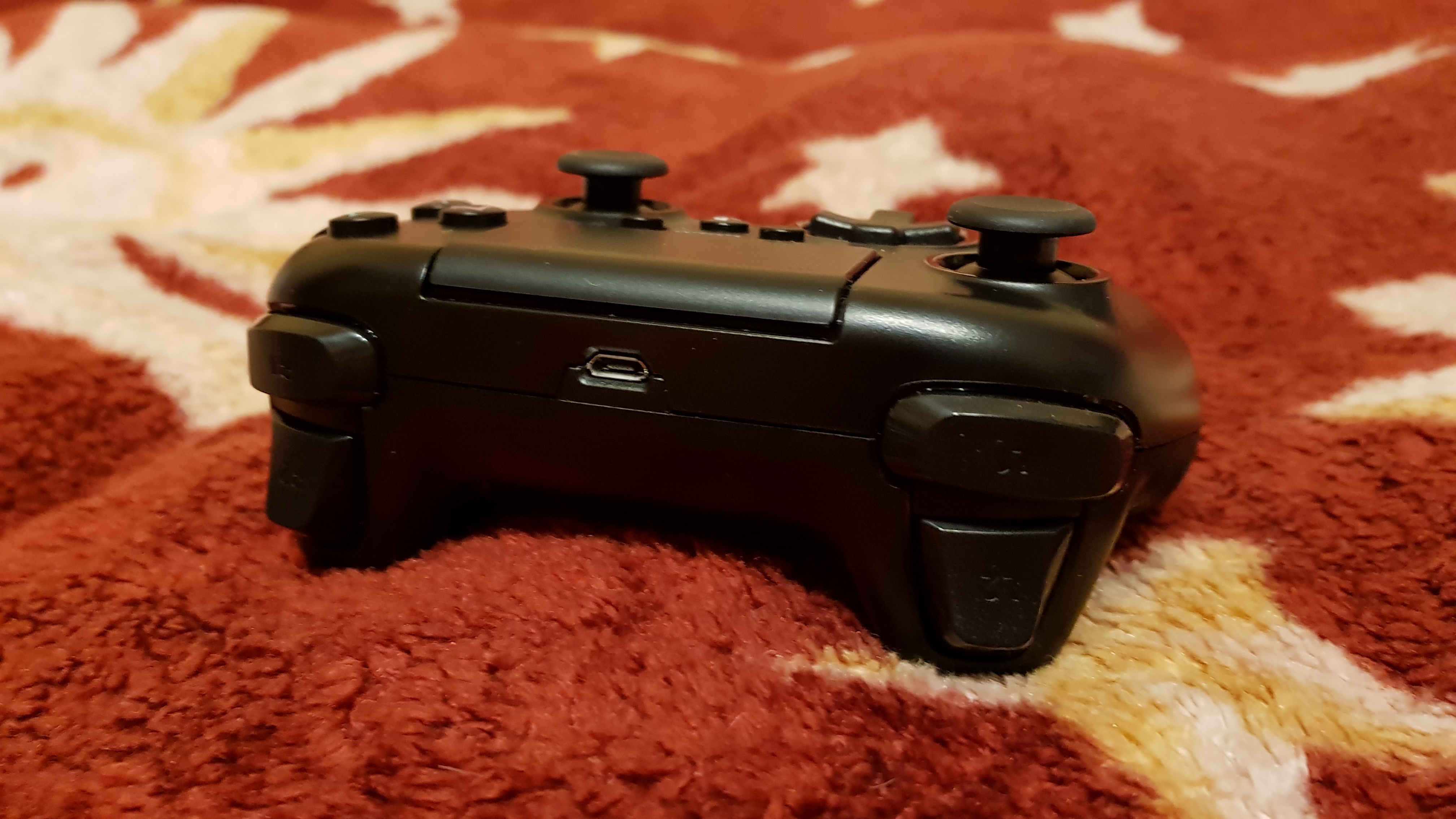 Kontroler nie ma niestety świecącego Lightbara, czyli nie wspólpracuje z PSVR. Z tyłu kontrolera znalazło się tylko gniazdo micro-USB do ładowania urządzenia – niestety kabla USB nie ma w zestawie. Bumpery i Triggery są także charakterystyczne dla kontrolera Microsoftu. Przyciski R1/L1 są długie i bardzo łatwo w nie trafić, niestety trochę zastrzeżeń mam do przycisków R2/L2, które uważam, że są troszkę za małe. Grip pada od spodu wykonany jest z chropowatego plastiku i na moje dłonie szybko działał jak tarka, co obniżało komfort grania. Natomiast wielkim minusem jest brak gniazda na słuchawki – jacka 3.5mm, chciałbym wiedzieć, co kierowało producentem przy pomijaniu tego ważnego, przynajmniej przy grach wieloosobowych gniazda do komunikacji. Nie wszyscy mają słuchawki bezprzewodowe, a na pewno wszyscy maja przynajmniej zwykle słuchawki od smartonów, które można podłączyć do każdego DS4. Kontroler Onyx nie ma także głośniczka.