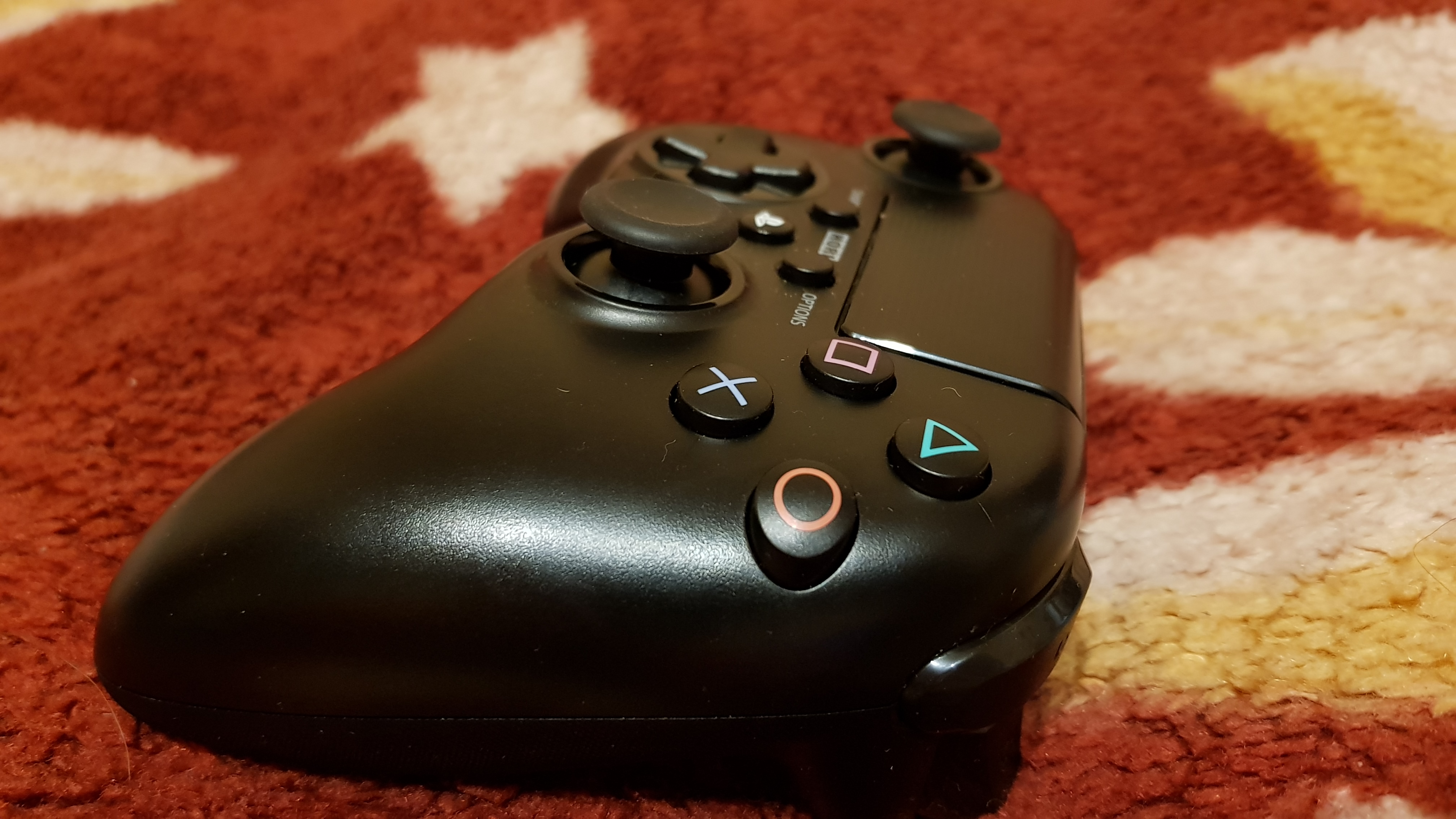 Pod Touchpadem znalazły się okrągłe przyciski “share” i “options”, a pod nim PS Button i dioda informująca o pracy kontrolera. Przyciski funkcyjne są duże i dobrze wykonane. D-Pad, czyli popularny krzyżak wykonany został podobną metodą, co w padzie Microsotu – D-Pad ma jednolita budowę i jest cały plastikowy. Analogi maja 6 mm wysokości i ich grzybki są wykonane całe z gumy, są troszkę wklęsłe, ale nie mają charakterystycznej otoczki, co oryginalne pady i przy dłuższym graniu kciuki zaczynają się na nich ślizgać.