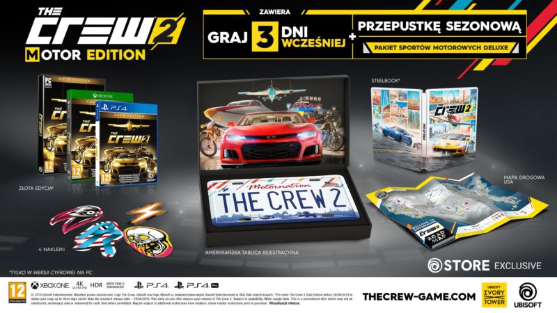 Firma Ubisoft ujawniła także The Crew 2 Motor Edition, która pozwala graczom zagrać na trzy dni wcześniej i przygotować się do nieograniczonej rywalizacji w dniu premiery – 26 czerwca. Ta unikatowa edycja jest dostępna wyłącznie w Ubisoft Store i daje graczom najbardziej kompletny zestaw wrażeń z dziedziny sportów motorowych. Motor Edition zawiera także: