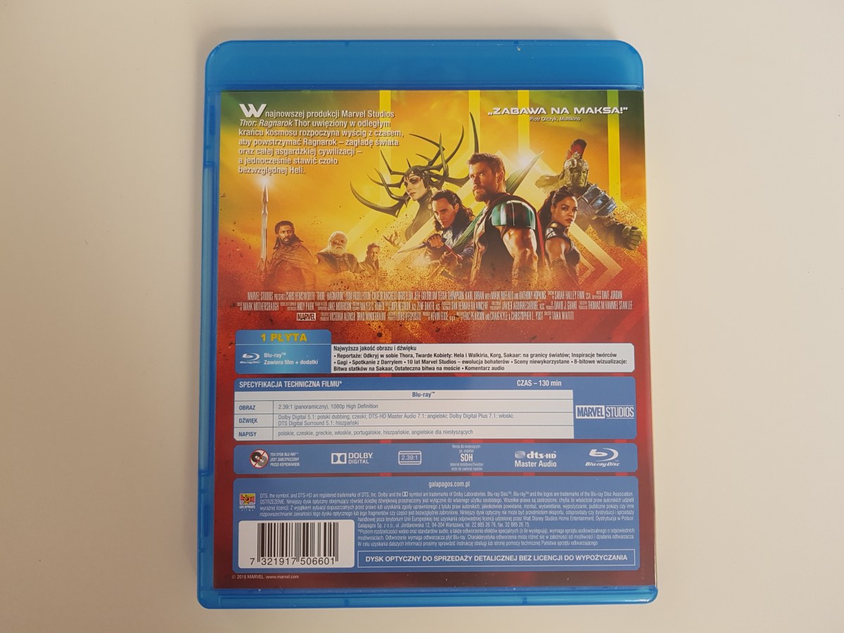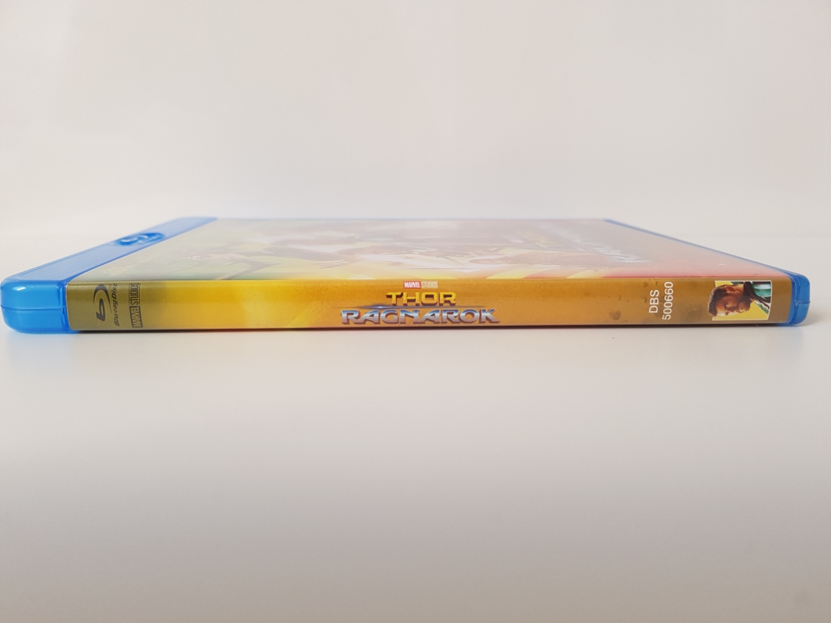 Opakowanie to jak zawsze standardowy model elite. Na froncie znajduje się grafika promocyjna filmu z logo oraz wymienionymi głównymi aktorami. Duże zastrzeżenie mam co do boku, który owszem posiada logo i kwadracik z sylwetką Thora, jednak wszystko jest umiejscowione na innej wysokości niż pierwsze dwa filmy, więc Ragnarok nie pasuje do poprzedników. Tył okładki jest dosyć ubogi, znajduje się na nim ta sama grafika, którą widzimy na froncie, z delikatnymi różnicami w rozmieszczaniu postaci. Menu wydania dostępne jest w języku polskim, a ogromnym plusem jest zawarta w nim piosenka, która już na starcie nastraja nas pozytywnie.
