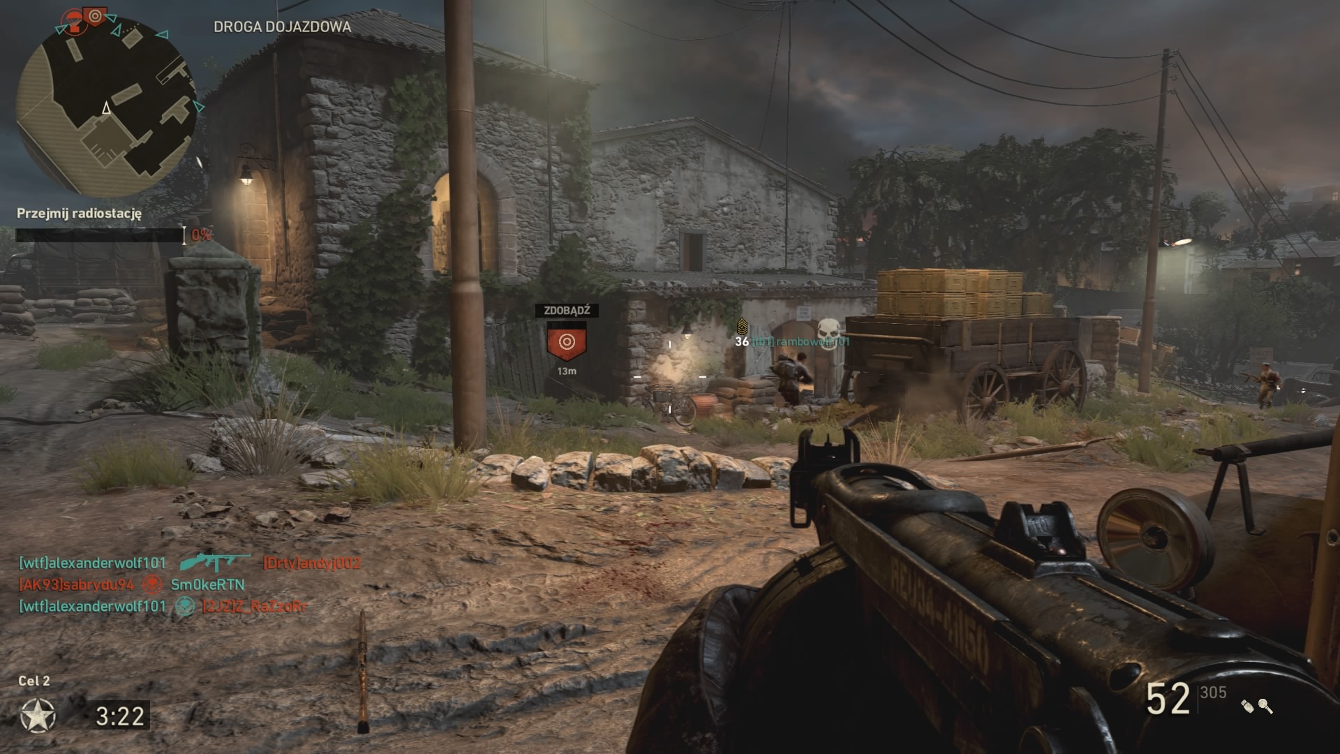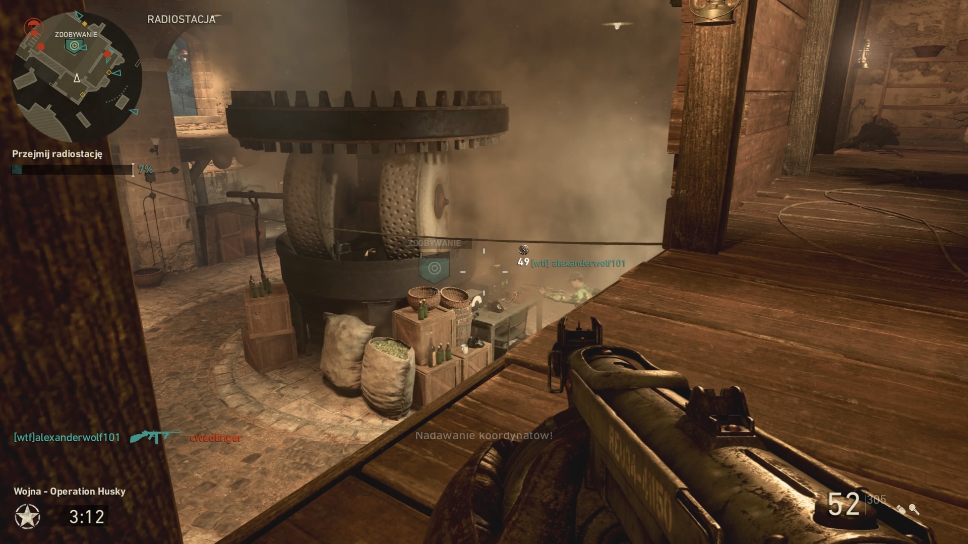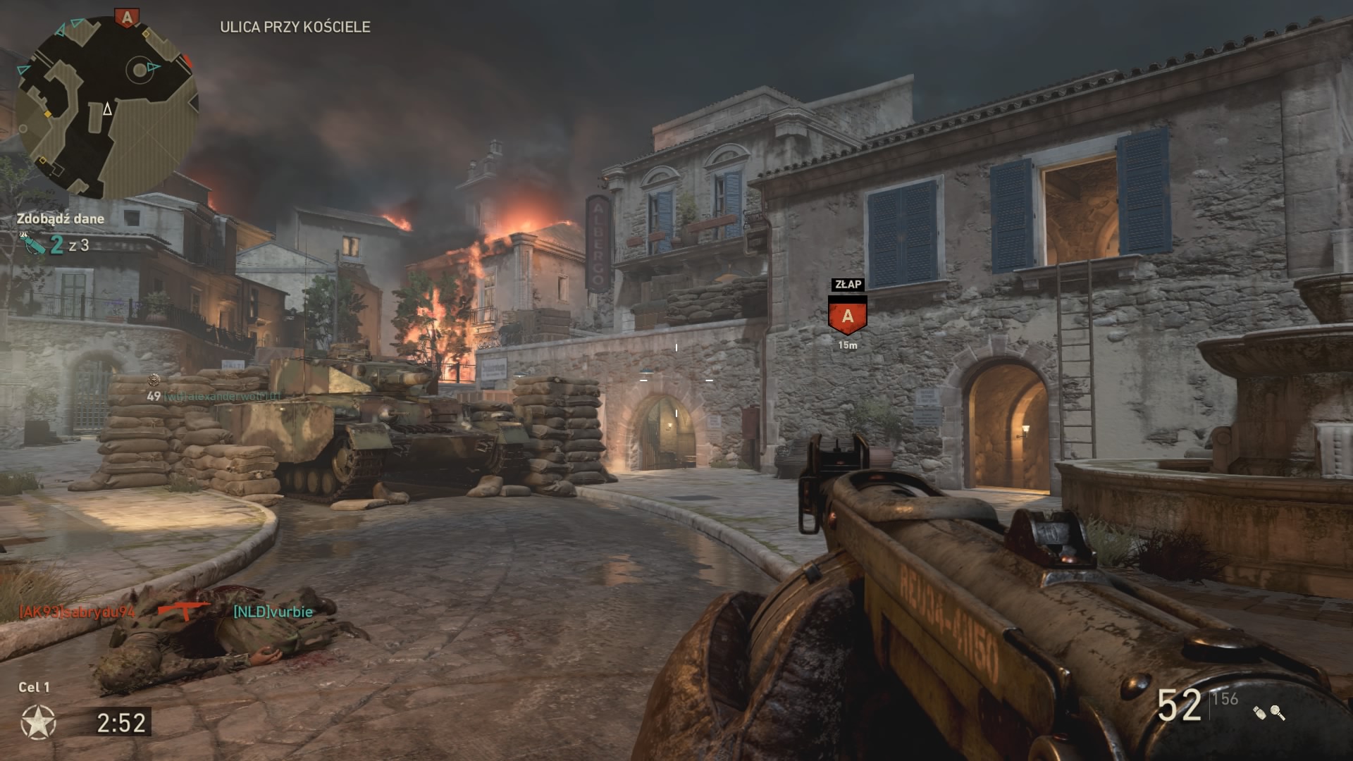 Recenzje The War Machine zacznę od nowej mapy do trybu wojna. Operacja Husky, czyli Alianci lądują na Sycylii. Drużyna atakująca musi wykraść trzy dokumenty z budynku strzeżonego przez Nazistów. Jeden dokument jest ukryty w piwnicy i dwa na parterze, dodatkowo obie strony otrzymują do dyspozycji na swoich respach w skrzynkach małe wsparcie. Dla Alintów są to koktajle Mołotowa, a drużyny broniącej mini pułapki z linkami, które mogą rozmieścić w przejściach. Zdobyty dokument Alianci muszą szybko dostarczyć do swojej bazy, gdy przyniosą trzy takie dokumenty, to rozgrywka przenosi się do kolejnego budynku – stacji radiowej. W tym miejscu strona atakująca trzymając się w pobliżu dużego nadajnika musi nadać komunikat o pozycjach wroga dla sojuszniczych samolotów. Gdy, to się uda, to pierwszy raz w historii Call of Duty strzelanie przenosi się w powietrze, zasiadamy za sterami samolotów z drugiej wojny światowej. O ile sam pomysł jest fajny i był dla mnie wielkim zaskoczeniem, ta sama bitwa jest… fatalna. Zacznijmy od sterowania, którego nie można zmienić. Nie rozumiem dlaczego, ale deweloper nie ustawił konfiguracji domyślnej dla samolotów, czyli jak wychylamy analog w dól (do siebie) to samolot leci do góry, tu niestety leci w dół przez co bardzo trudno było mi się poruszać w tej bitwie powietrznej. Drugi minus, to bardzo mały obszar, który przypomina akwarium dla złotej rybki i często na swoim ekranie widziałem komunikat, aby zawrócić, albo będzie boom. Granice mapy też nie są w żaden sposób określone, jedyne odniesienie, to mini mapa, na której trzeba unikać czerwonego pola. Trzeci minus, to całkowicie zbędne killstreaki. Gracz, który zdobędzie 200pkt może wezwać wsparcie artylerii przeciwlotniczej, a ta niszczy bardzo wielu graczy, więc wygrywa zazwyczaj drużyna, której gracz pierwszy odpali ten bonus.