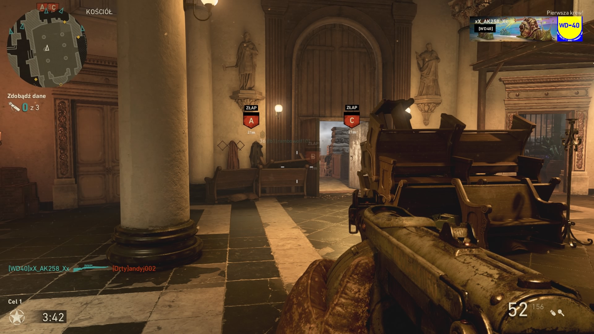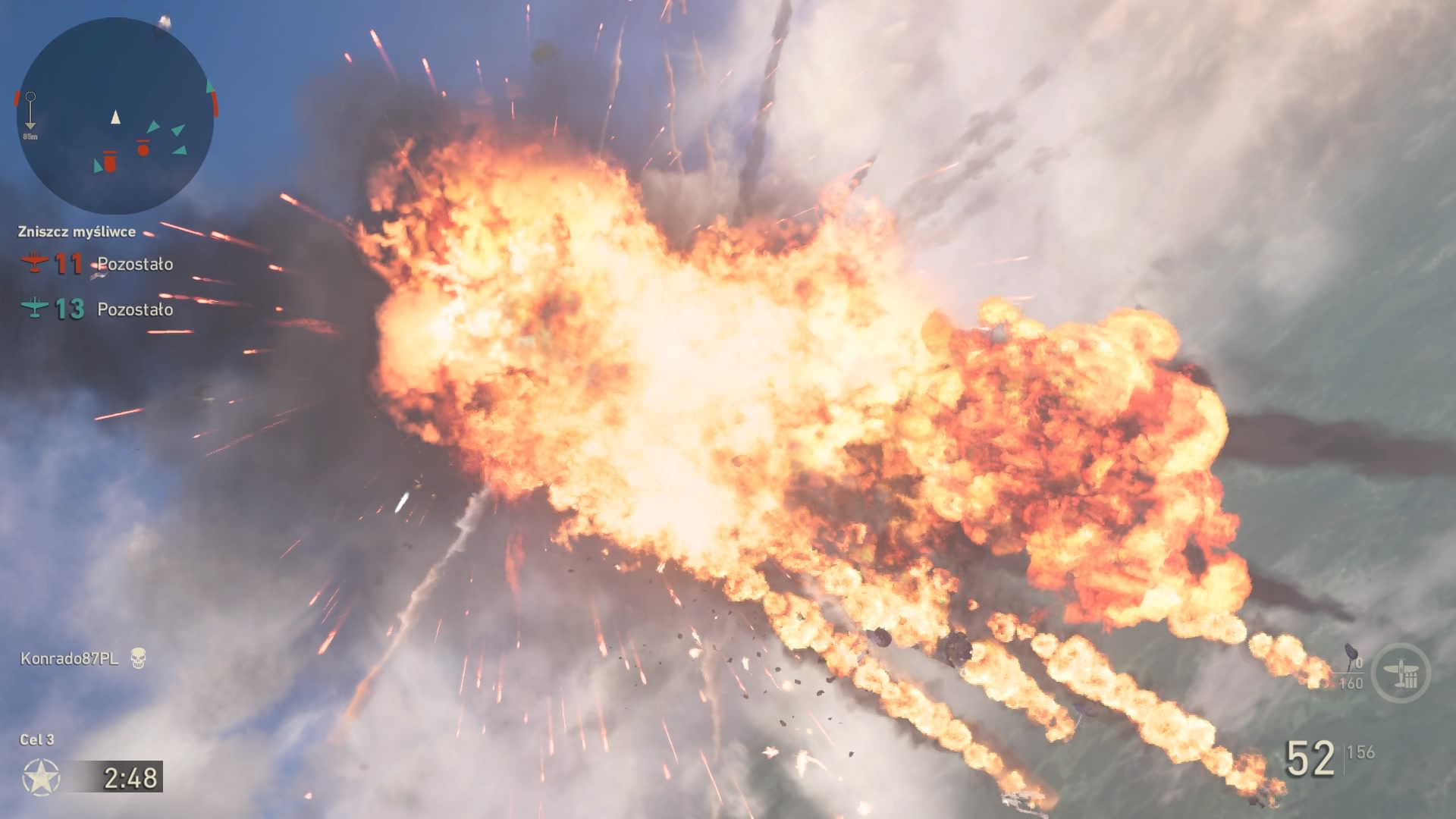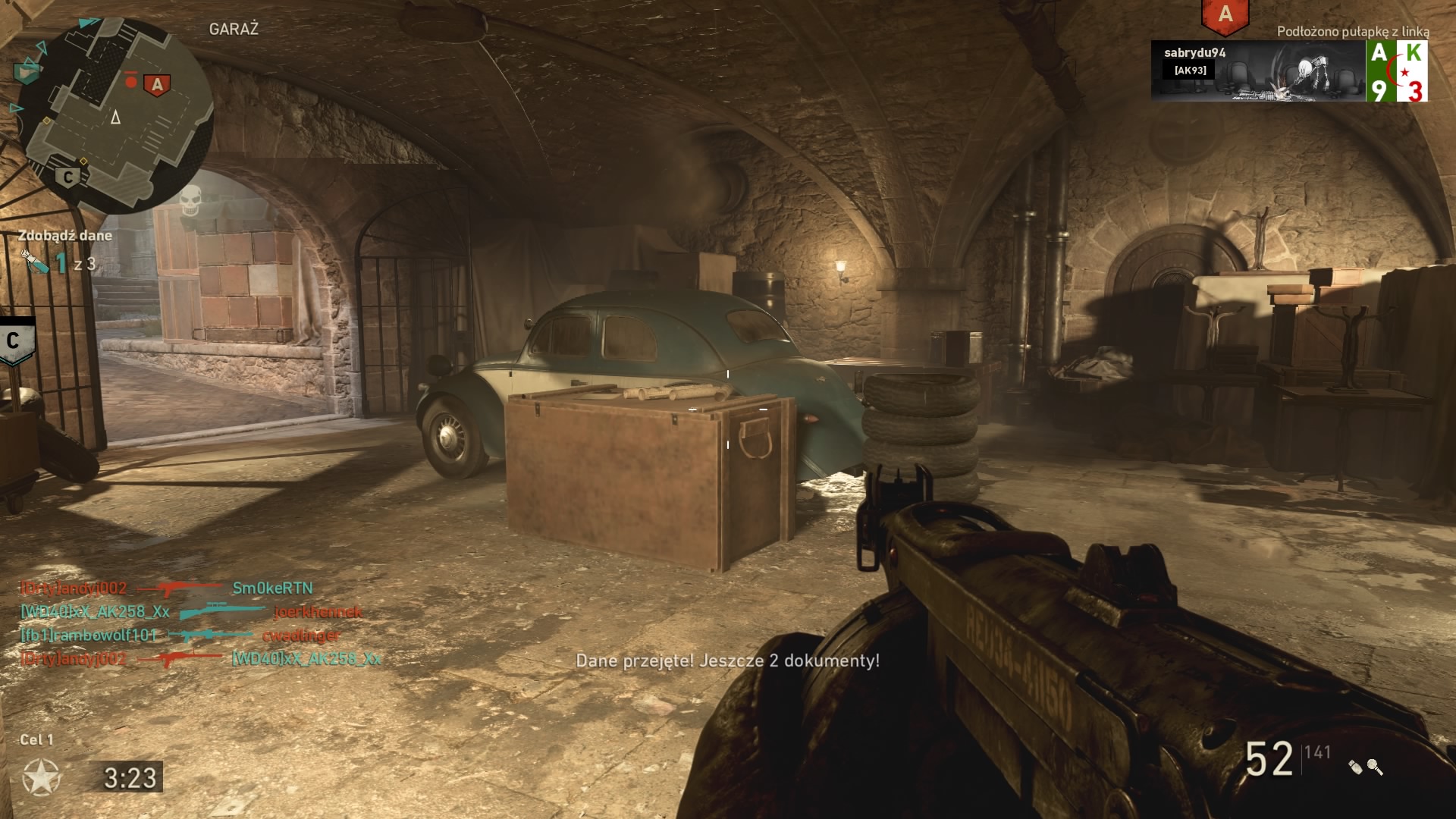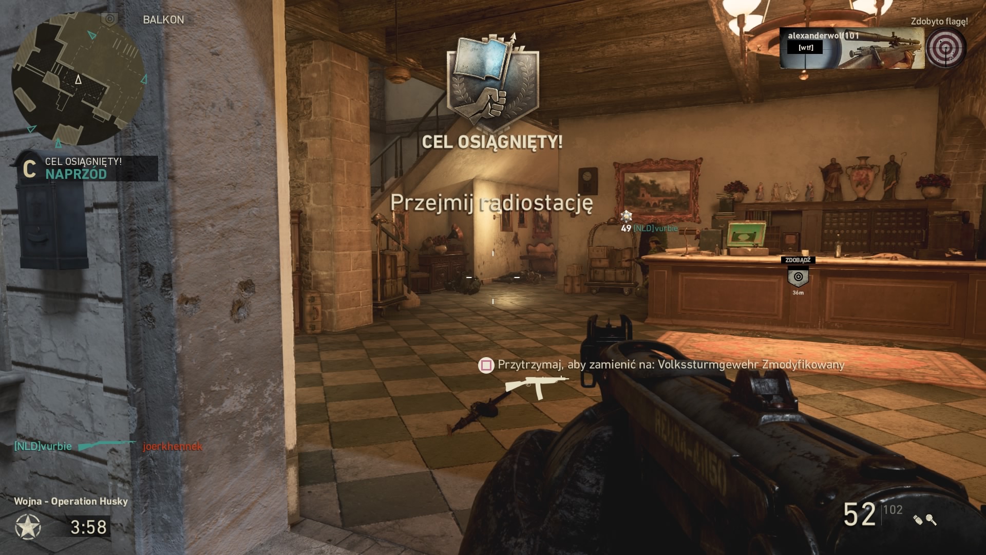 Recenzje The War Machine zacznę od nowej mapy do trybu wojna. Operacja Husky, czyli Alianci lądują na Sycylii. Drużyna atakująca musi wykraść trzy dokumenty z budynku strzeżonego przez Nazistów. Jeden dokument jest ukryty w piwnicy i dwa na parterze, dodatkowo obie strony otrzymują do dyspozycji na swoich respach w skrzynkach małe wsparcie. Dla Alintów są to koktajle Mołotowa, a drużyny broniącej mini pułapki z linkami, które mogą rozmieścić w przejściach. Zdobyty dokument Alianci muszą szybko dostarczyć do swojej bazy, gdy przyniosą trzy takie dokumenty, to rozgrywka przenosi się do kolejnego budynku – stacji radiowej. W tym miejscu strona atakująca trzymając się w pobliżu dużego nadajnika musi nadać komunikat o pozycjach wroga dla sojuszniczych samolotów. Gdy, to się uda, to pierwszy raz w historii Call of Duty strzelanie przenosi się w powietrze, zasiadamy za sterami samolotów z drugiej wojny światowej. O ile sam pomysł jest fajny i był dla mnie wielkim zaskoczeniem, ta sama bitwa jest… fatalna. Zacznijmy od sterowania, którego nie można zmienić. Nie rozumiem dlaczego, ale deweloper nie ustawił konfiguracji domyślnej dla samolotów, czyli jak wychylamy analog w dól (do siebie) to samolot leci do góry, tu niestety leci w dół przez co bardzo trudno było mi się poruszać w tej bitwie powietrznej. Drugi minus, to bardzo mały obszar, który przypomina akwarium dla złotej rybki i często na swoim ekranie widziałem komunikat, aby zawrócić, albo będzie boom. Granice mapy też nie są w żaden sposób określone, jedyne odniesienie, to mini mapa, na której trzeba unikać czerwonego pola. Trzeci minus, to całkowicie zbędne killstreaki. Gracz, który zdobędzie 200pkt może wezwać wsparcie artylerii przeciwlotniczej, a ta niszczy bardzo wielu graczy, więc wygrywa zazwyczaj drużyna, której gracz pierwszy odpali ten bonus.