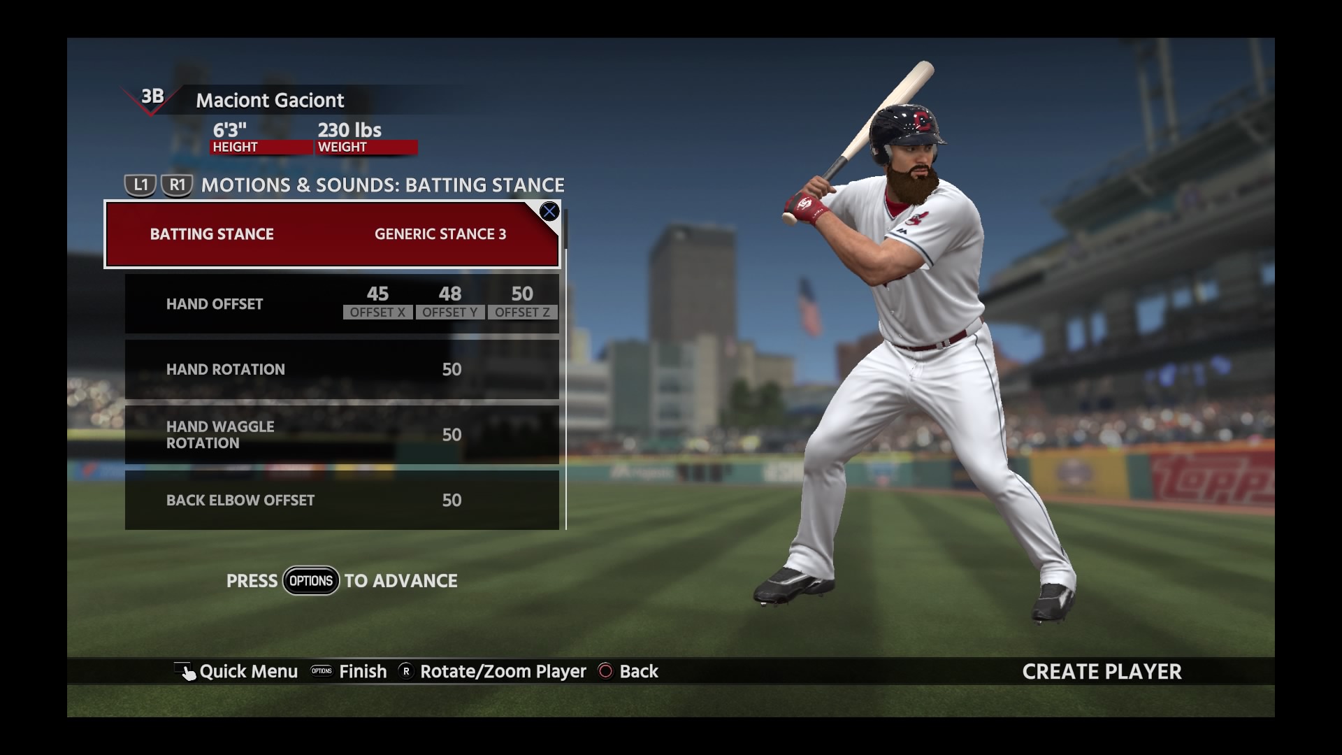 The Show to flagowy tryb serii, a zarazem zdecydowanie najlepszy element całej gry. Zaczynamy od stworzenia własnego zawodnika, gdzie poza standardowymi rzeczami jak imię, wygląd twarzy czy budowa ciała, ustalamy również czy miota lewą czy prawą ręką, uderza z lewej czy prawej strony, wybieramy animacje dla większości zagrań oraz, po raz pierwszy w serii, tworzymy własną animację uderzenia. Choć cała gra jest wypełniona smaczkami dla fanów baseballa, to właśnie tworzenie animacji uderzenia mnie urzekło, bo w sposób dobitny pokazuje przywiązanie twórców do szczegółów. Brane są pod uwagę m.in. rozstaw nóg, pozycja ud, sposób trzymania kija, typ zamachu, typ wykroku, domyślny kąt uderzenia, sposób poprowadzenia kija po uderzeniu i znacznie więcej składowych. Na koniec zaś zostawiono takie dodatki jak motyw muzyczny przy wejściu na boisko czy animacja po zdobyciu homeruna. Ważną zmianą w stosunku do poprzednich odsłon jest silne profilowanie zawodników – w zależności czy lepiej się czujemy w roli mięśniaka, który na boisku robi niewiele, ale jak trafi w piłkę to można jej szukać na parkingu pod stadionem, czy bardziej w roli szybkiego polowego, który będzie kradł bazy, określane są maksymalne wartości dla poszczególnych statystyk. Dlatego po wielu miesiącach gry nie będziemy mieli zawodnika z wartością 99 w każdej kategorii, co psuło przyjemność z gry w poprzednich latach.