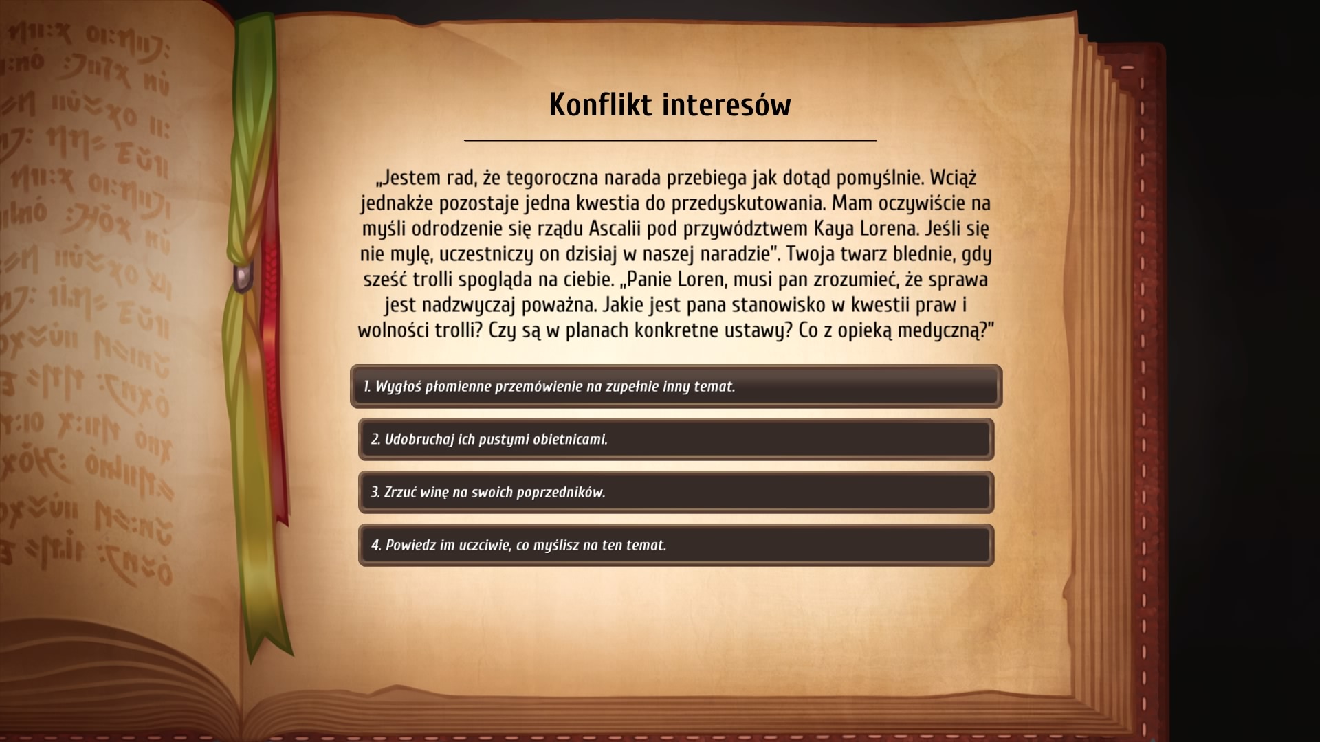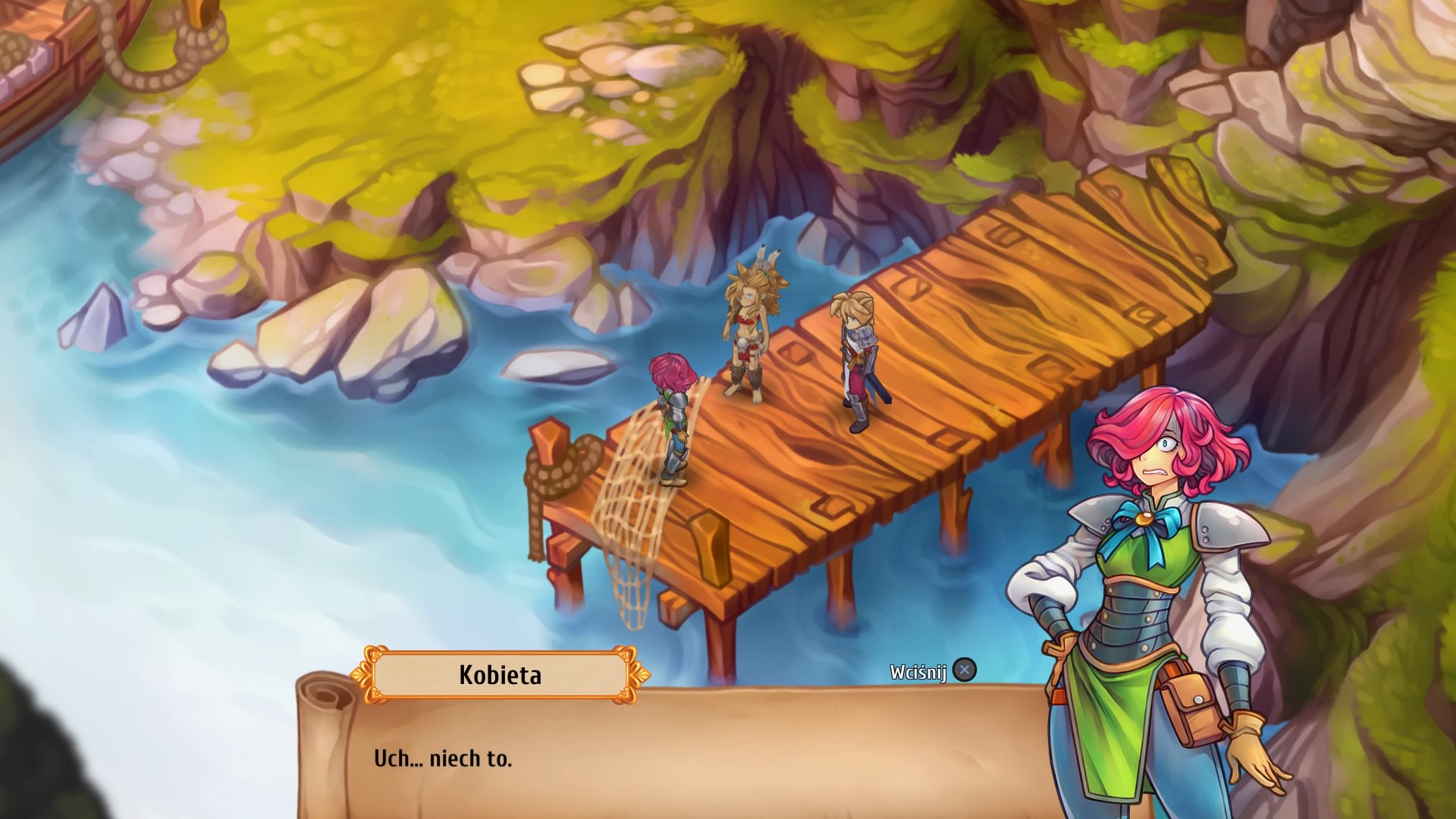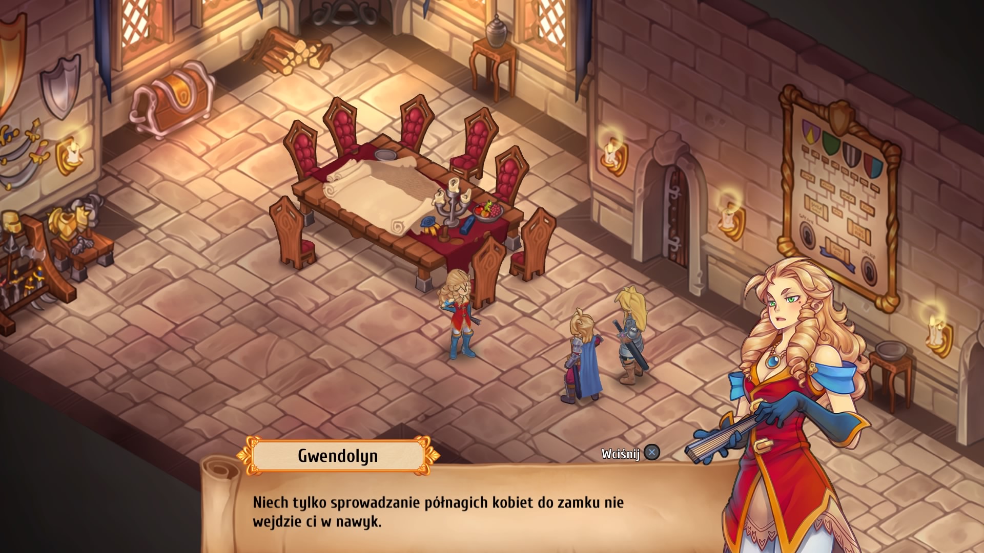 Bitwy prowadzimy w lochach, przed ich eksploracją zapoznajemy się z poziomem trudności oraz jakie są dostępne w nich pola, a te dzielą się na trzy rodzaje: Bitwa – wiadomo, trzeba walczyć, Obozowiska – to jedyne strefy swobodnego ruchu poza naszym zamkiem – i to także oprócz zamku jedyne miejsce, które umożliwia zapis gry. W obozowisku możemy także ożywić poległych w czasie walki bohaterów. Trzecim polem jest pole przygody, które po prostu uwielbiam i każde kolejne pochłaniałem jak bocian żabę. Pole przygody, to zadania tekstowe, w których opowiadana jest na krótka historyjka, w której tylko główny bohater Kay bierze udział, a naszym zadaniem jest wybranie odpowiedniego ruchu lub odpowiedzi. Wybory gracza mogą prowadzić do walki, wielkiej nagrody, możesz odejść z niczym, albo rozpocząć sobie misje poboczną w innym lochu. Musicie uwierzyć mi na słowo, że tekstowe przygody są przygotowane po prostu fantastycznie, aż szkoda przybliżać z nich jakieś spoilery.