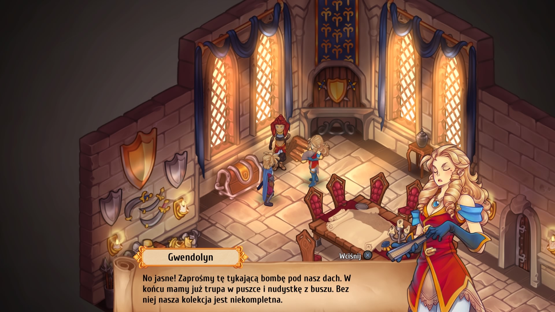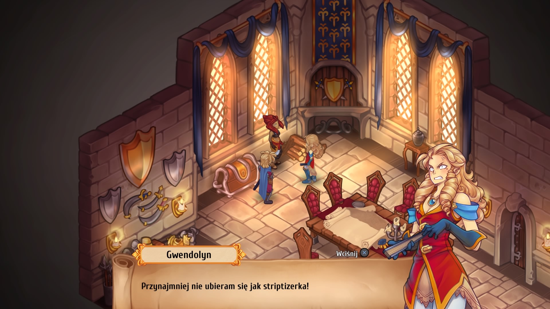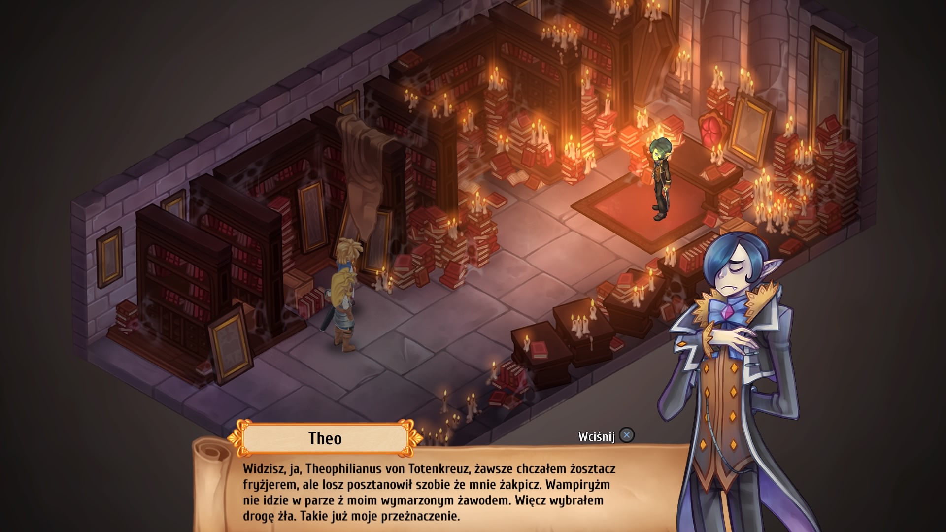 Regalia – Royal Edition, to gra naszpikowana humorem w każdym calu. Bohaterowie często sobie dogryzają w zabawny sposób, a nad ich głowami ukazują się okazjonalne emotki, które prezentują ich stan emocjonalny. Także sojusznicy, którzy dołączają do naszej drużyny potrafią rozbawić już od samego początku, np. wampir Theo, który marzy o zostaniu fryzjerem. Weźmy pod uwagę jego niechęć do luster i pociąg do odsłoniętych szyi, to raczej nie może się udać. Taki przykładów jest wiele, a ja nie pamiętam kiedy tak często uśmiechałem się do telewizora z padem w dłoniach. Naszymi przeciwnikami mogą być nawet samurajowie, zombie i krasnoludy, co oni tutaj robią zapytacie? Przygotowanie gry z humorkiem, to dla wielu deweloperów ogromne wyzwanie, jednak scenarzyści z Pixelated Milk dali rade, nie było momentu, abym chociaż przez chwile poczuł się zmęczony rzucanymi we mnie żartami lub uznał je za słabe. Tutaj najeży docenić także fantastyczną prace aktorów dubbingowych – nie ma niestety polskich głosów, ale te angielskie brzmią po prostu fantastycznie, to najwyższa półka voice actingu w grach wideo!