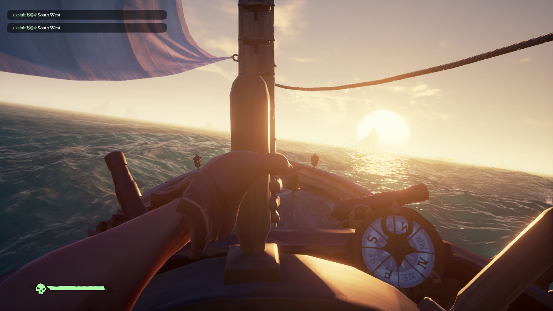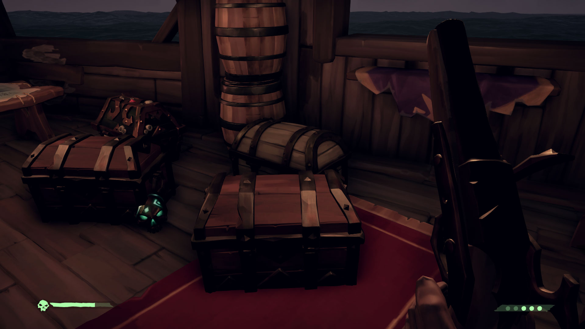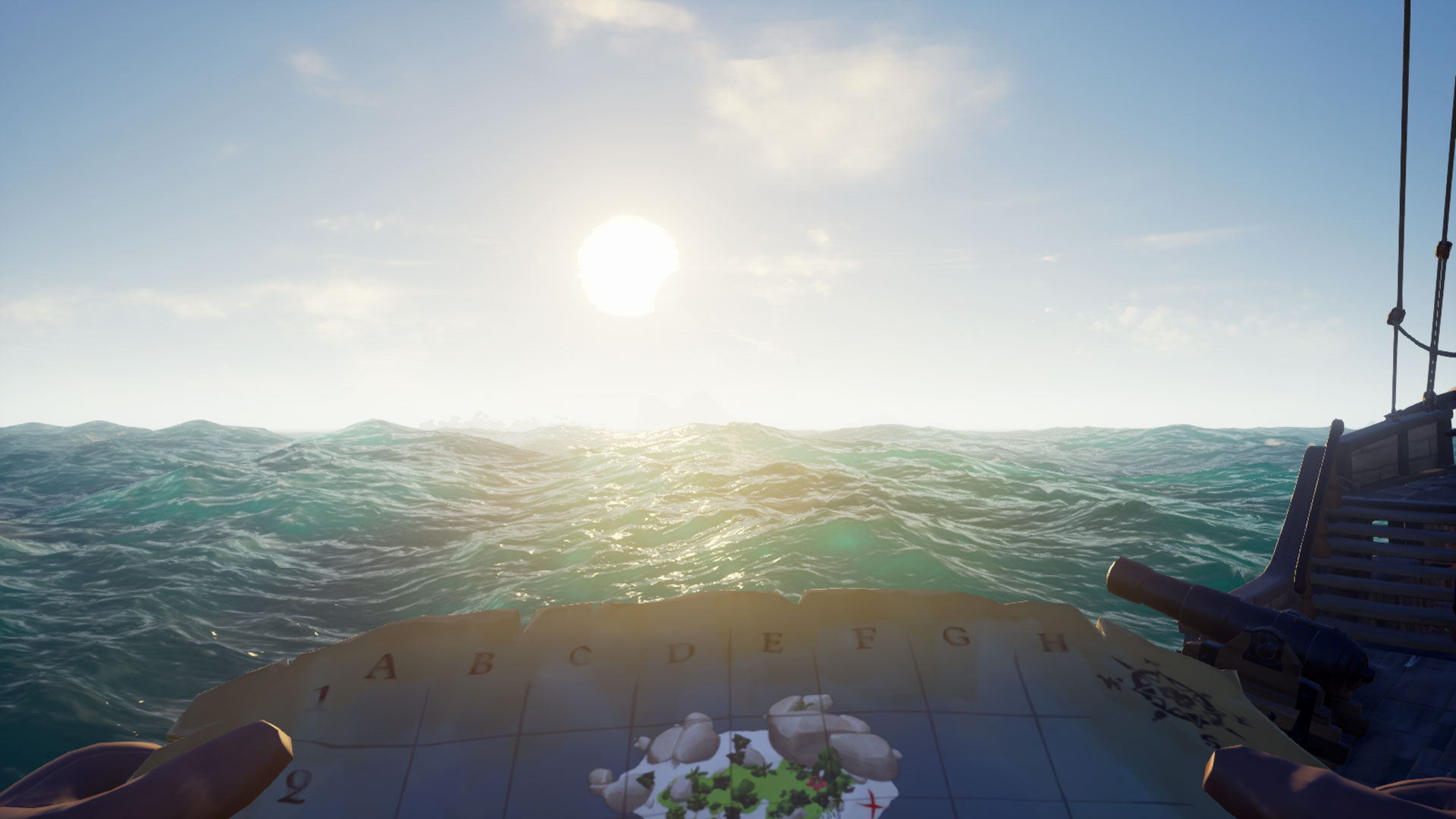 Twórcy gry postawili na niewidoczny interfejs, co, moim zdaniem, było dobrym wyborem. Przez większość gry jedynym, co zobaczymy, jest nasz pasek życia i ilość kul w broni po jej wybraniu. Do nawigacji po świecie mamy dostępne kompasy, które stanowią część ekwipunku każdego pirata i są wbudowane (obok steru) na naszym statku. Jedyna mapa świata jaka jest dostępna, to ta znajdująca się w kajucie kapitana.